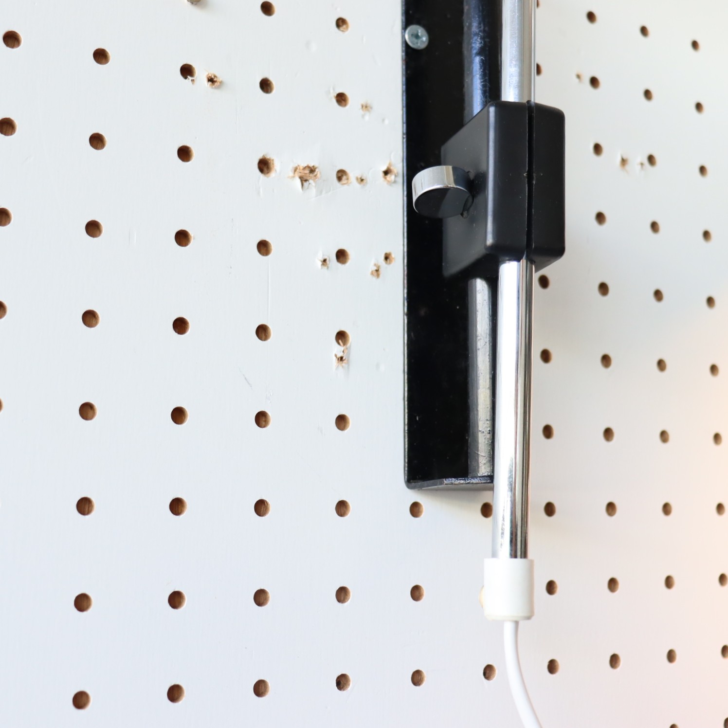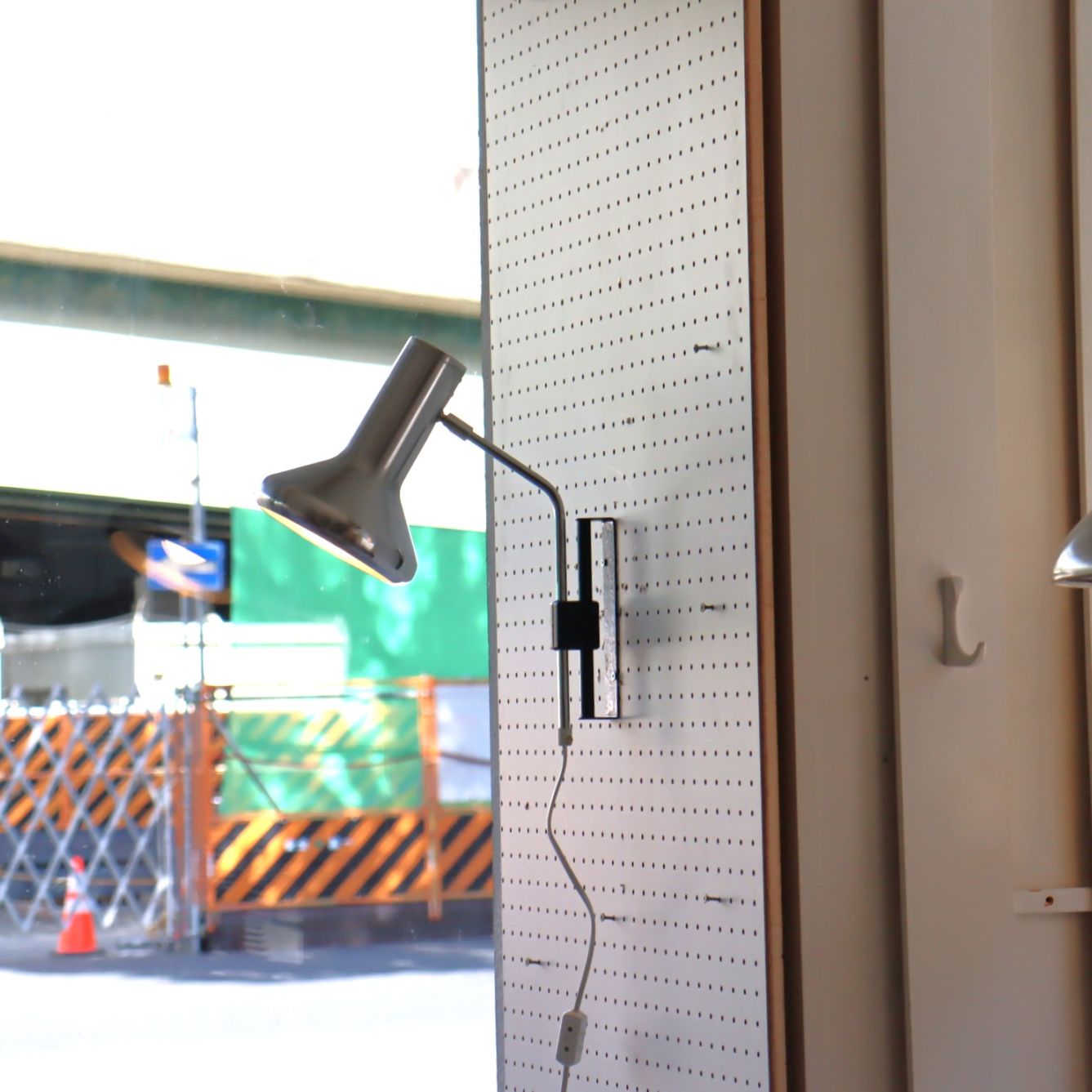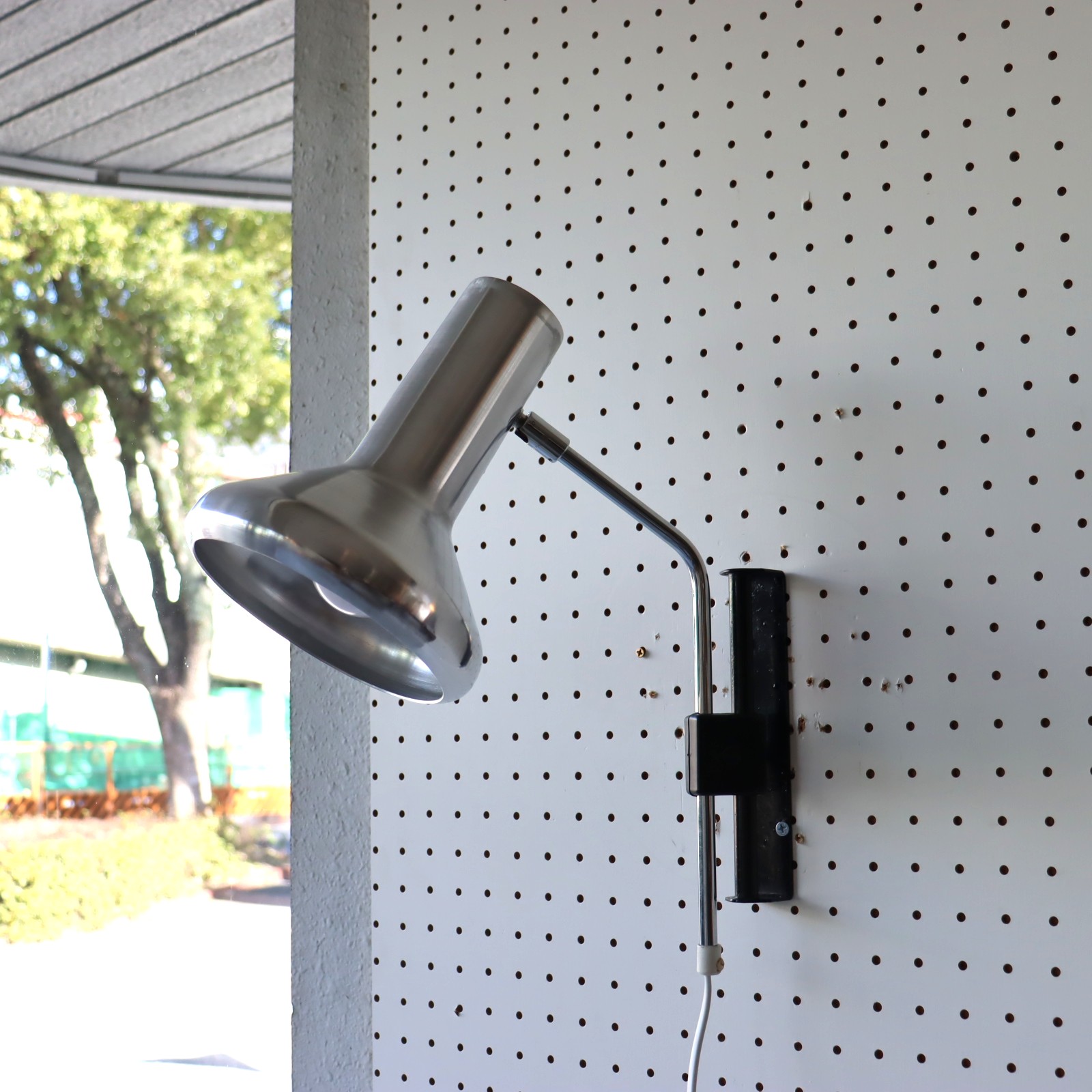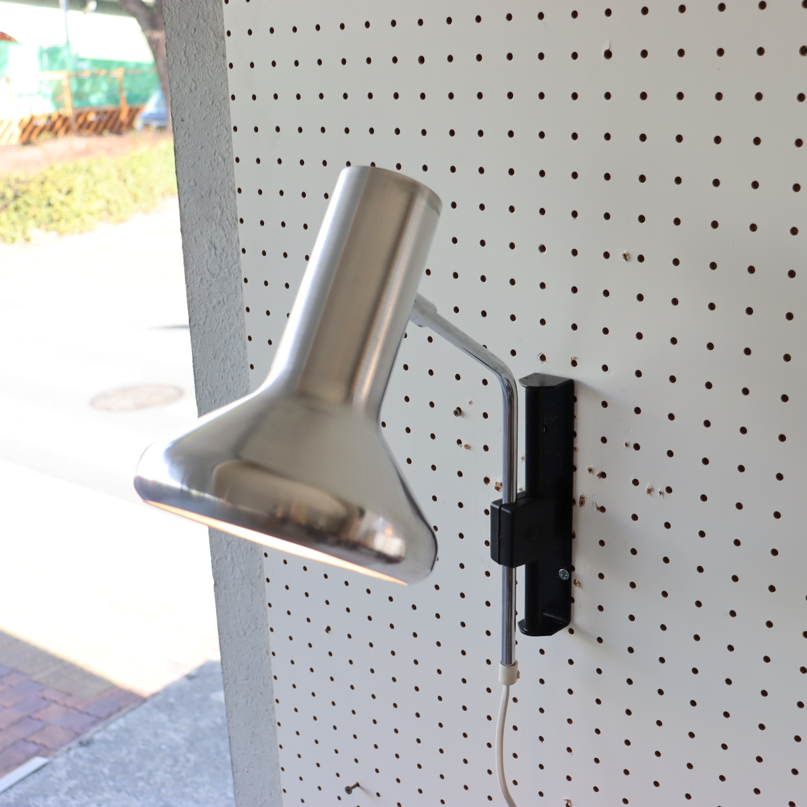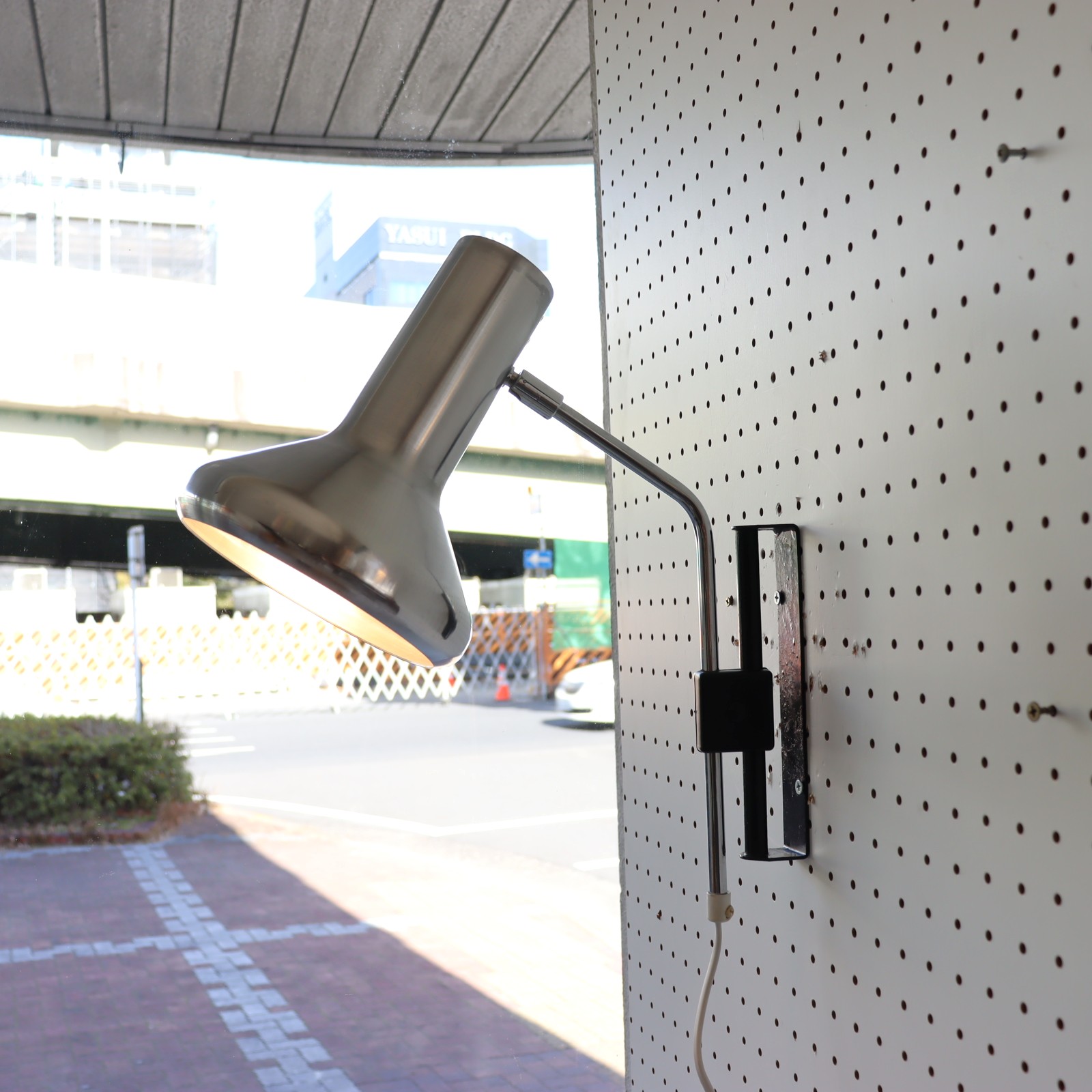 スポットシェードの壁掛けの照明。シェードのスチールの質感が艶やかで、シンプルながら無骨な雰囲気は存在感があります。