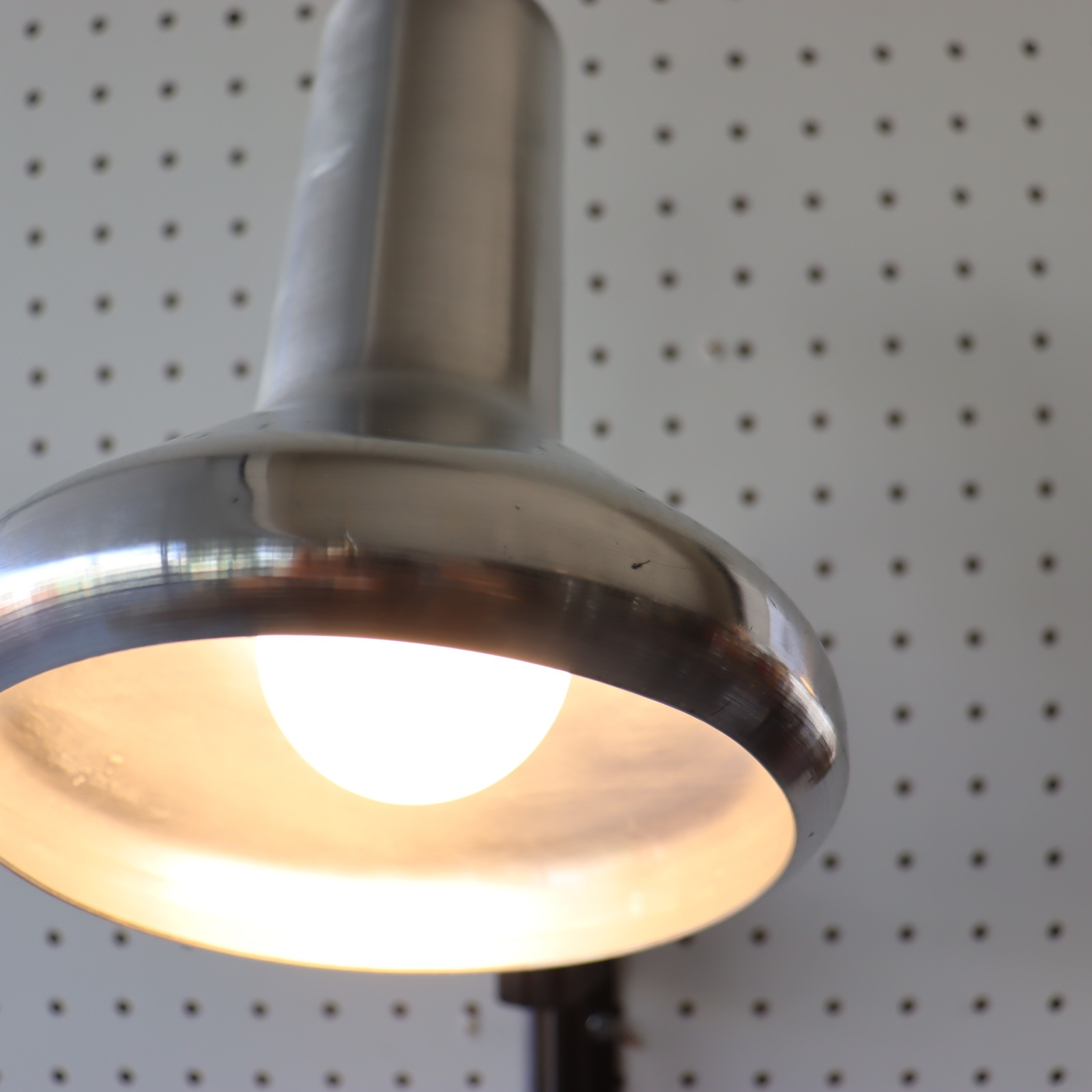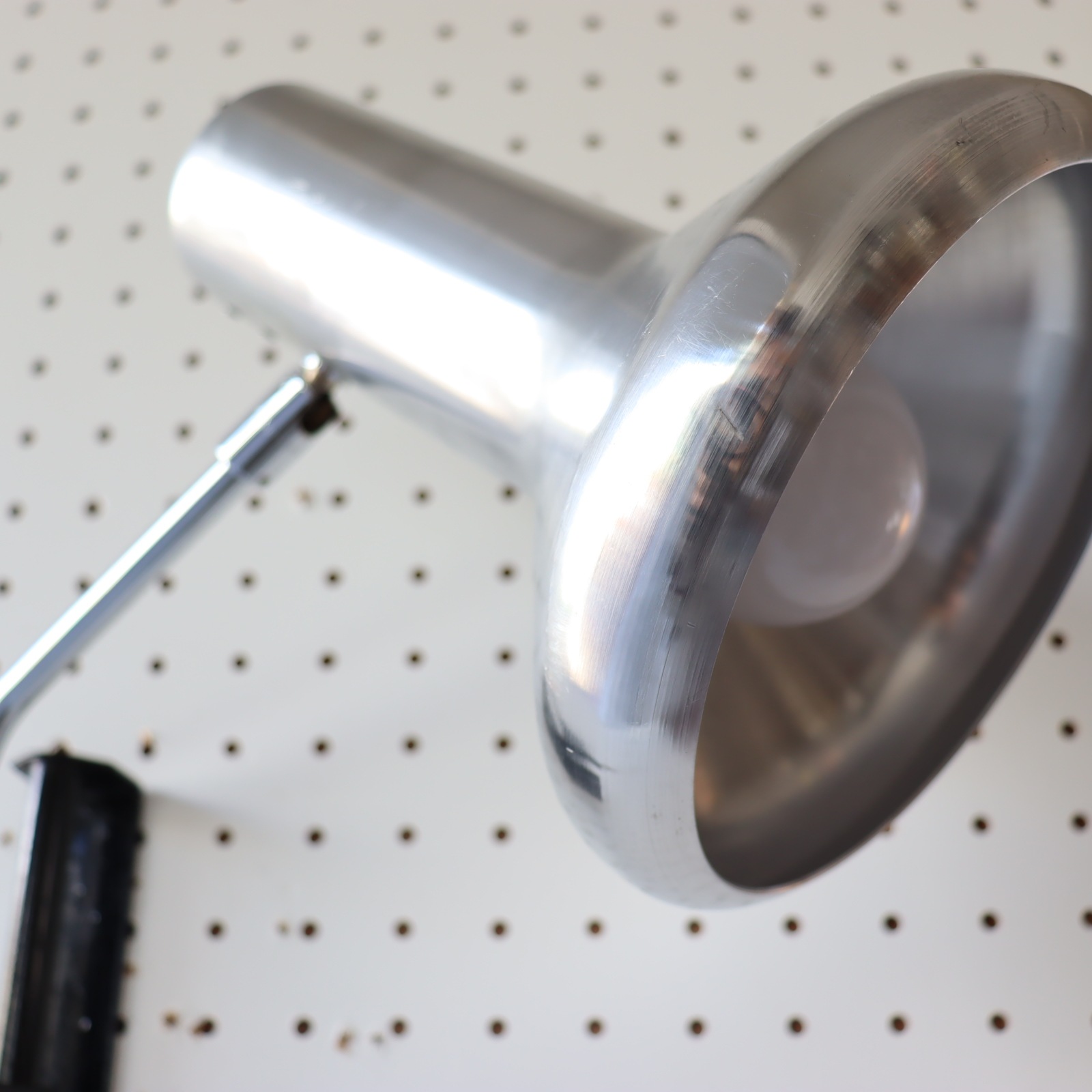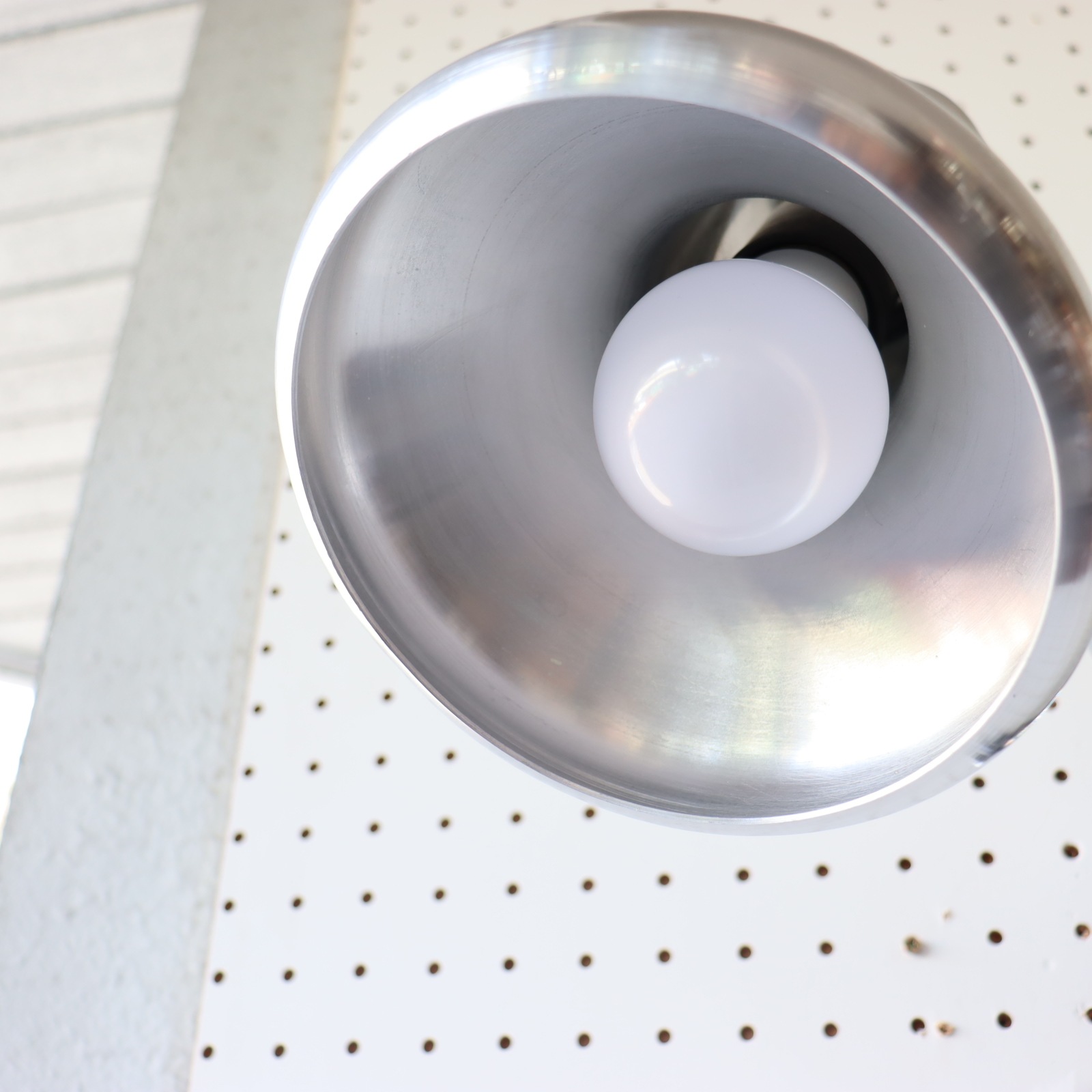シェードの縁は内側に丸まっており、丸みのあるフォルムが素敵です。支柱は180度左右に可動。ネックも90°下に傾くの使い方の幅が広がりますね。