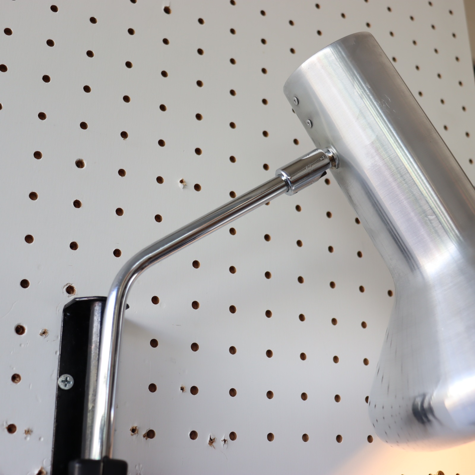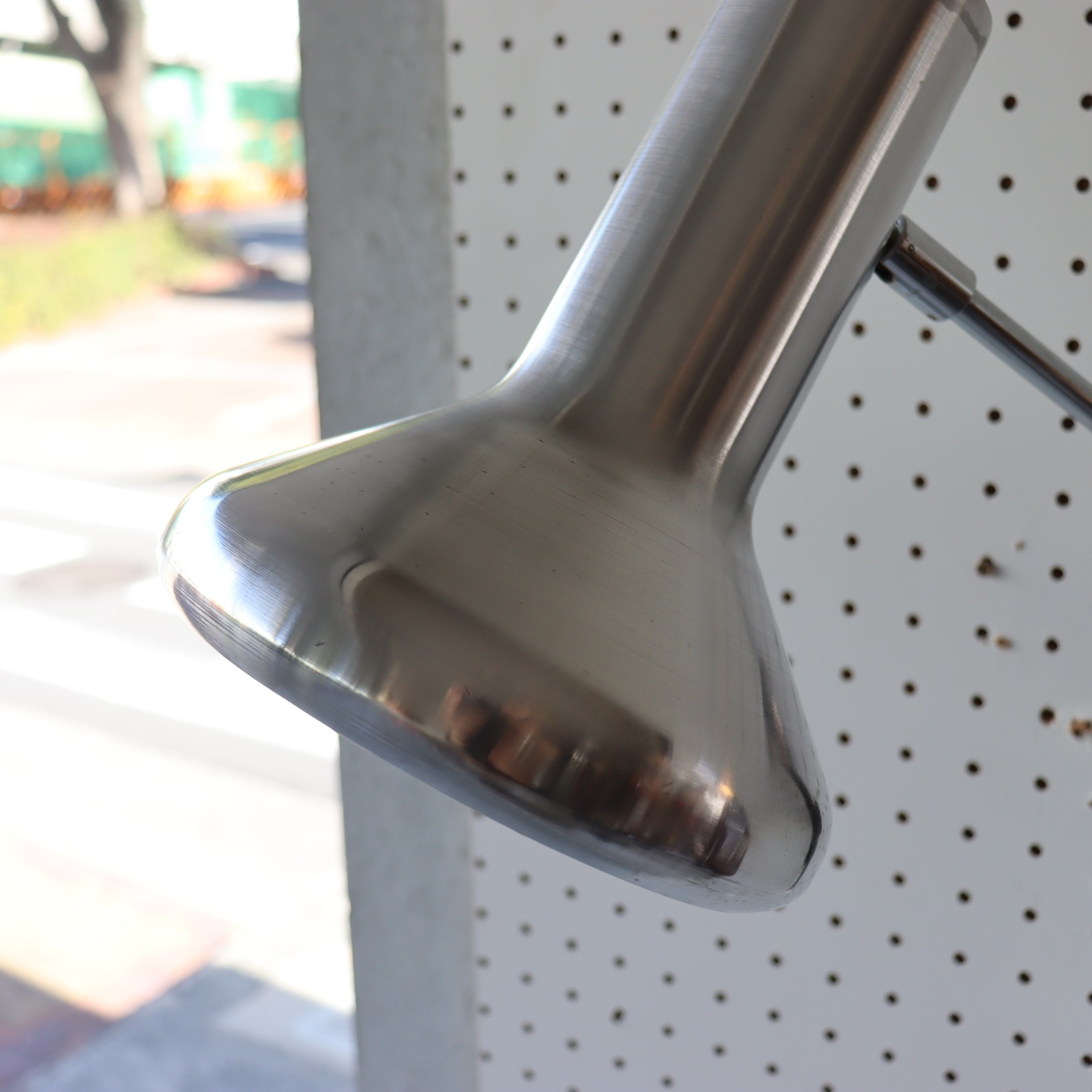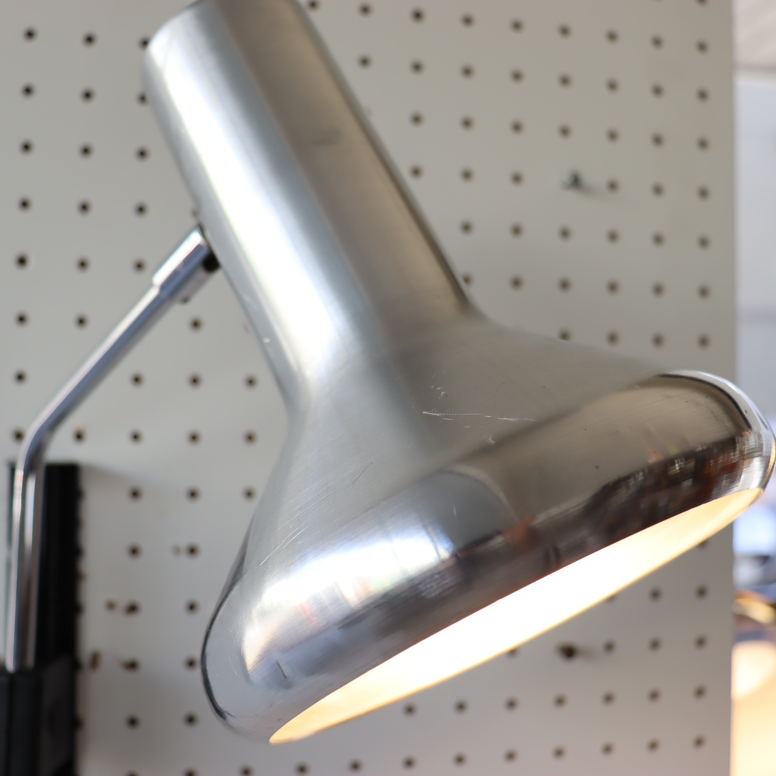 シェードの縁は内側に丸まっており、丸みのあるフォルムが素敵です。支柱は180度左右に可動。ネックも90°下に傾くの使い方の幅が広がりますね。