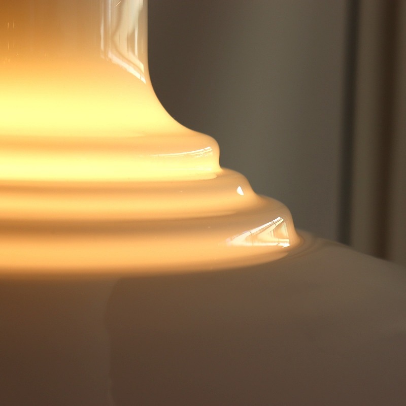 オパールホワイトのガラスシェードは電球の灯りを優しく空間へ漏らし、神殿の彫刻のようなシェードの凹凸は明るさの濃淡の表情を見せてくれます。