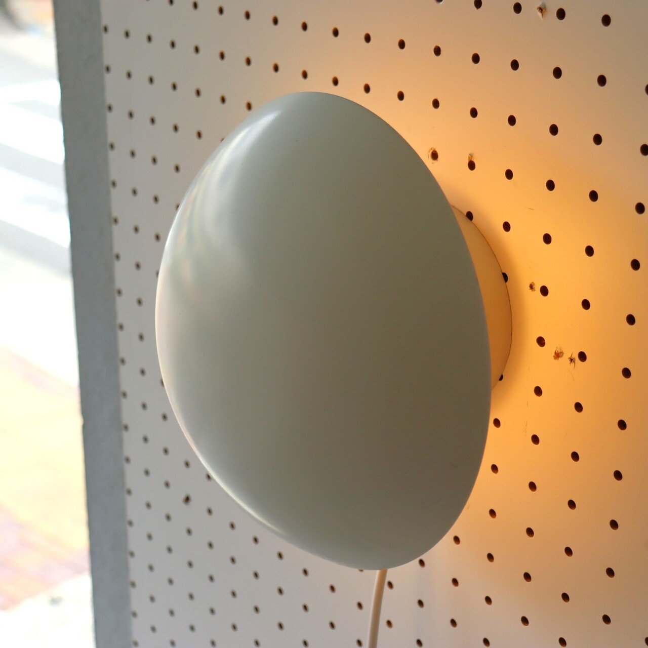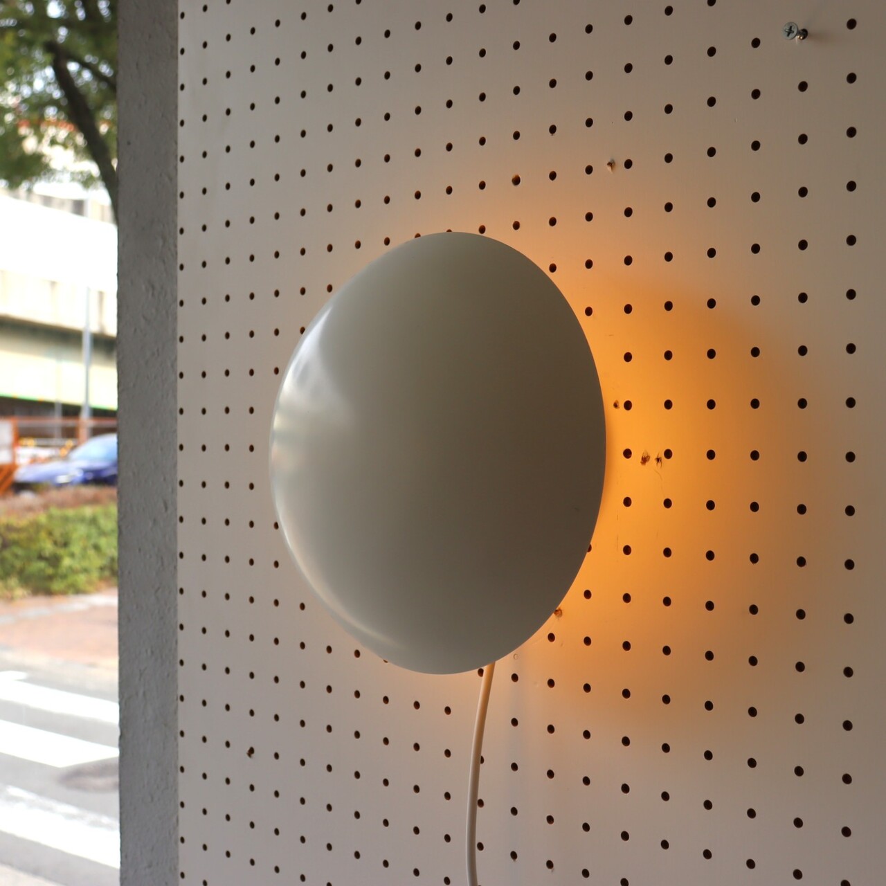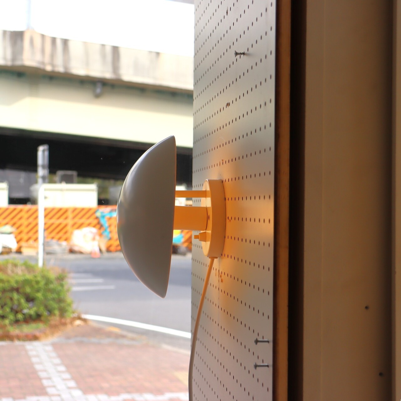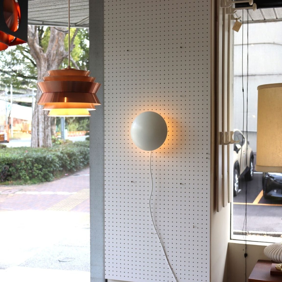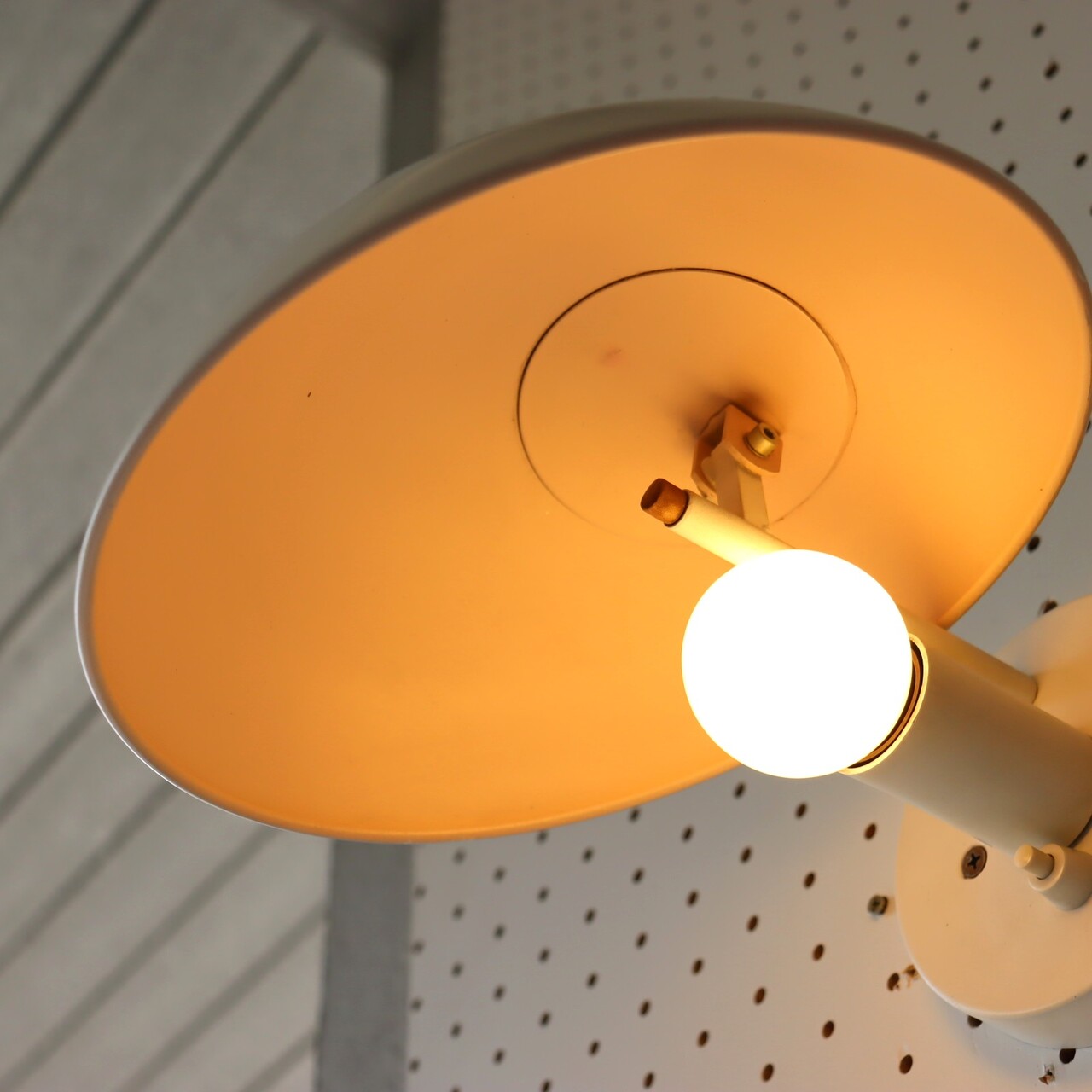 シェードはオフホワイトのマットな質感でつるっとした丸いかたち。電球の光がシェードに当たり柔らかな光が壁に投影されます。シェードは可動し、隙間が広く開き光の具合を調節できます。