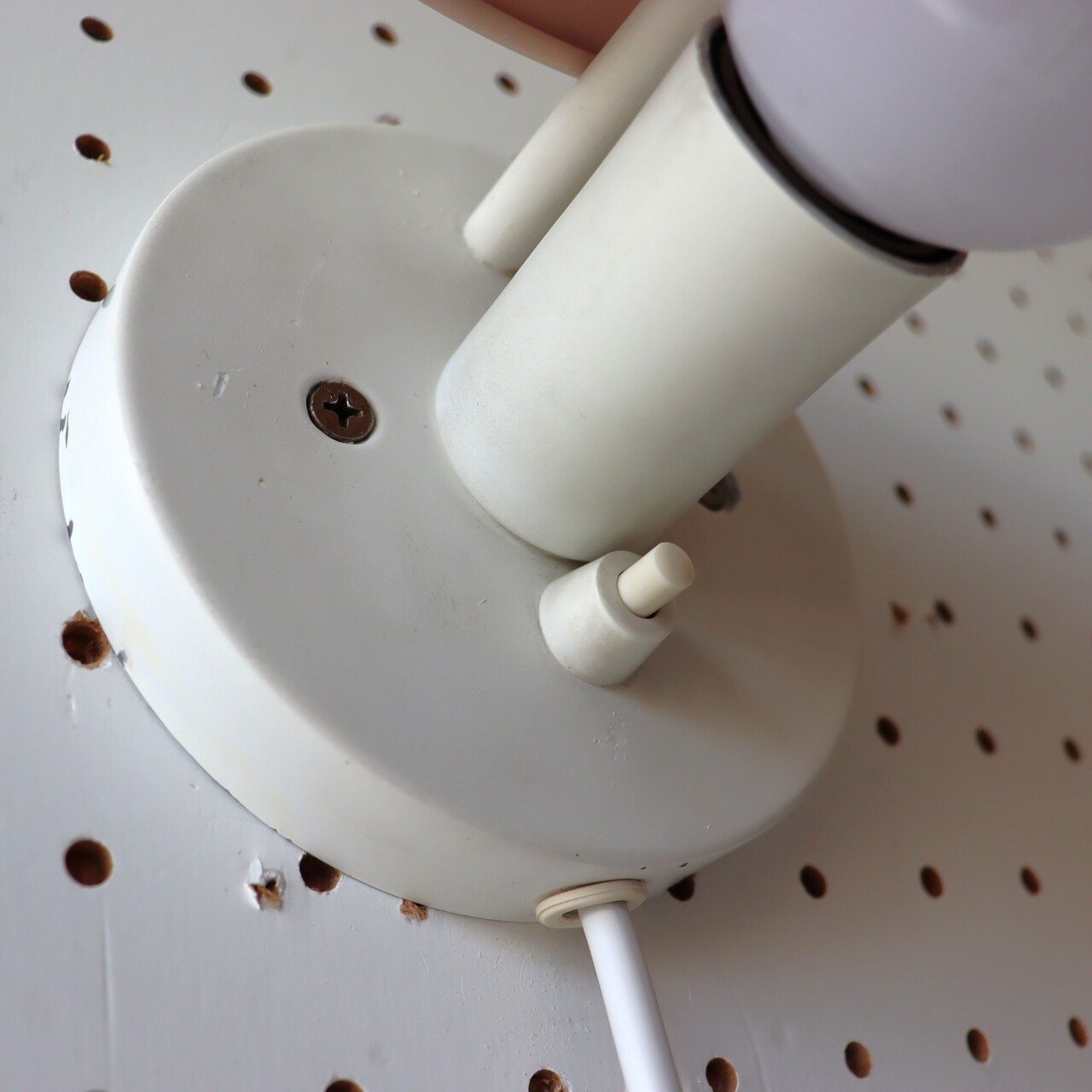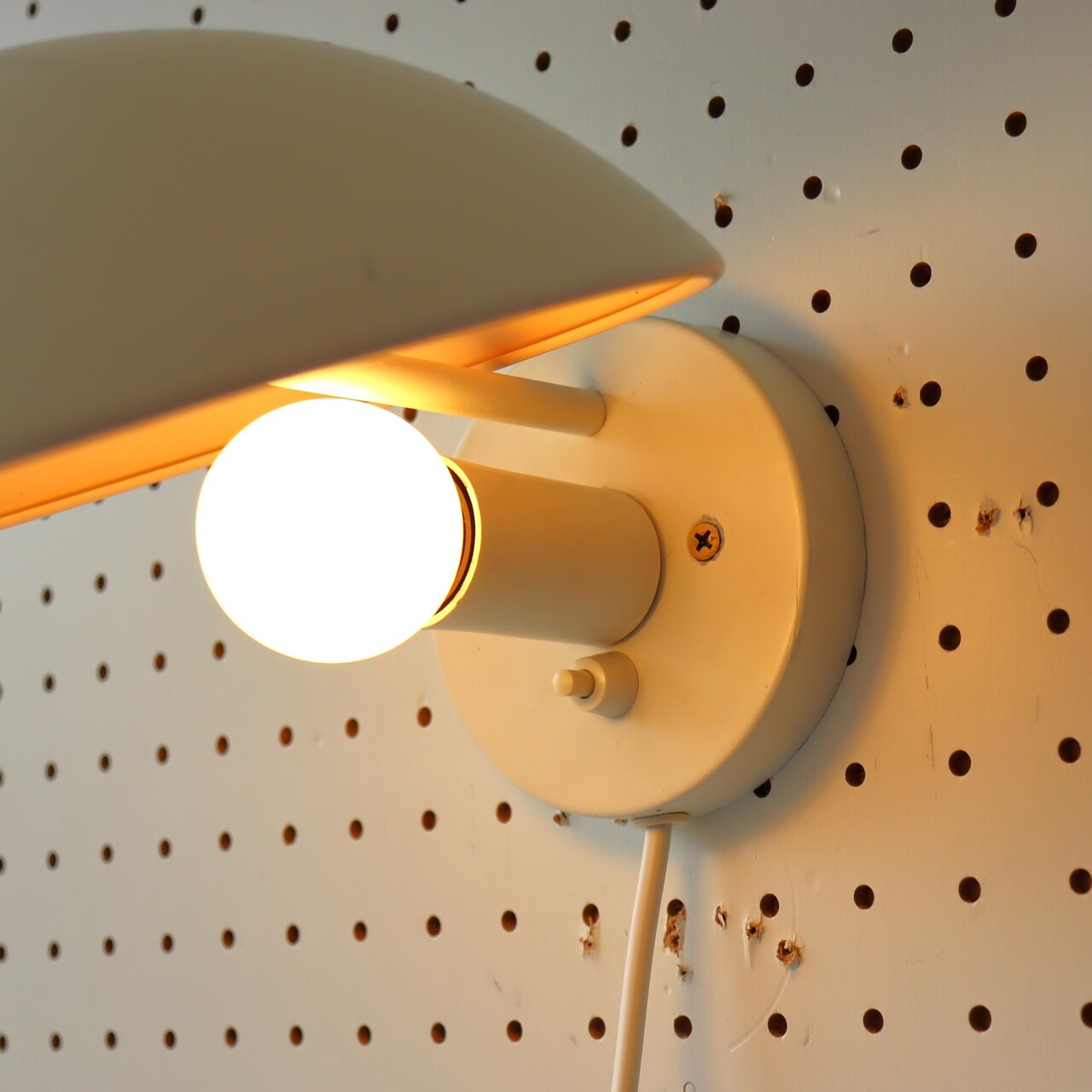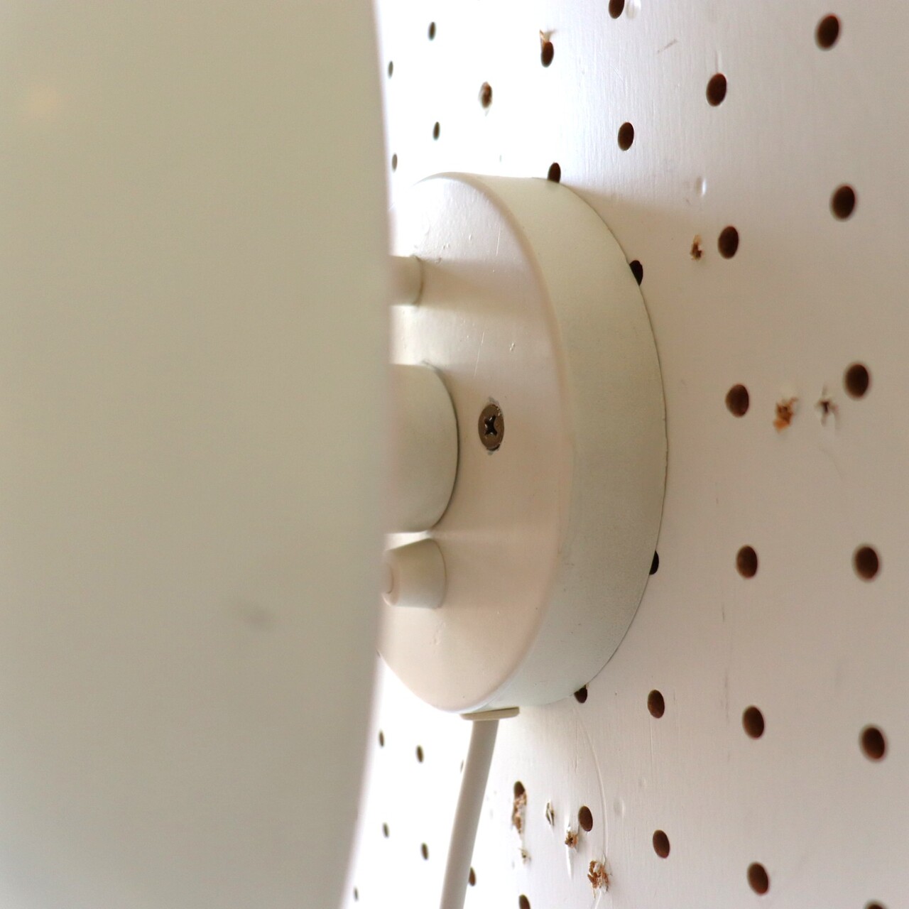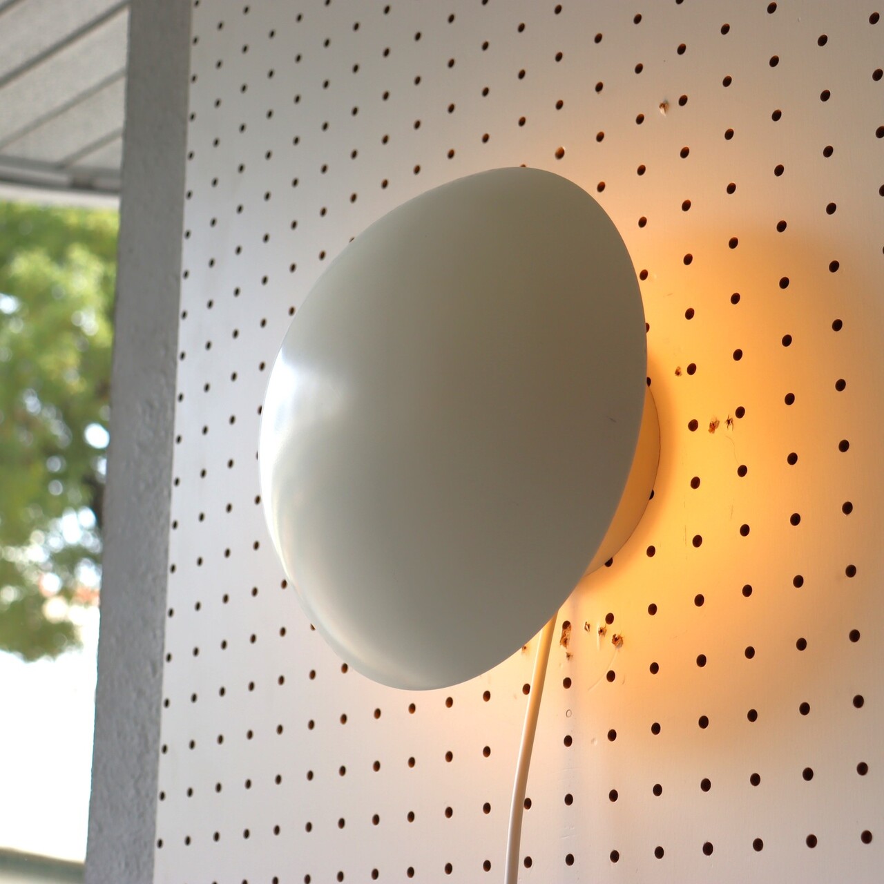 シェードはオフホワイトのマットな質感でつるっとした丸いかたち。電球の光がシェードに当たり柔らかな光が壁に投影されます。シェードは可動し、隙間が広く開き光の具合を調節できます。