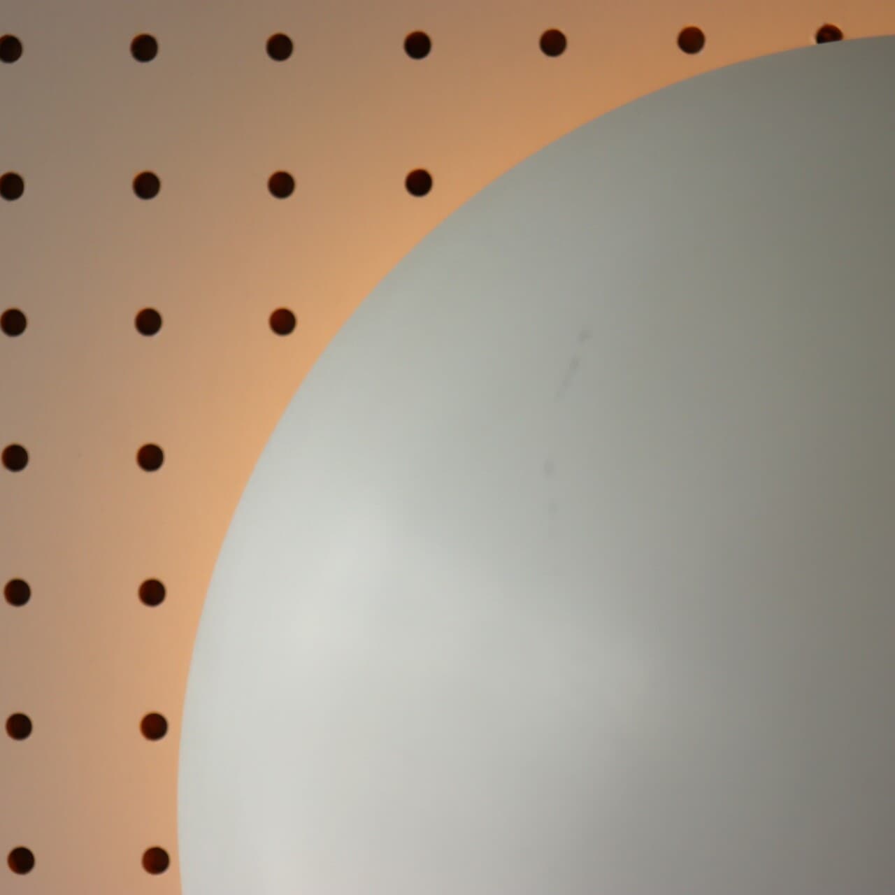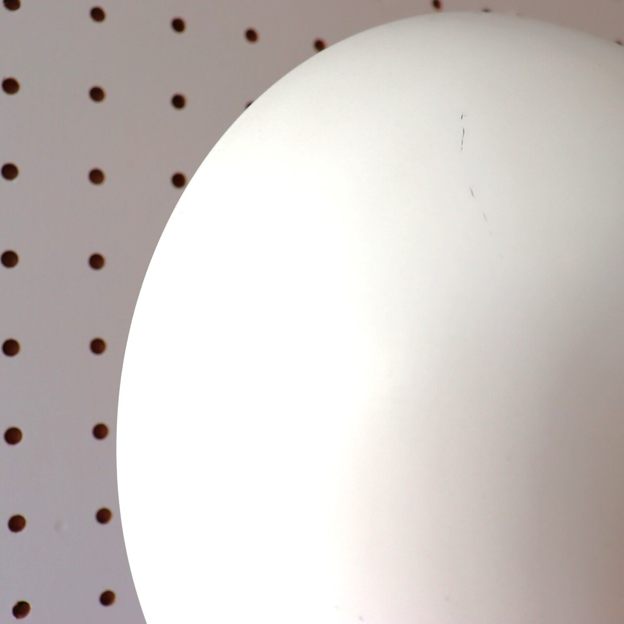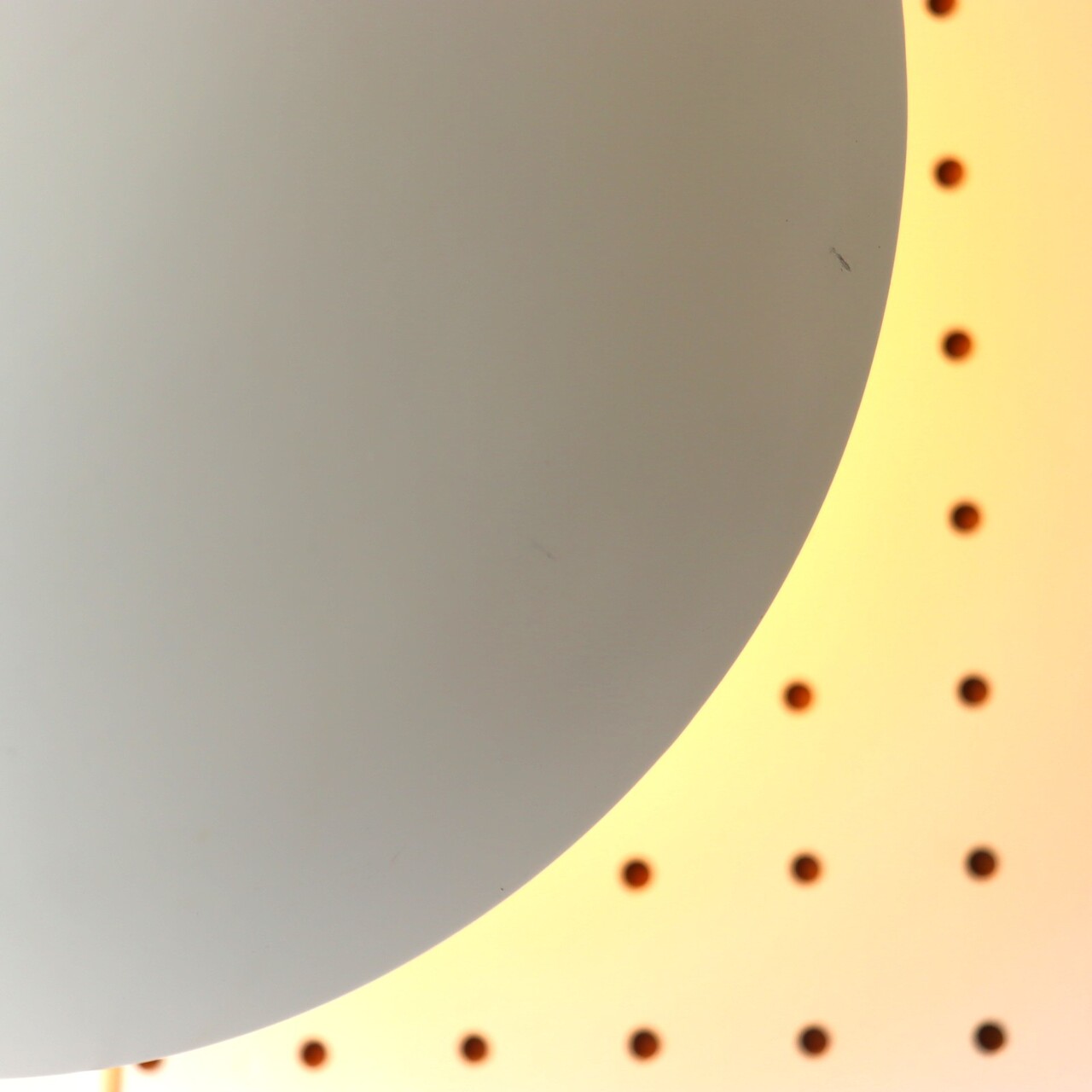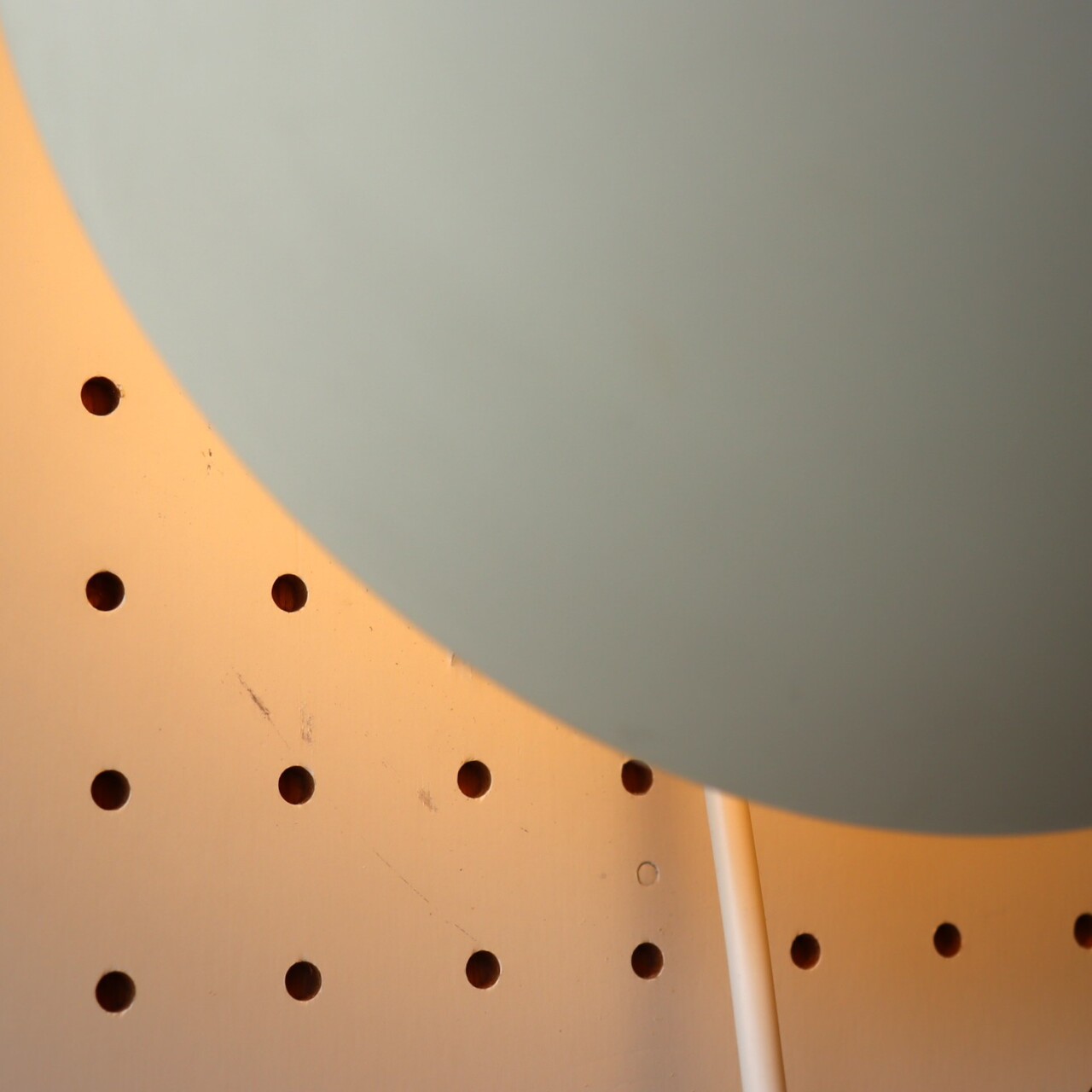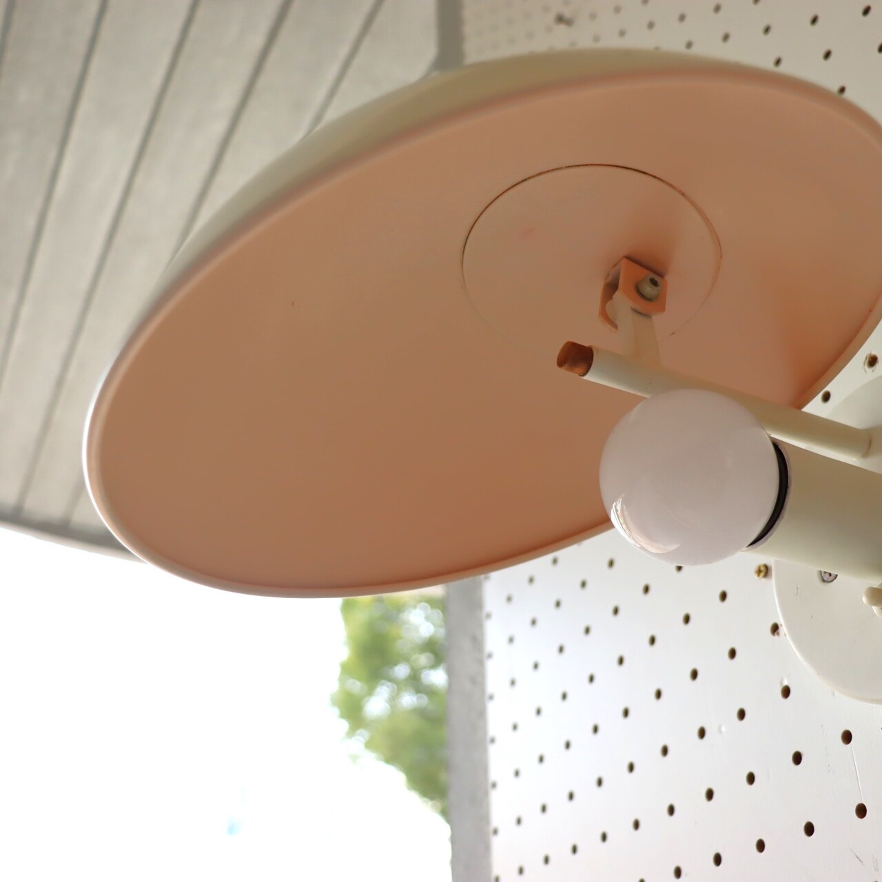 シェードはオフホワイトのマットな質感でつるっとした丸いかたち。電球の光がシェードに当たり柔らかな光が壁に投影されます。シェードは可動し、隙間が広く開き光の具合を調節できます。