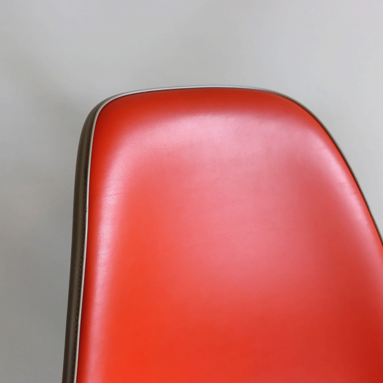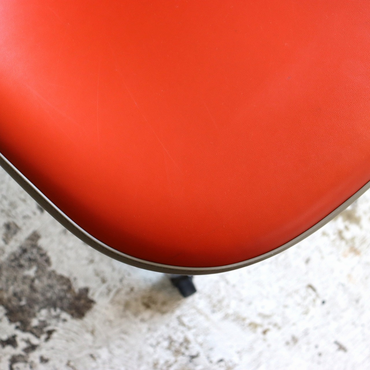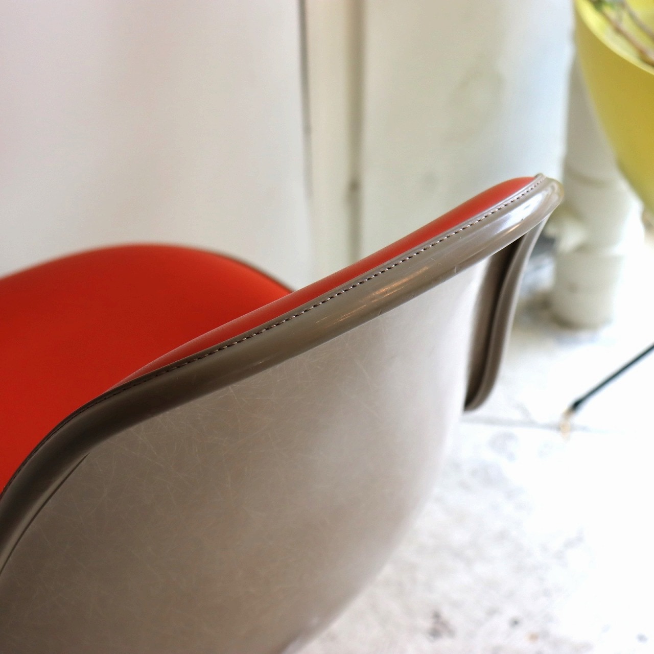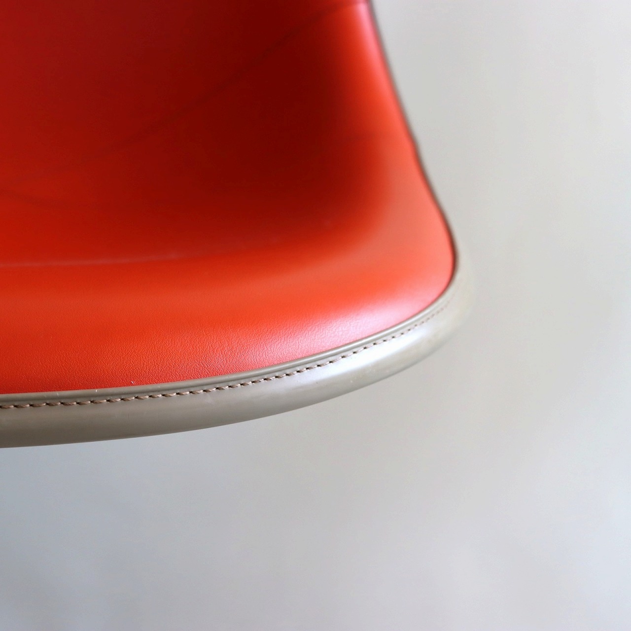 ハーマンミラー社製サイドシェルチェア。チャールズ・イームズデザインのビンテージチェア。オレンジのナウガハイドレザー、ナローマウント、背面グレーのFRPです。