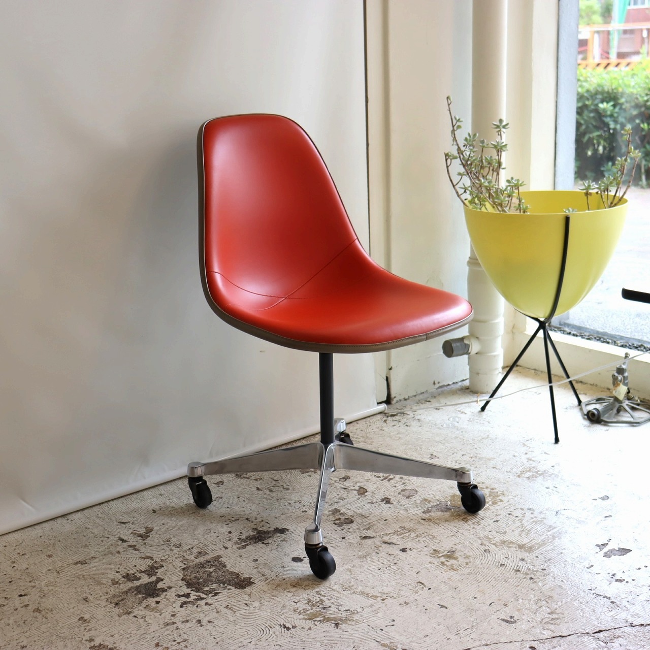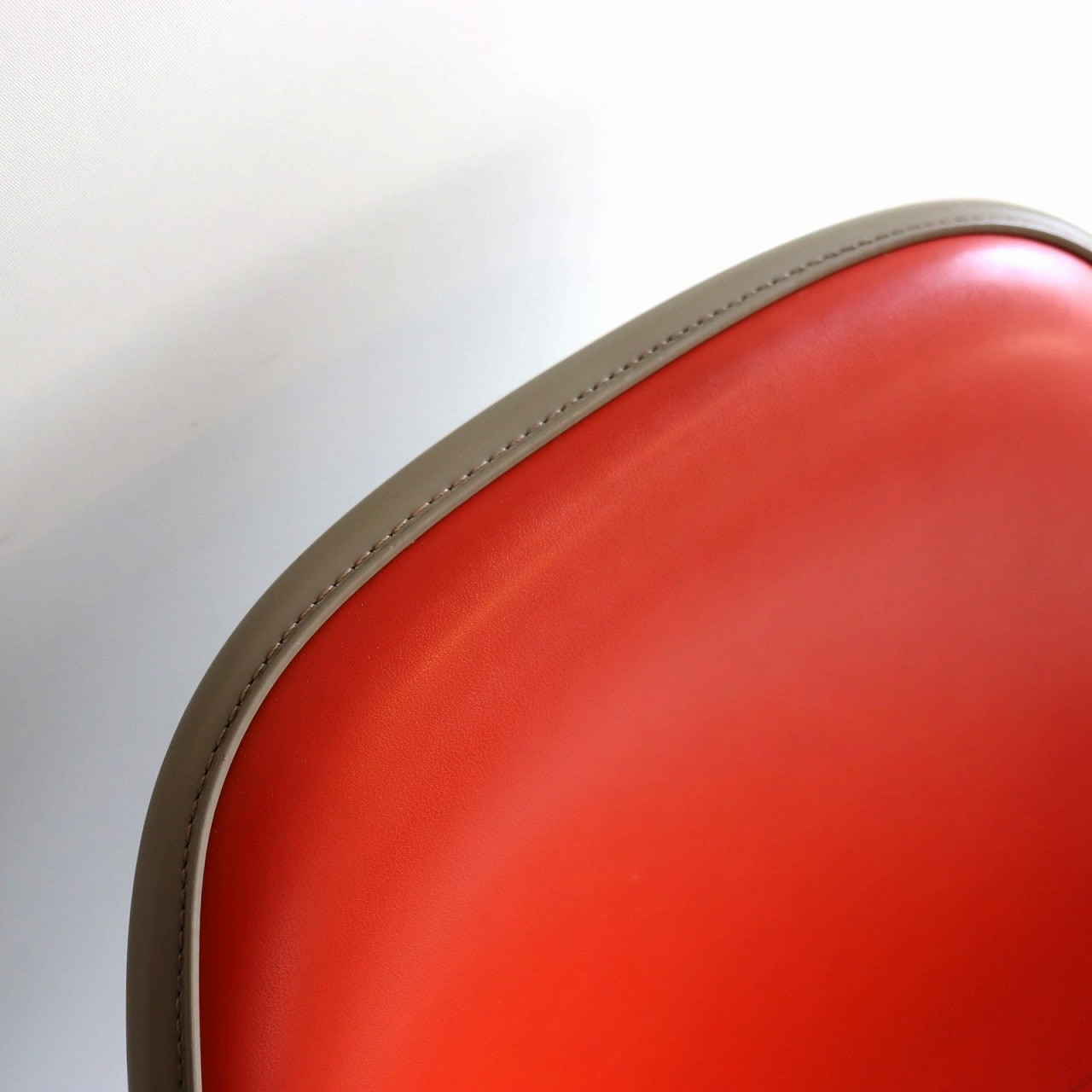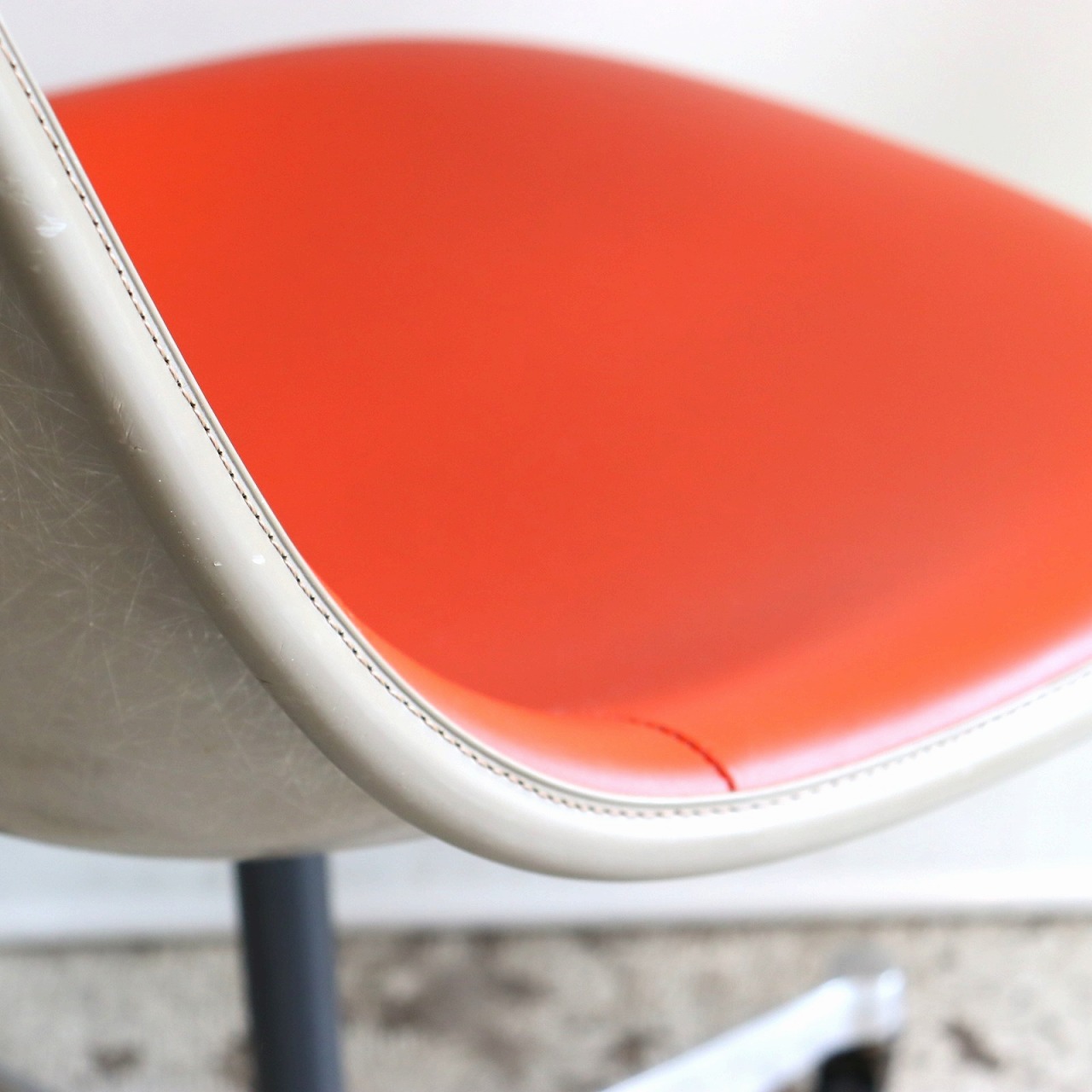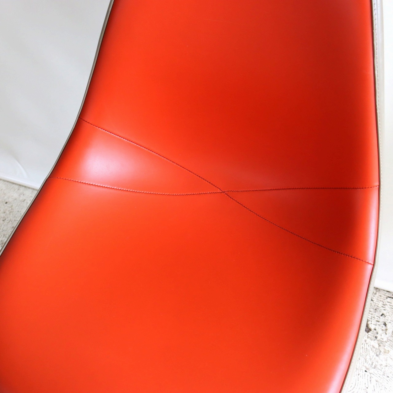 ハーマンミラー社製サイドシェルチェア。チャールズ・イームズデザインのビンテージチェア。オレンジのナウガハイドレザー、ナローマウント、背面グレーのFRPです。