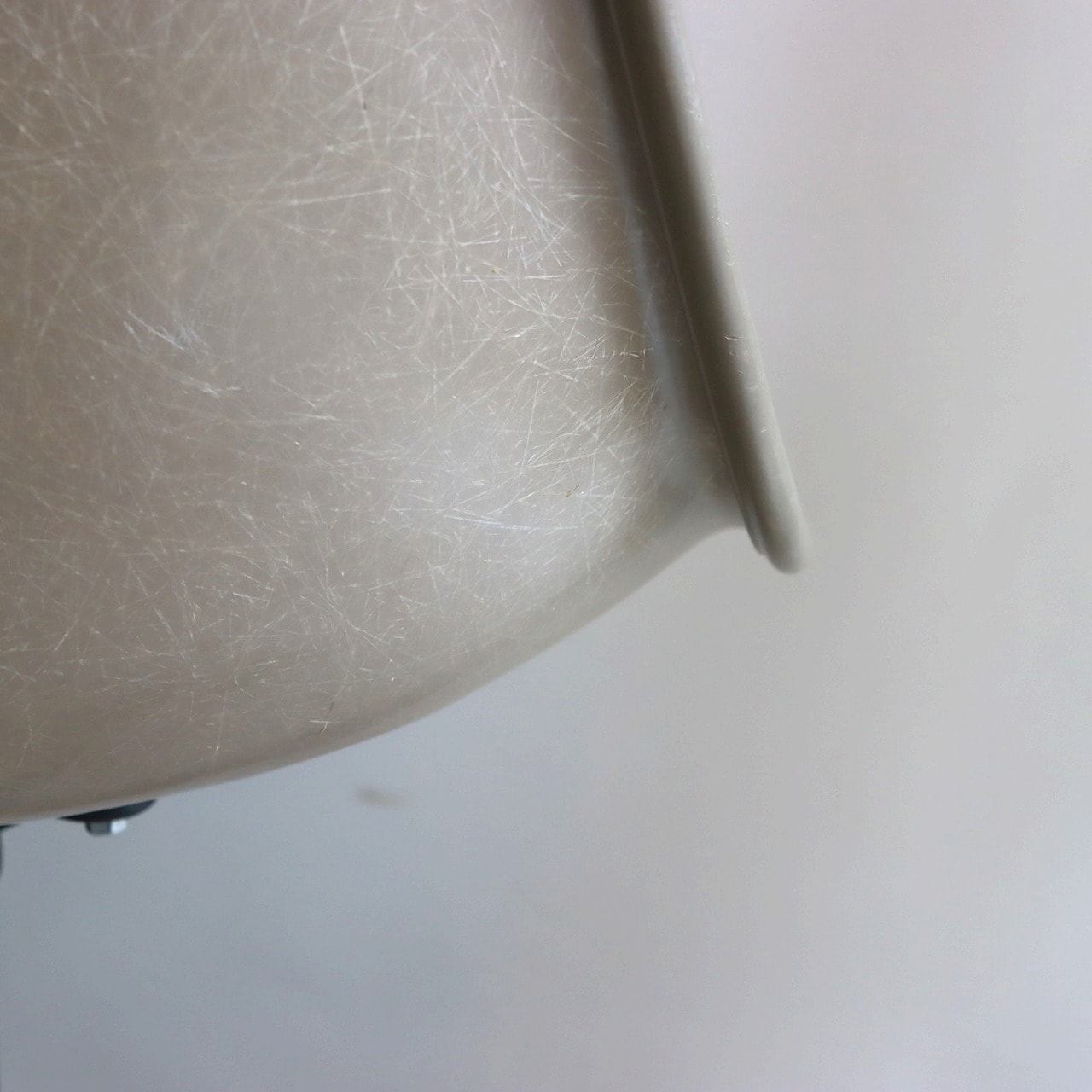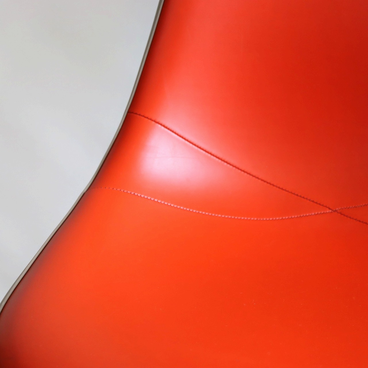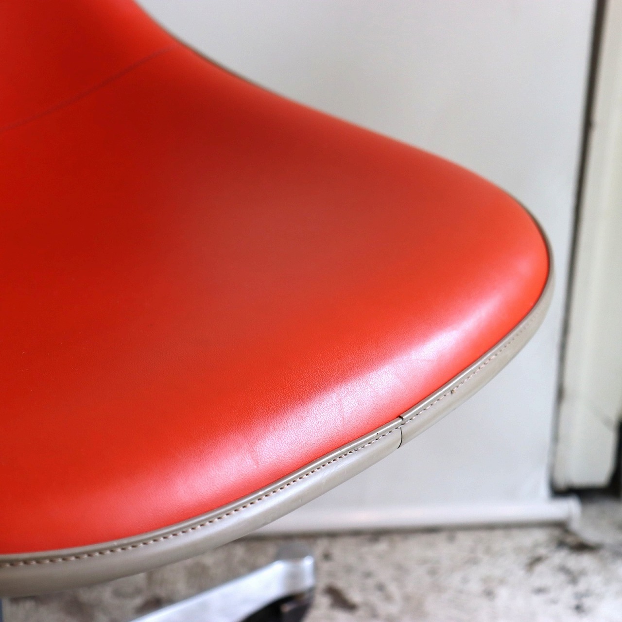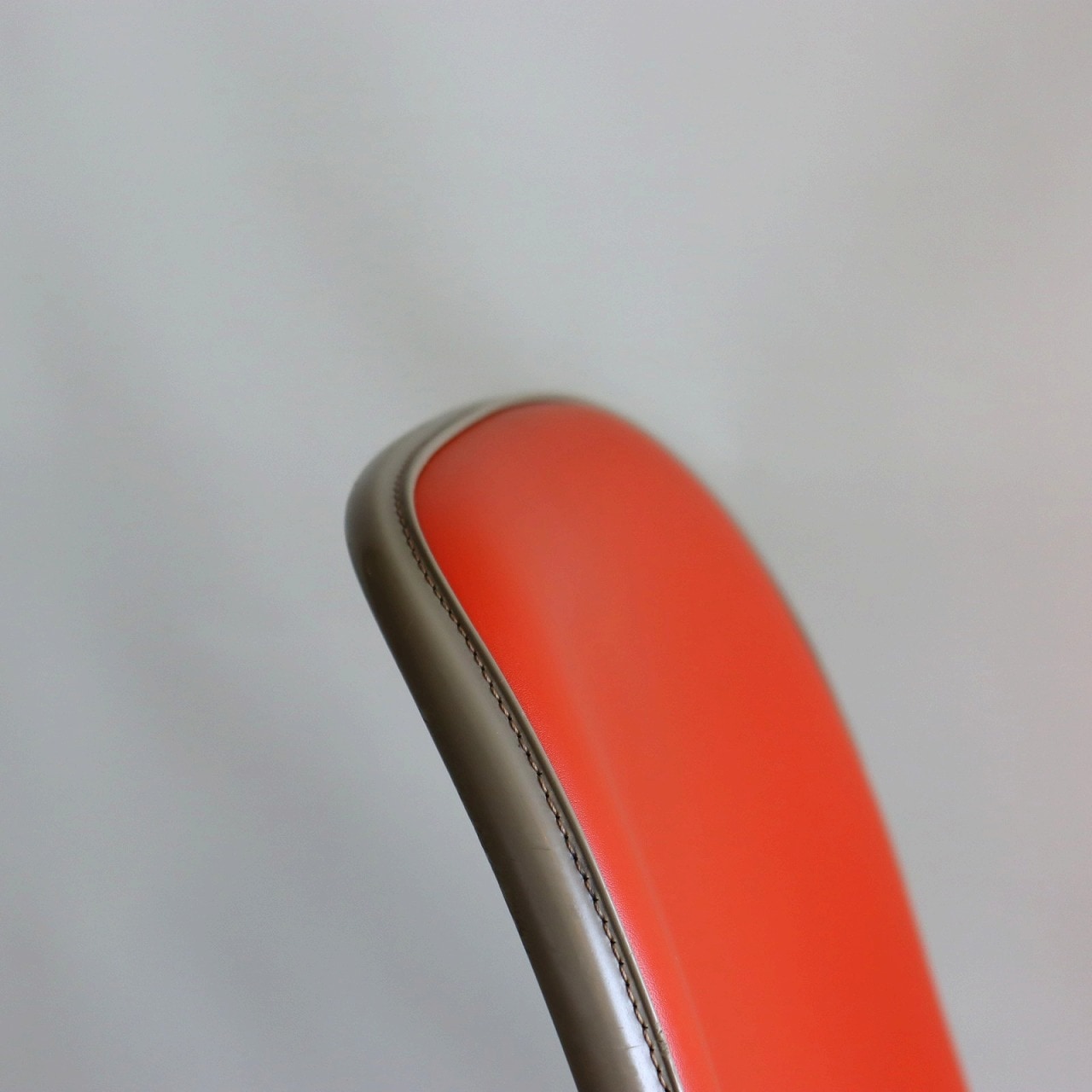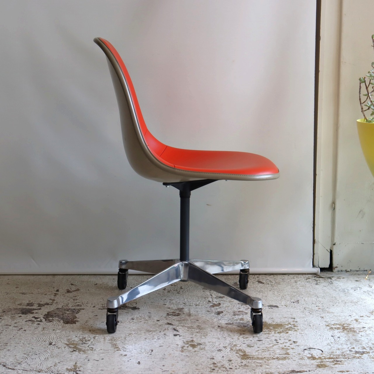 ハーマンミラー社製サイドシェルチェア。チャールズ・イームズデザインのビンテージチェア。オレンジのナウガハイドレザー、ナローマウント、背面グレーのFRPです。