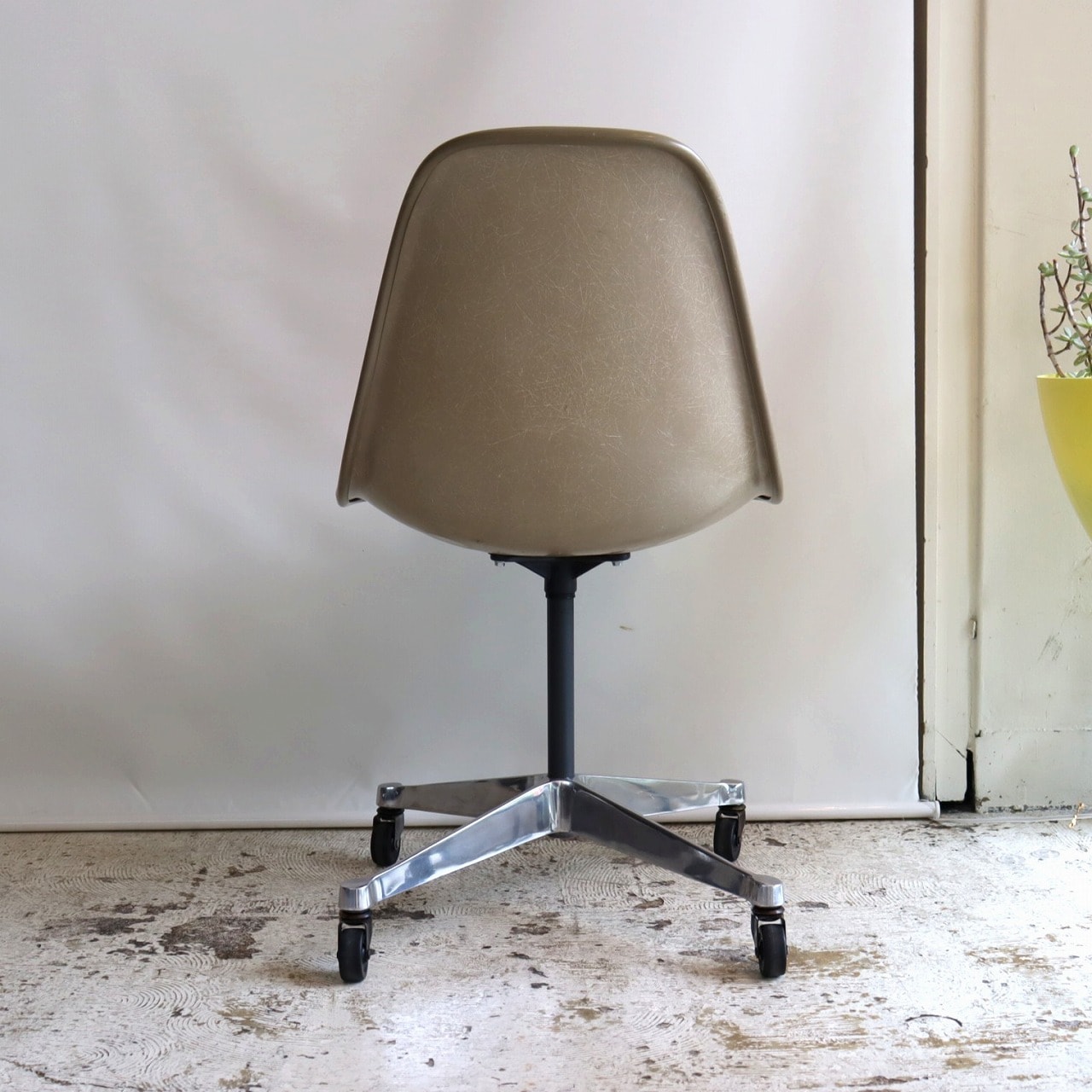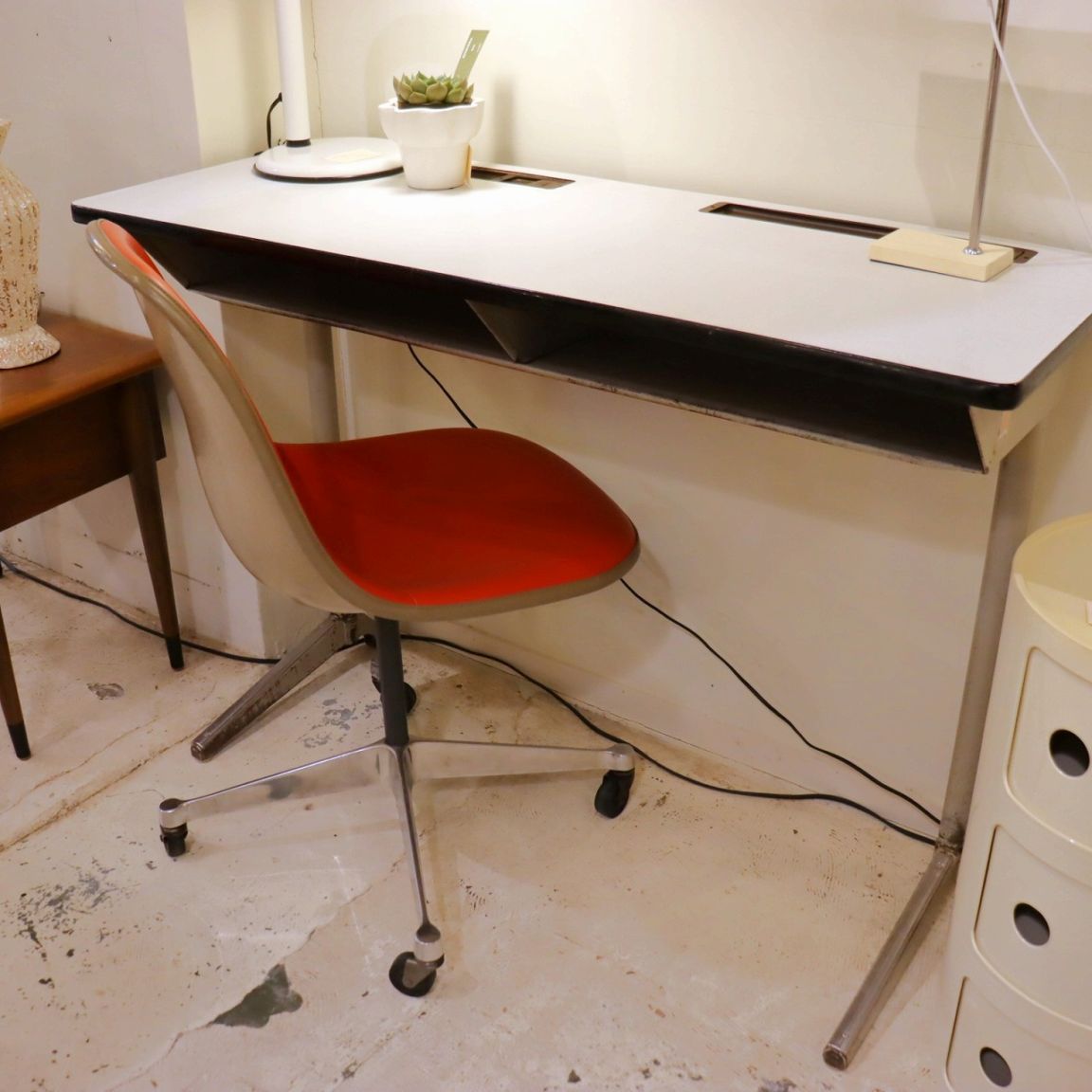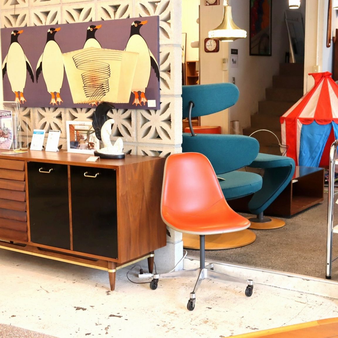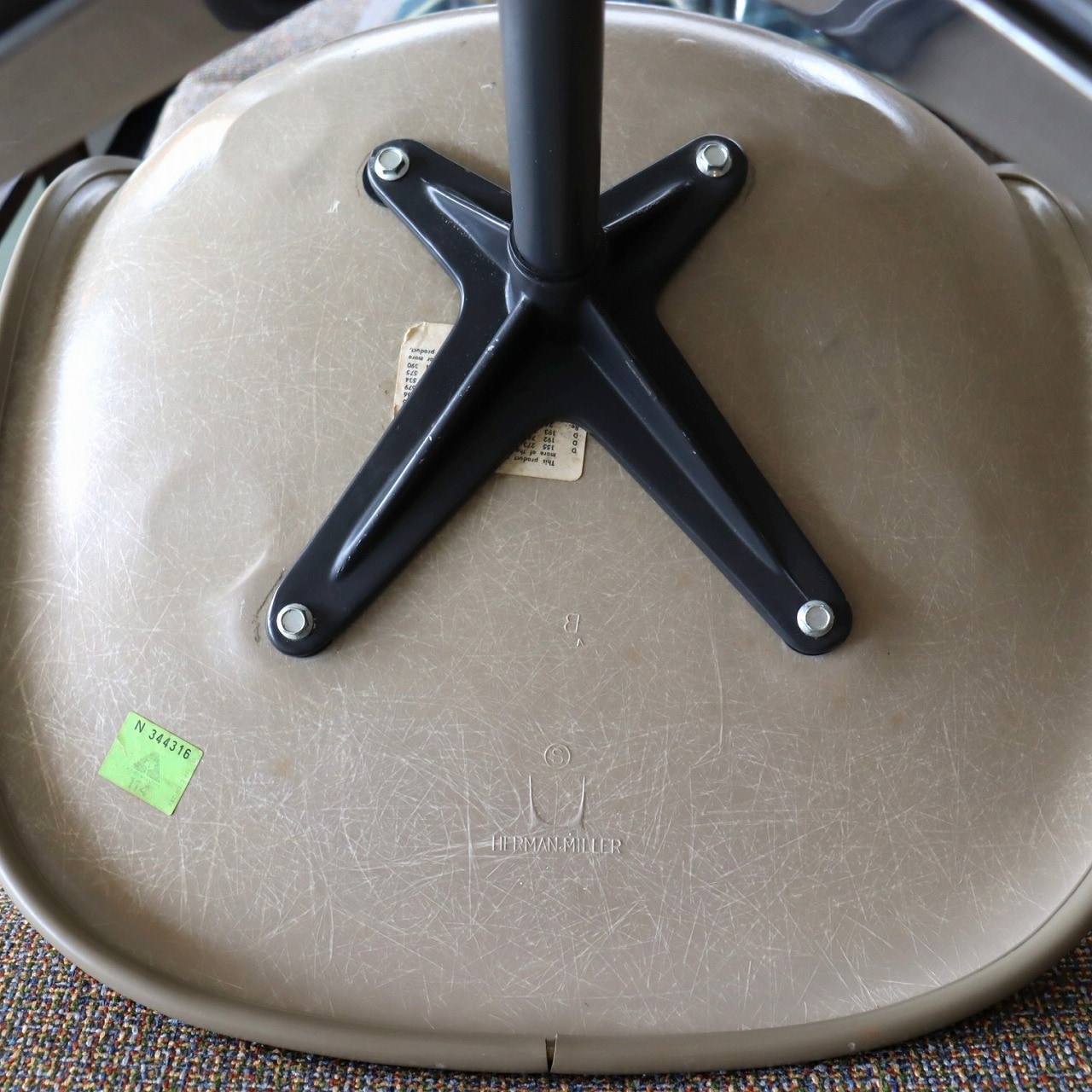 ハーマンミラー社製サイドシェルチェア。チャールズ・イームズデザインのビンテージチェア。オレンジのナウガハイドレザー、ナローマウント、背面グレーのFRPです。