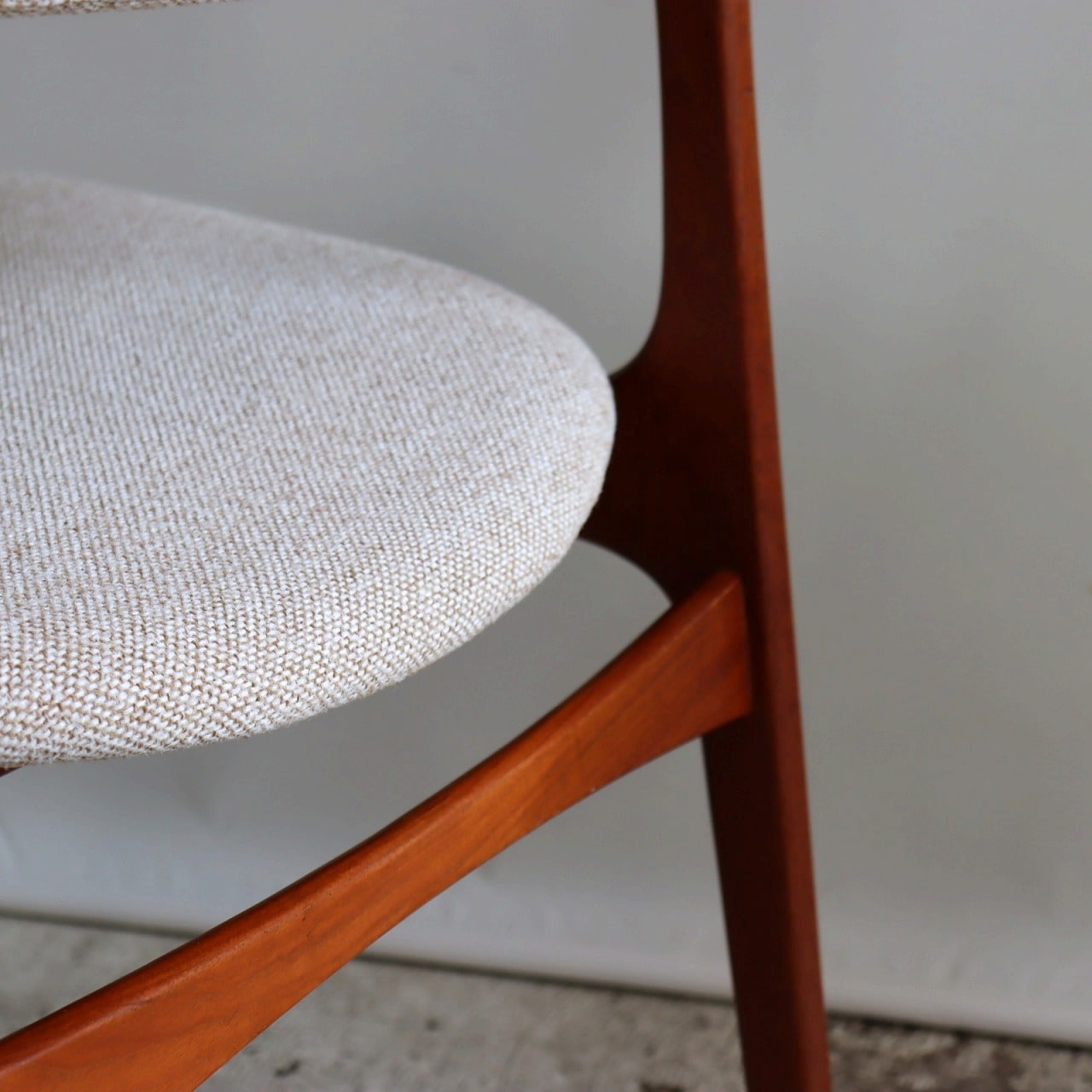 ミッドセンチュリー期によく取り入れられたフローティング(浮いたような)の座面が特徴的。チーク材のフレームが美しく、木の繋ぎ目は滑らかで有機的です。