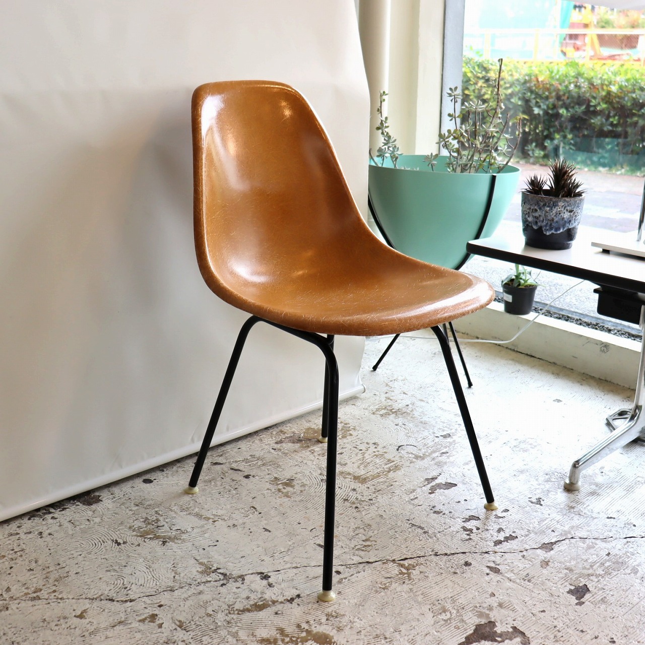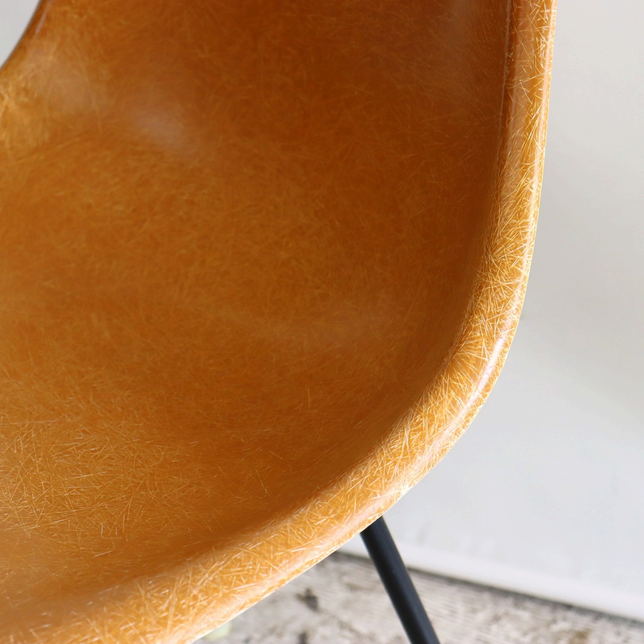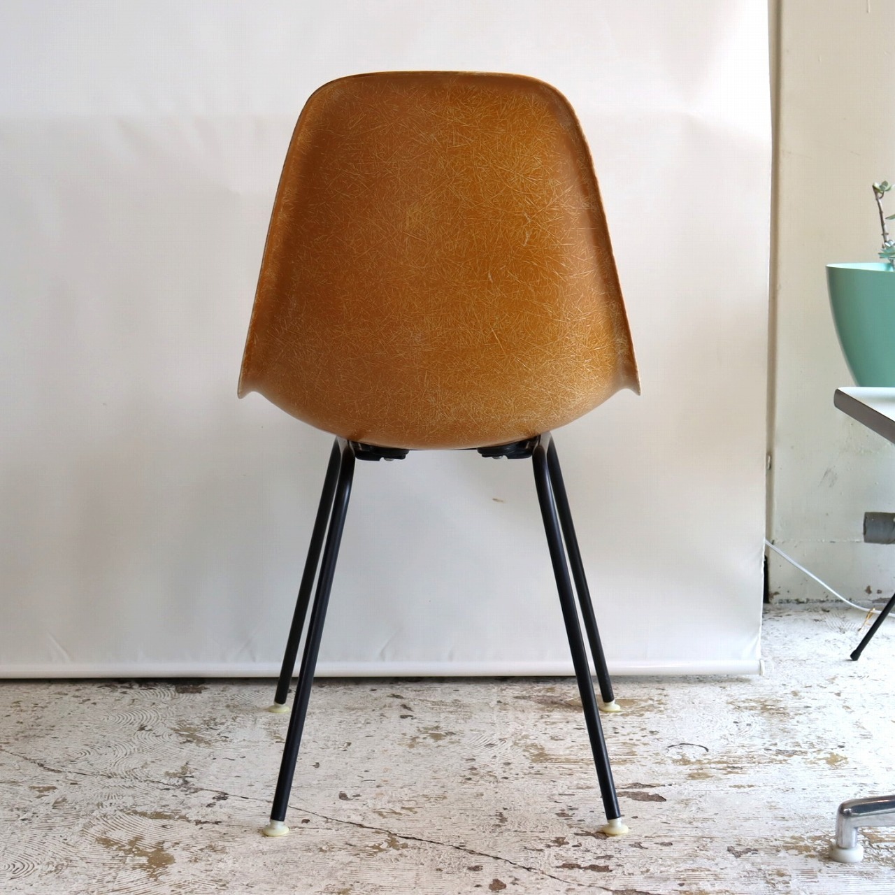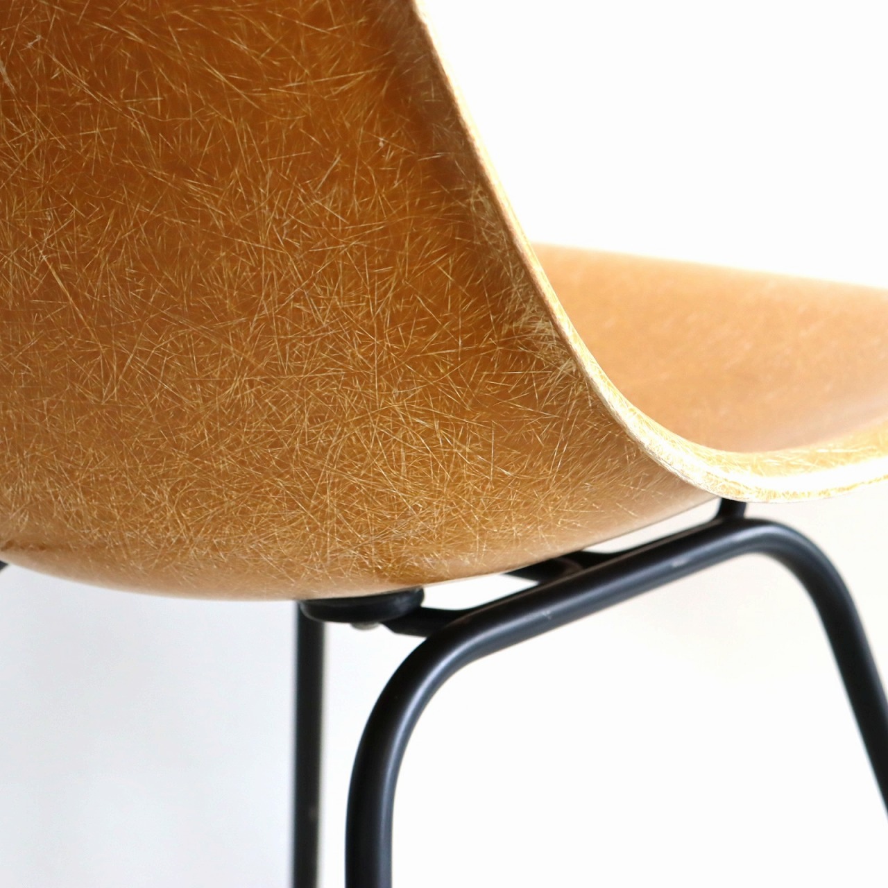 ハーマンミラー社製サイドシェルチェア。チャールズ・イームズデザインのビンテージチェア。FRP(ファイバーグラス)製のオークルダーク、ナローマウントです。