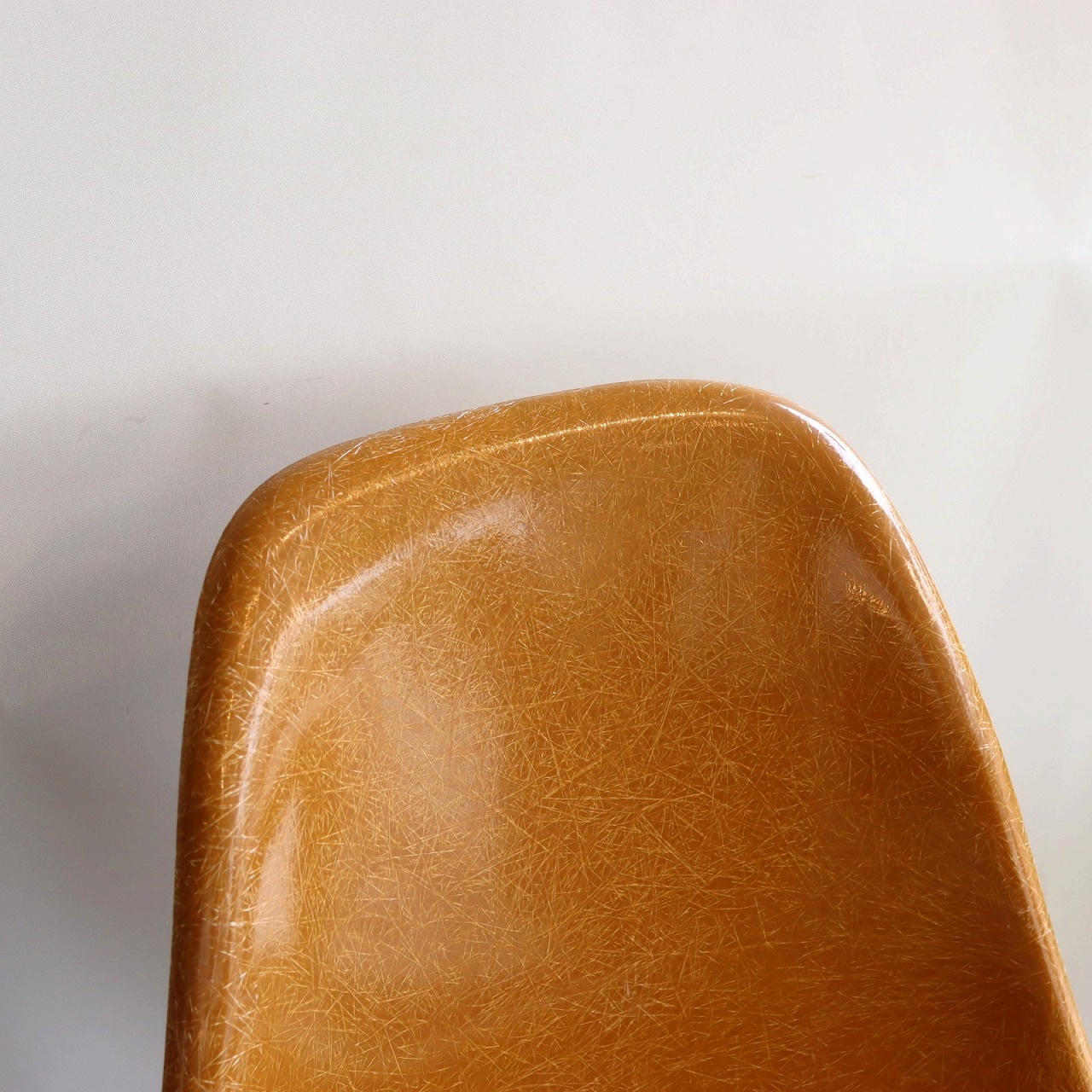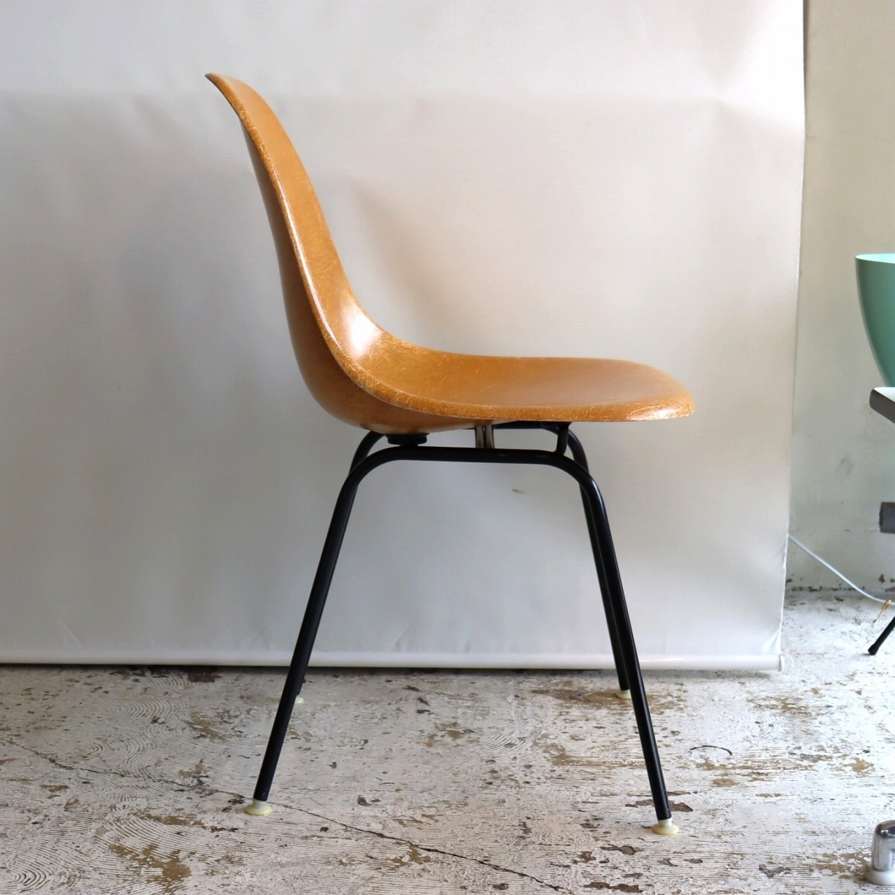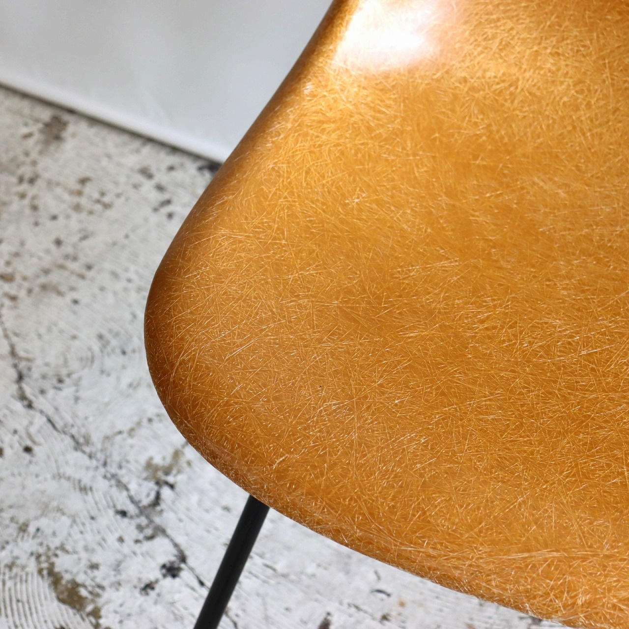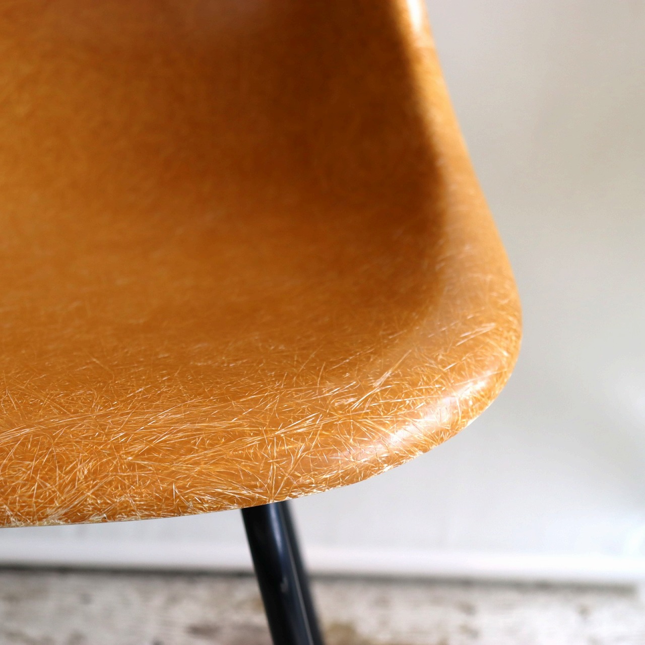 ハーマンミラー社製サイドシェルチェア。チャールズ・イームズデザインのビンテージチェア。FRP(ファイバーグラス)製のオークルダーク、ナローマウントです。