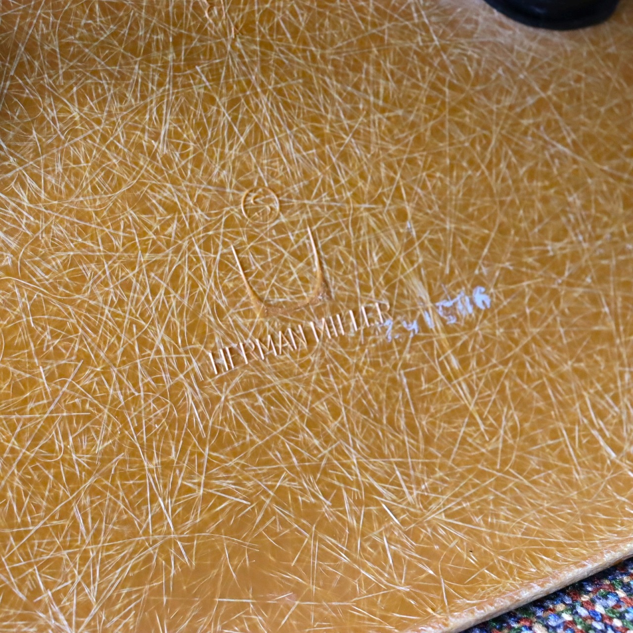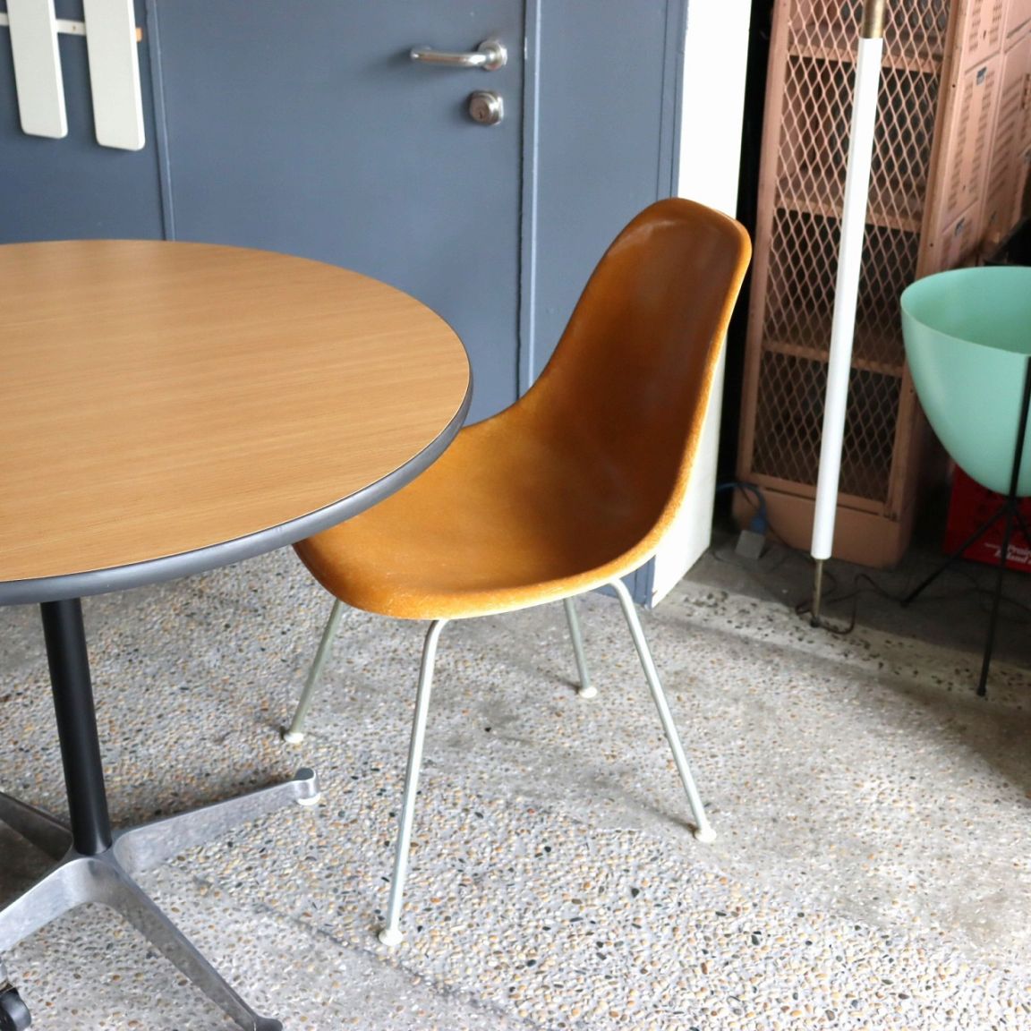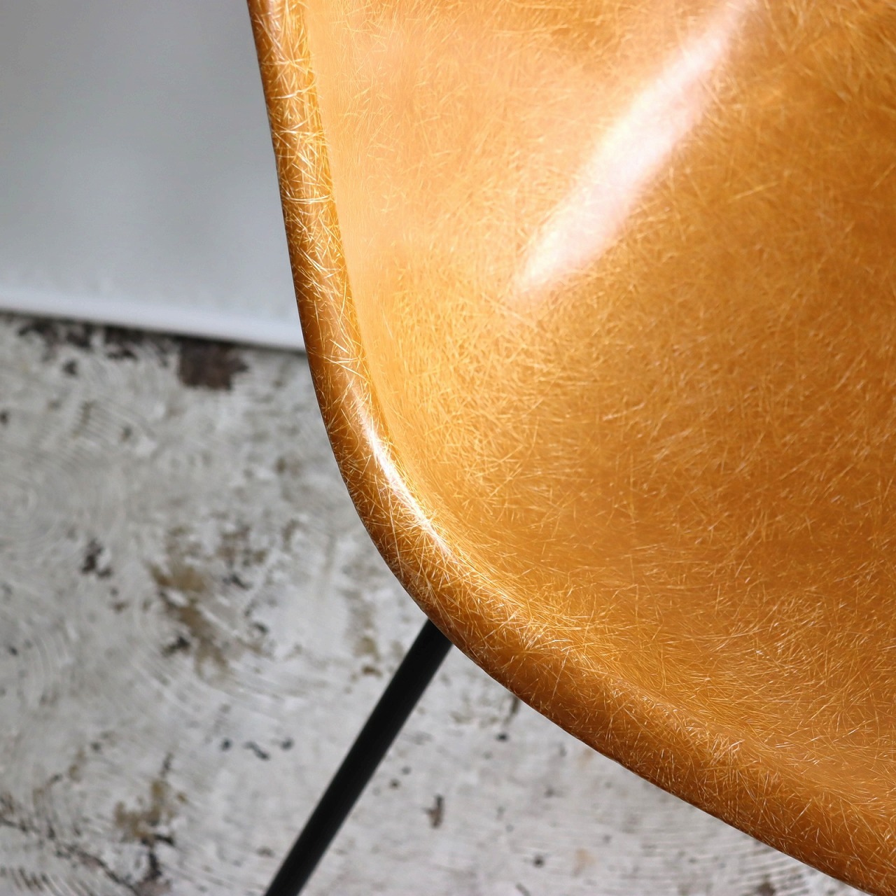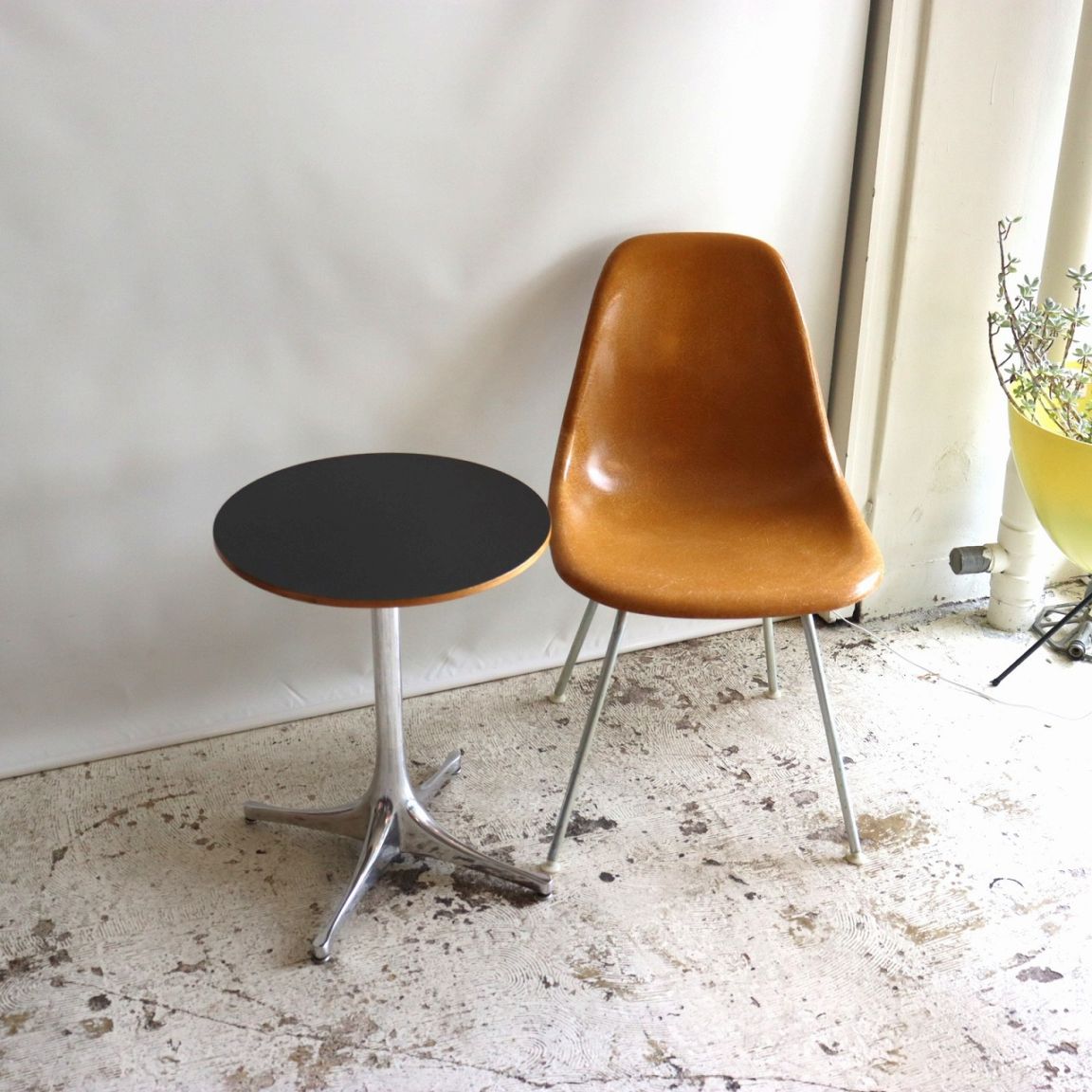 ハーマンミラー社製サイドシェルチェア。チャールズ・イームズデザインのビンテージチェア。FRP(ファイバーグラス)製のオークルダーク、ナローマウントです。