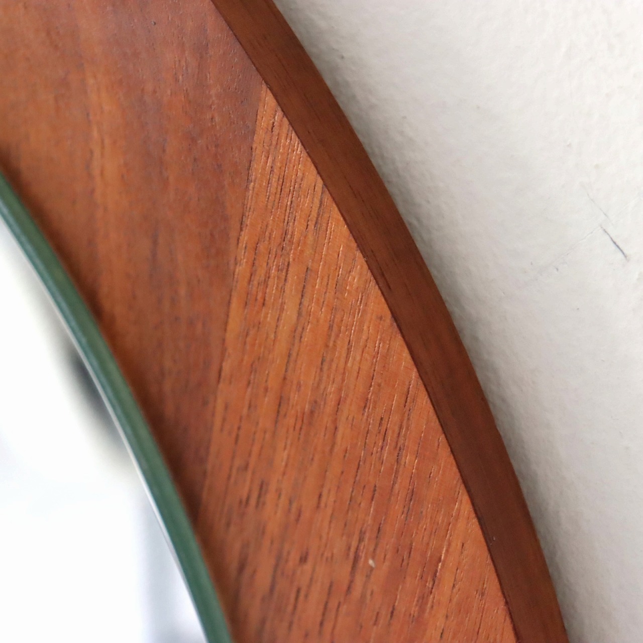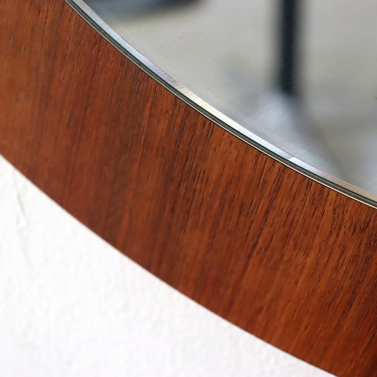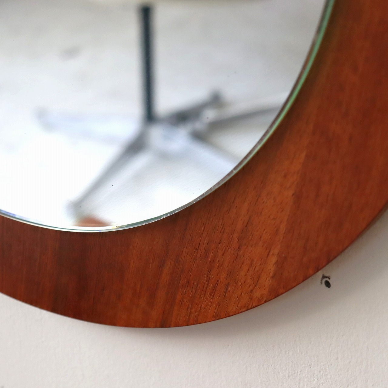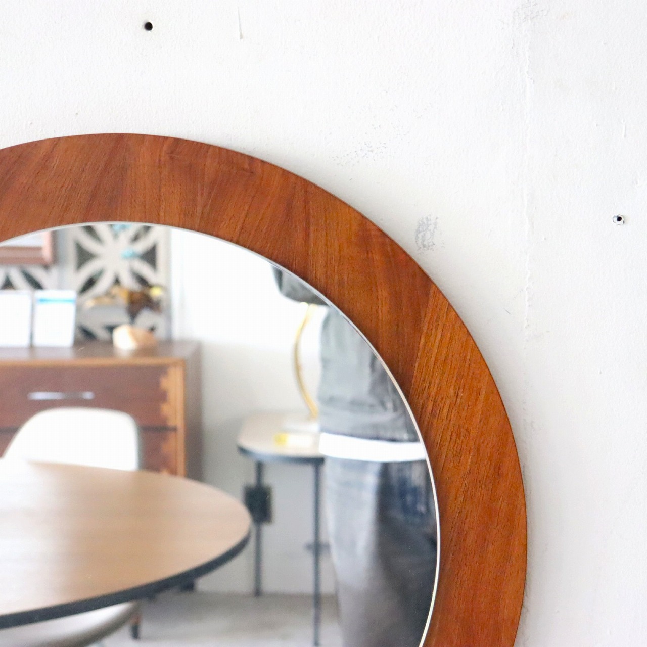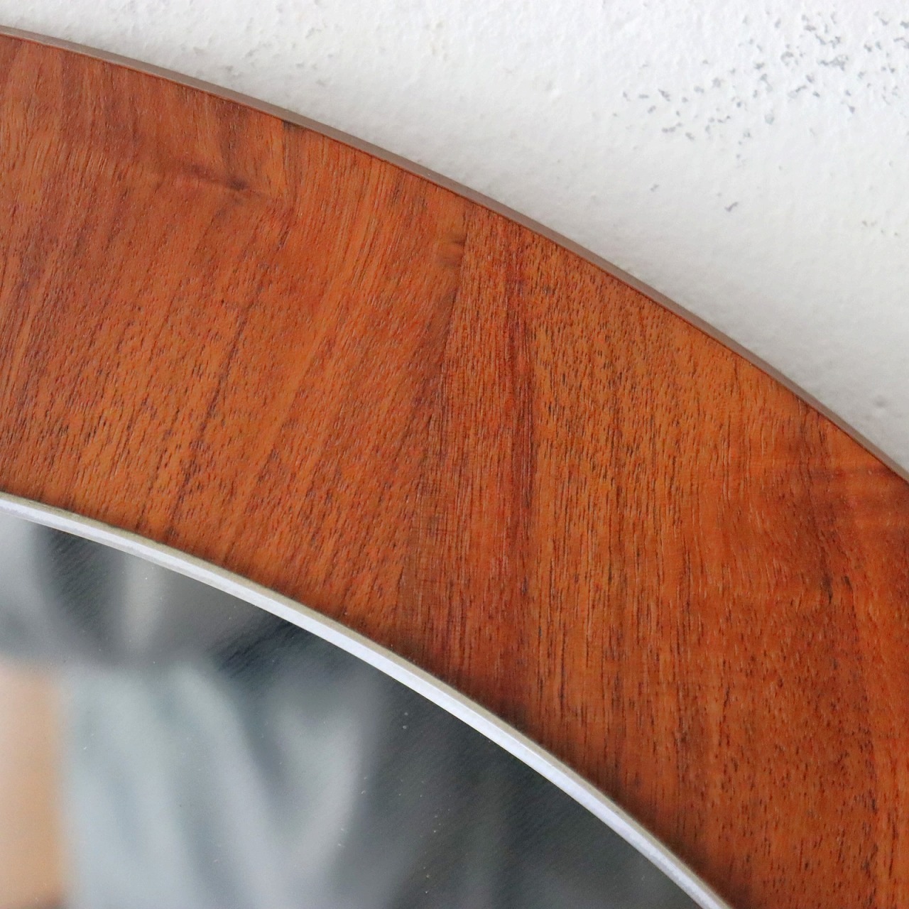 ウォールナットの突板の丸型パネルに、ミラーを重ねたシンプルなデザイン。華やかで深みのある木目も楽しめミラーの程よい抜けが感じられます。