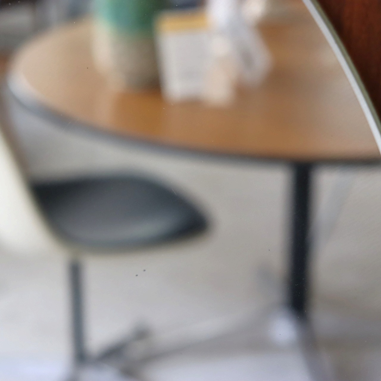 ミラーのアウトラインは外へ向けてテーパードカットされていて、映り込みの背景に立体感がでて面白いリズムが生まれています。