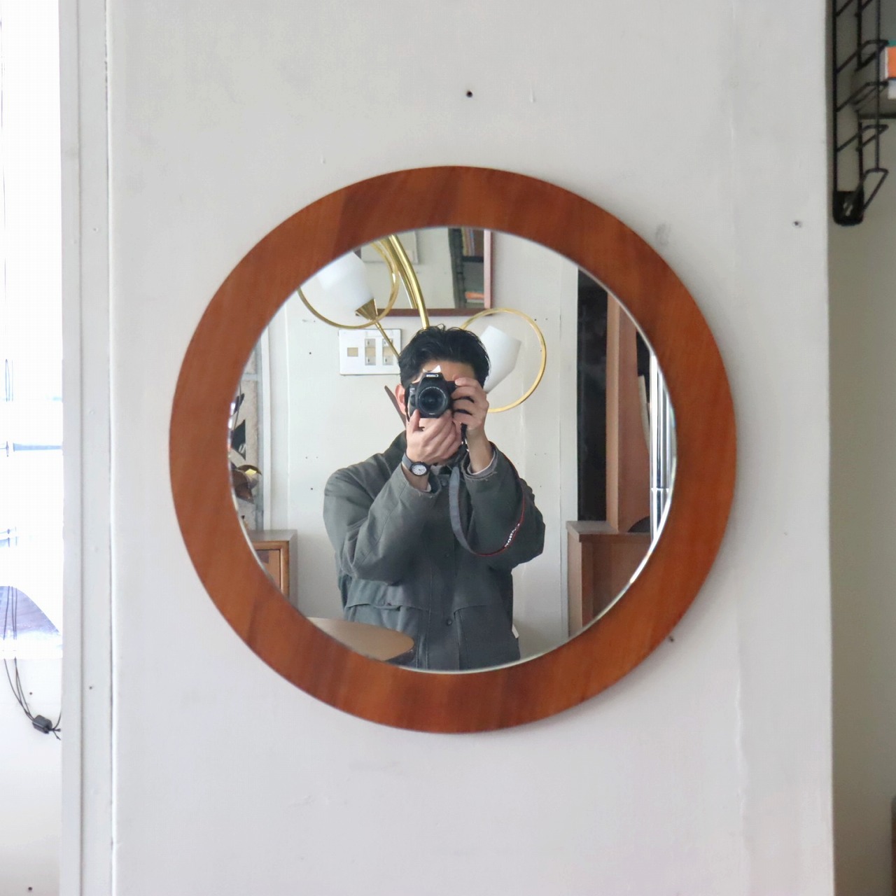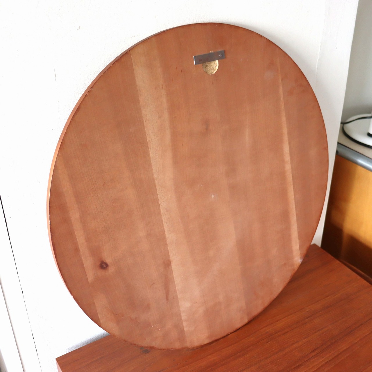 ラウンドウォールミラー。円形の鏡にウッドの板が付いた壁掛けです。