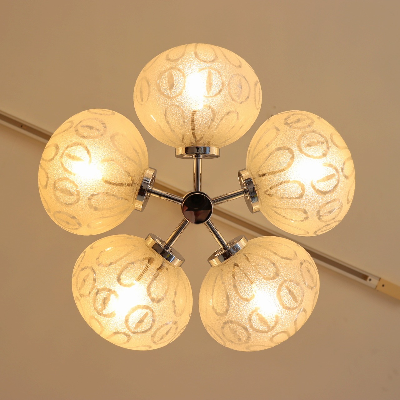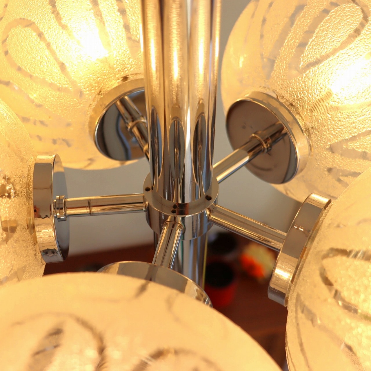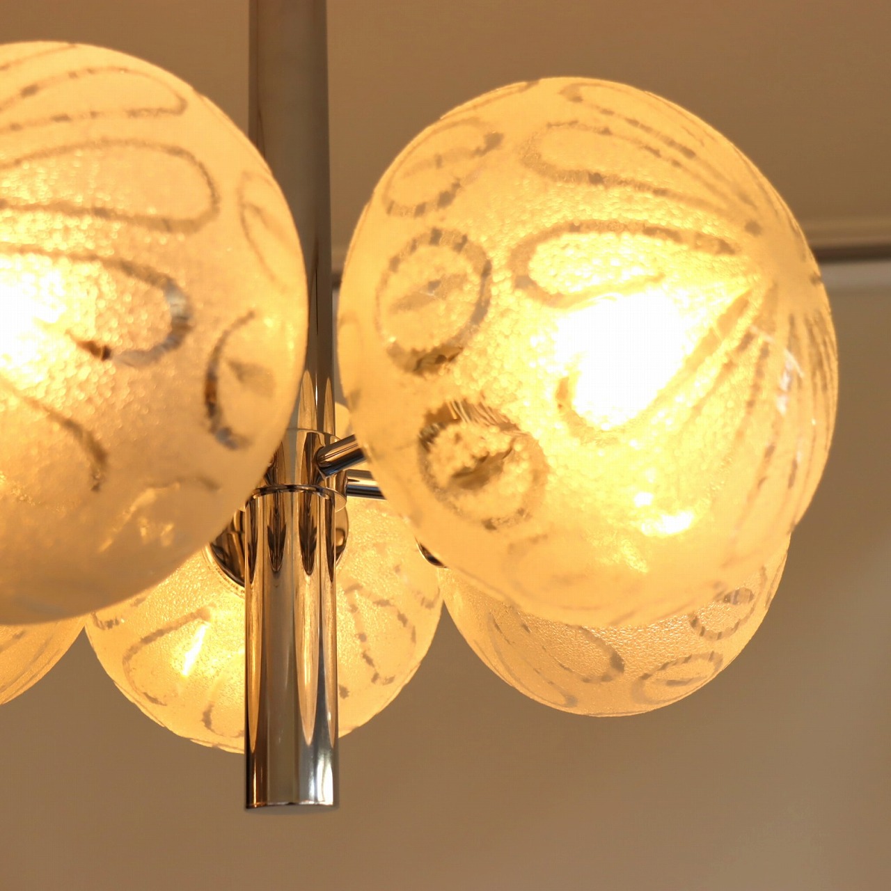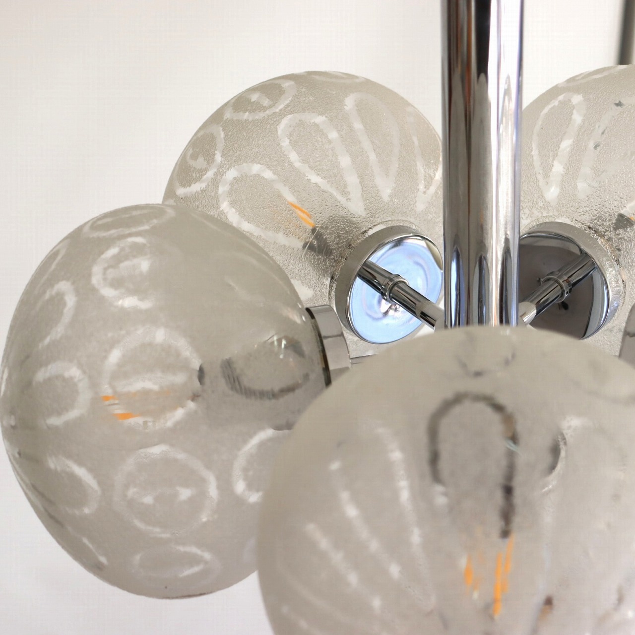 クロームメッキの支柱に放射状に伸びた5つのアームの先に、楕円形のガラスシェードが取り付けられたつくりです。