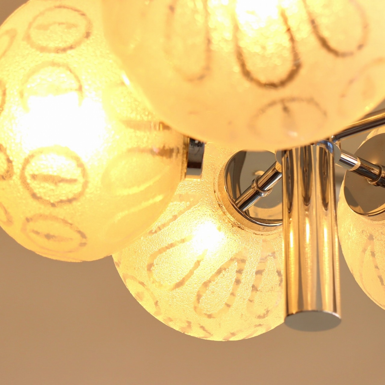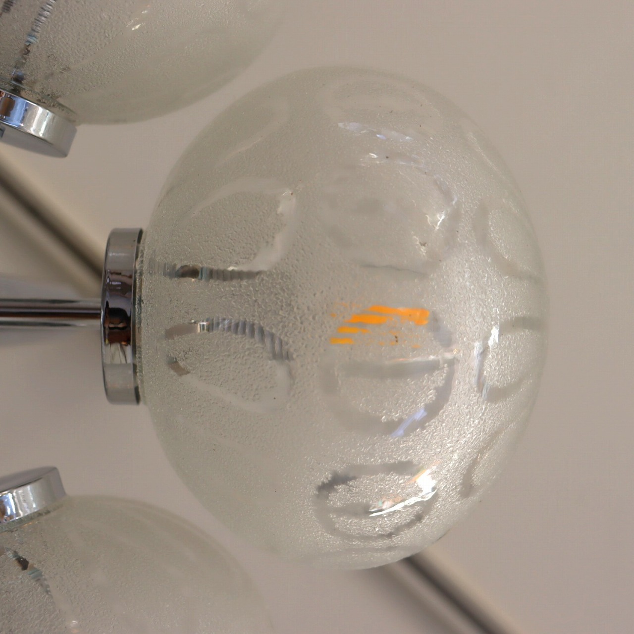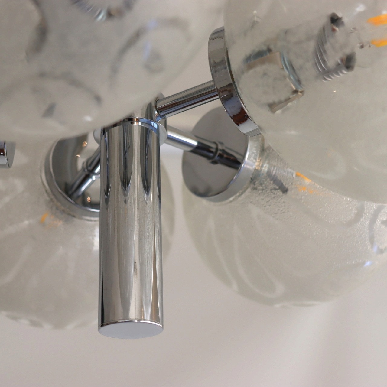 クロームメッキの支柱に放射状に伸びた5つのアームの先に、楕円形のガラスシェードが取り付けられたつくりです。