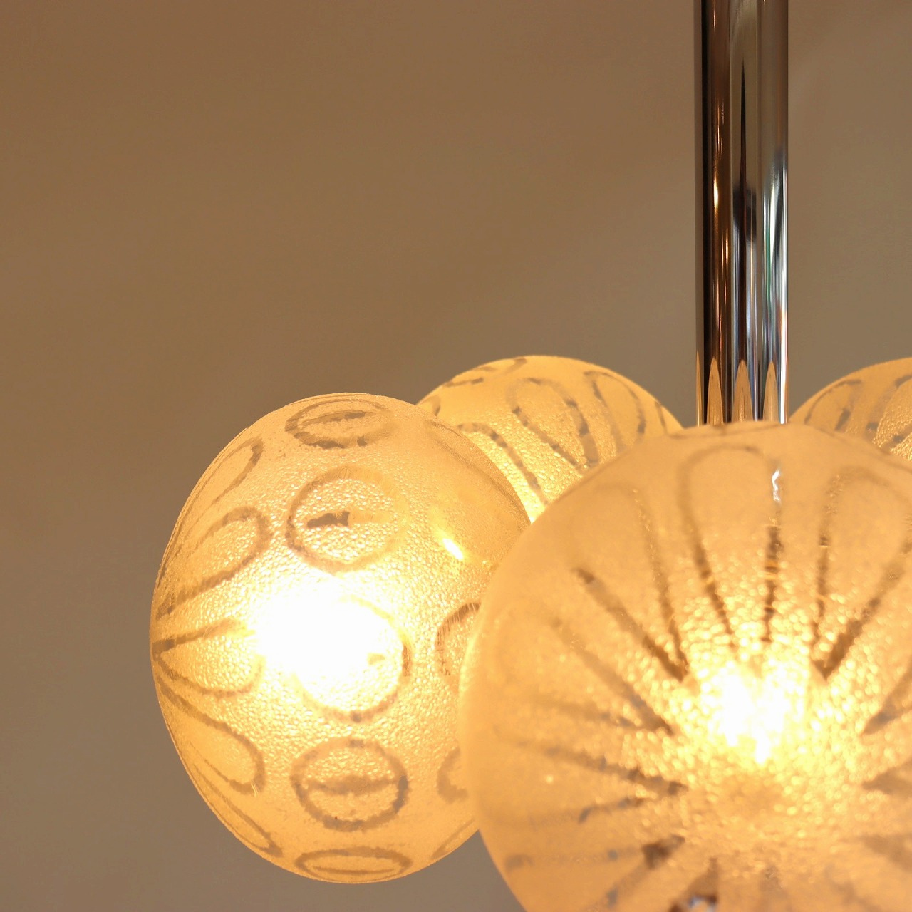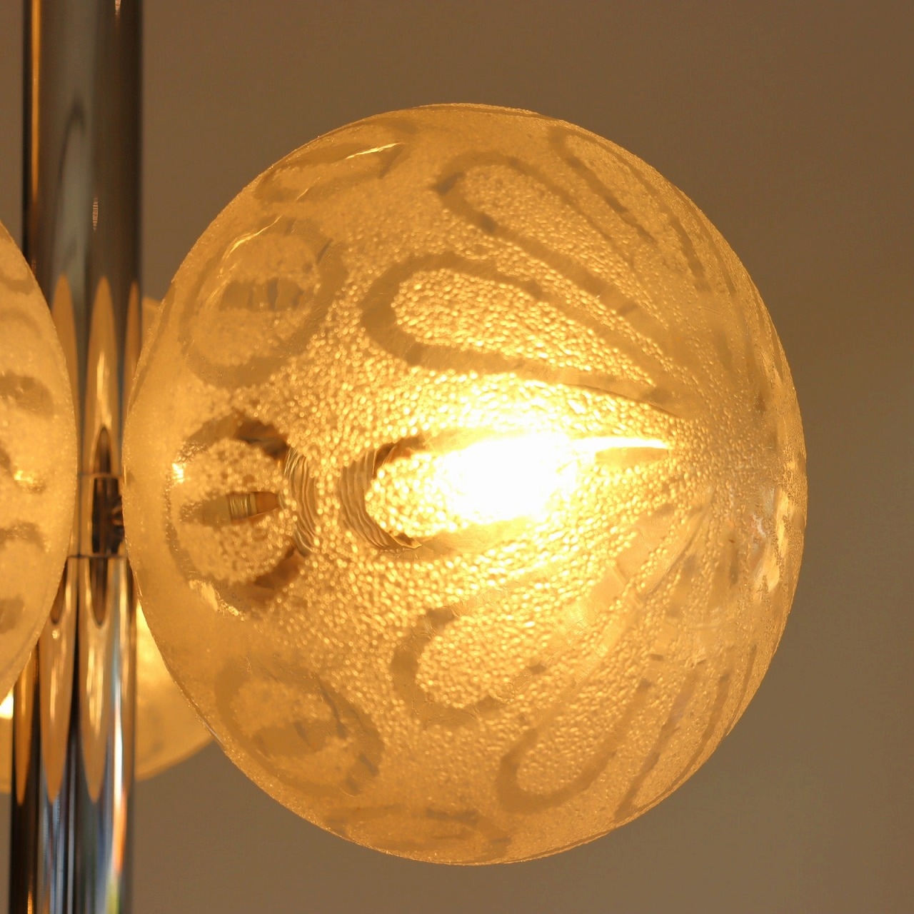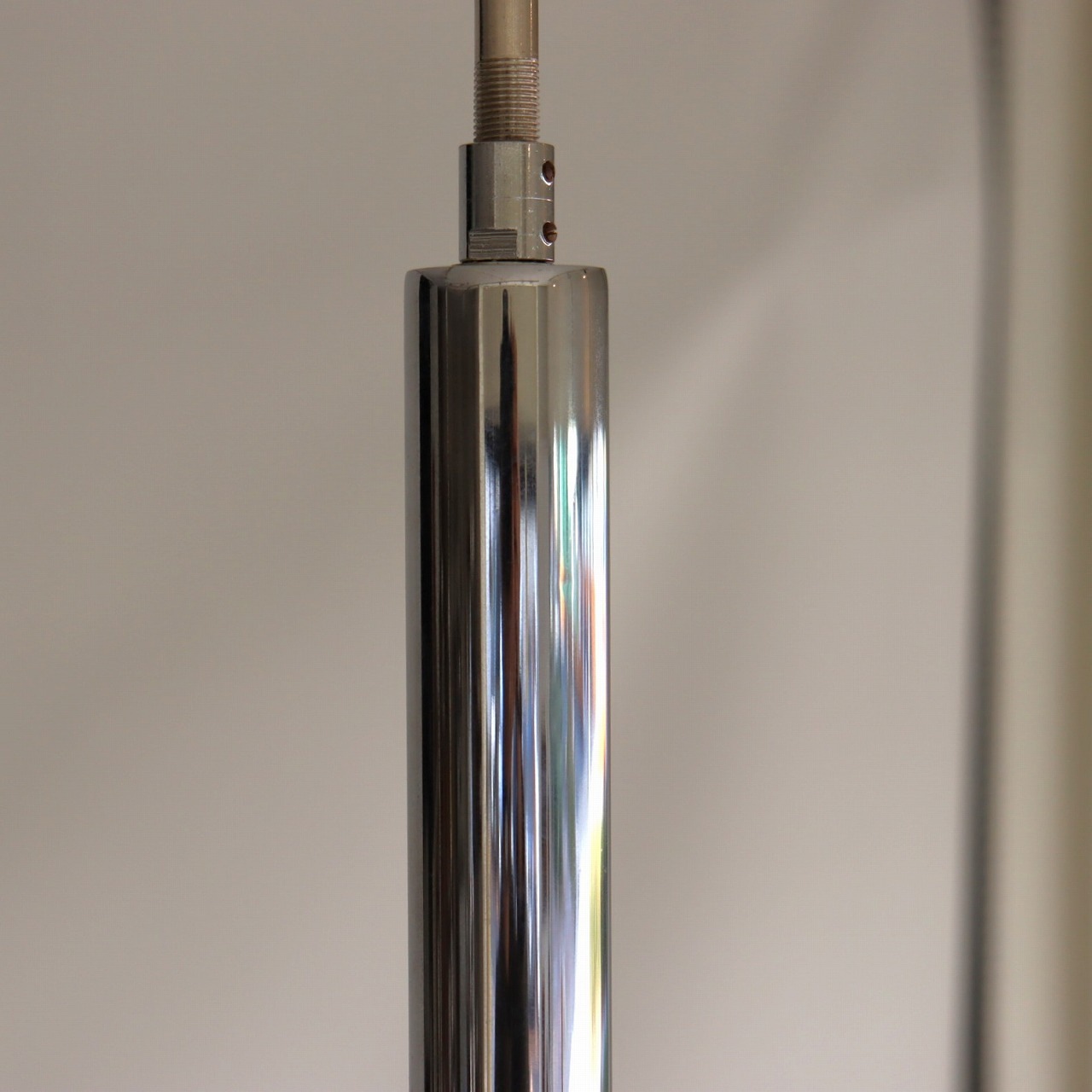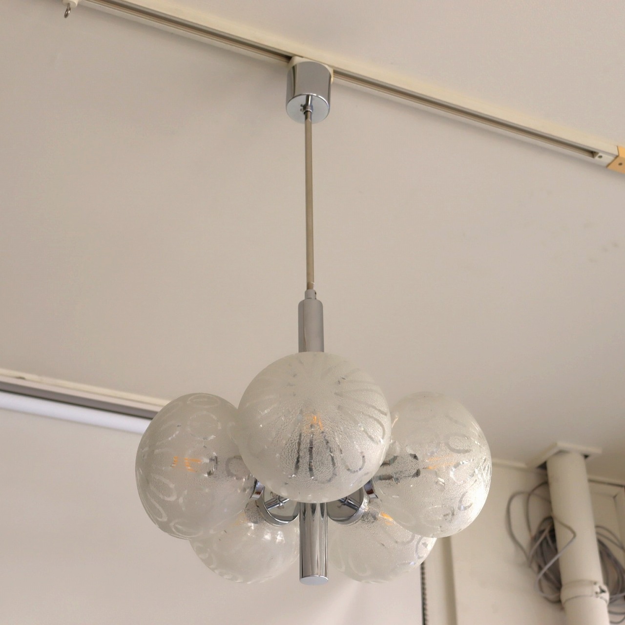 クロームメッキの支柱に放射状に伸びた5つのアームの先に、楕円形のガラスシェードが取り付けられたつくりです。