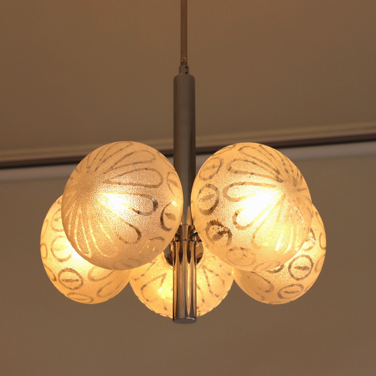 Hustadt Leuchten社製5灯ガラスシャンデリア。ドイツ製のガラスシェードが5つ付いたランプです。