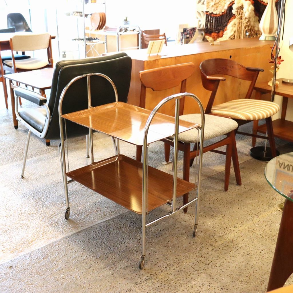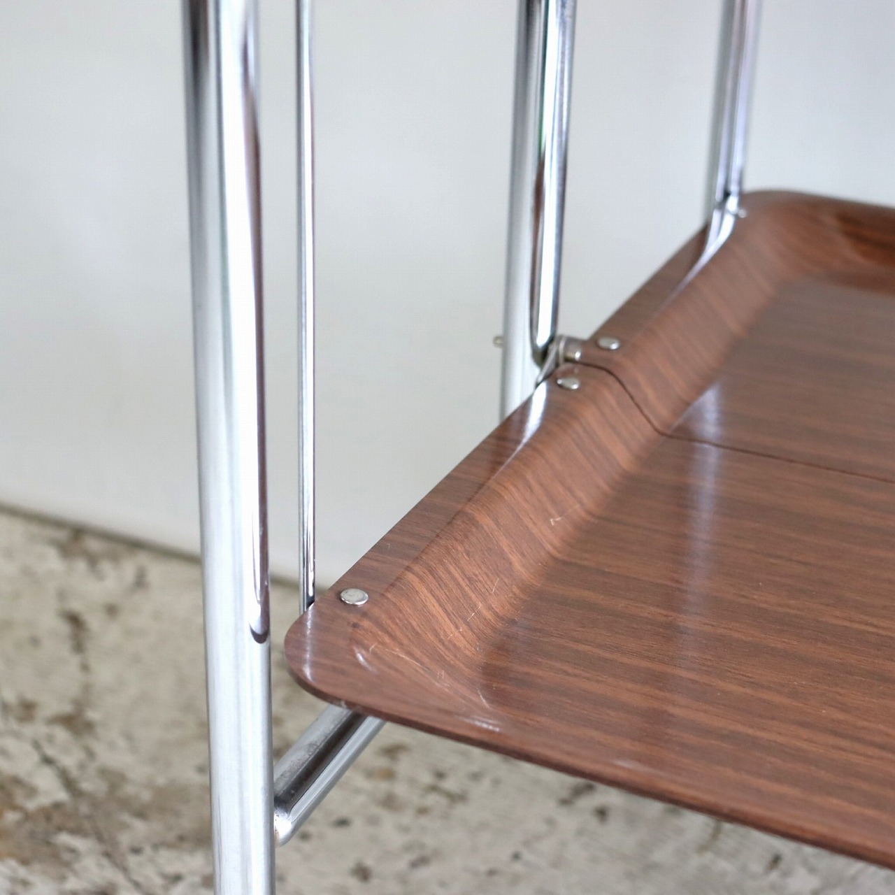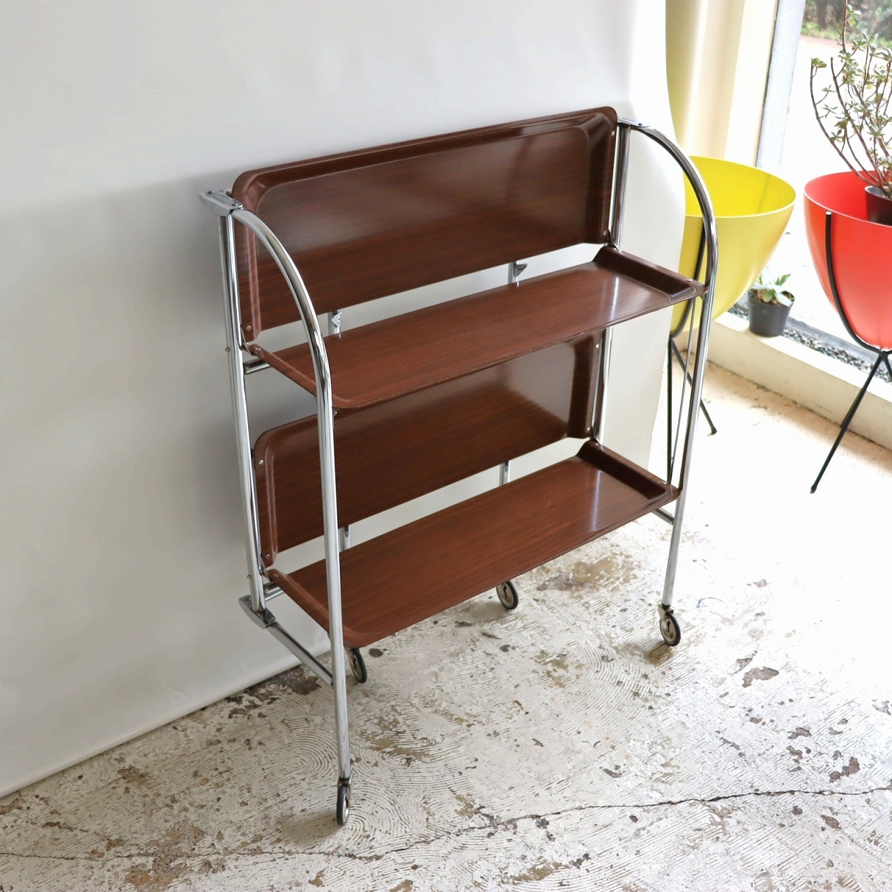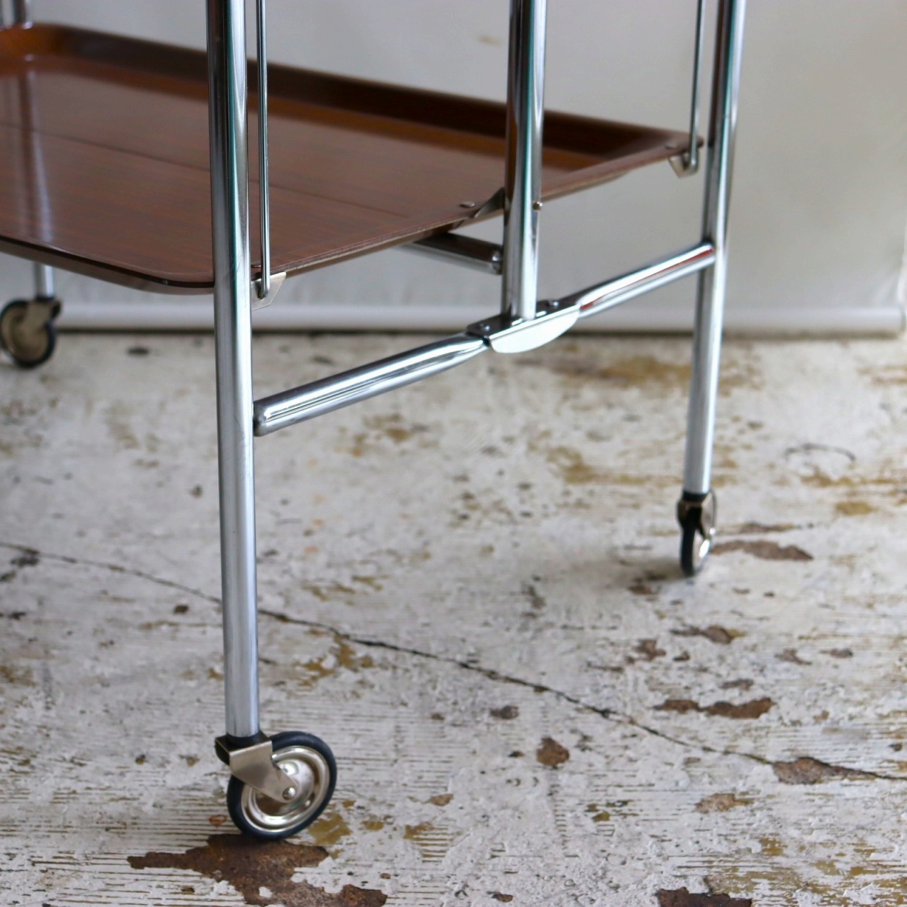 アーチ型のキャスターベースに樹脂製トレーが2枚。マットな質感はクールな佇まいです。