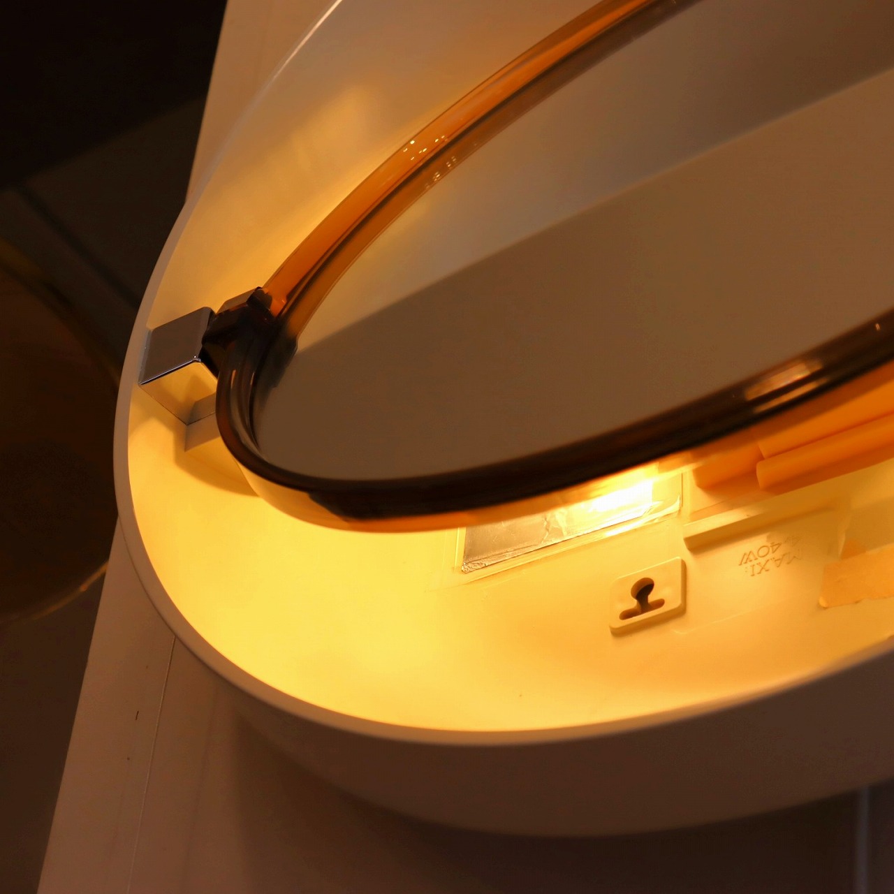 ミラーの裏にライトが付いており、正面から柔らかい光が顔を照らしてくれます。クリーム色のカバーもやさしい印象です。