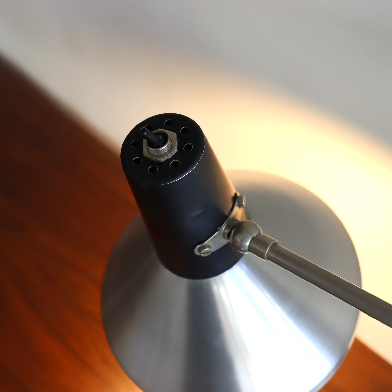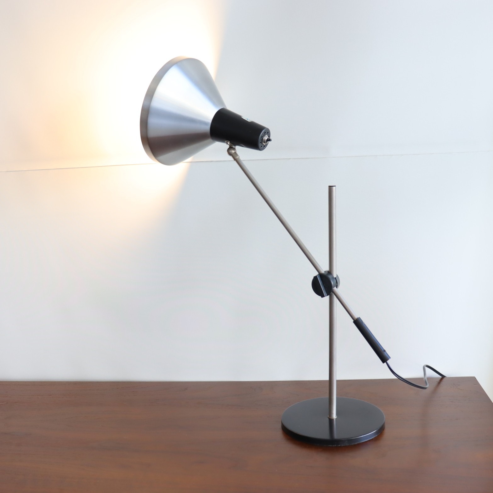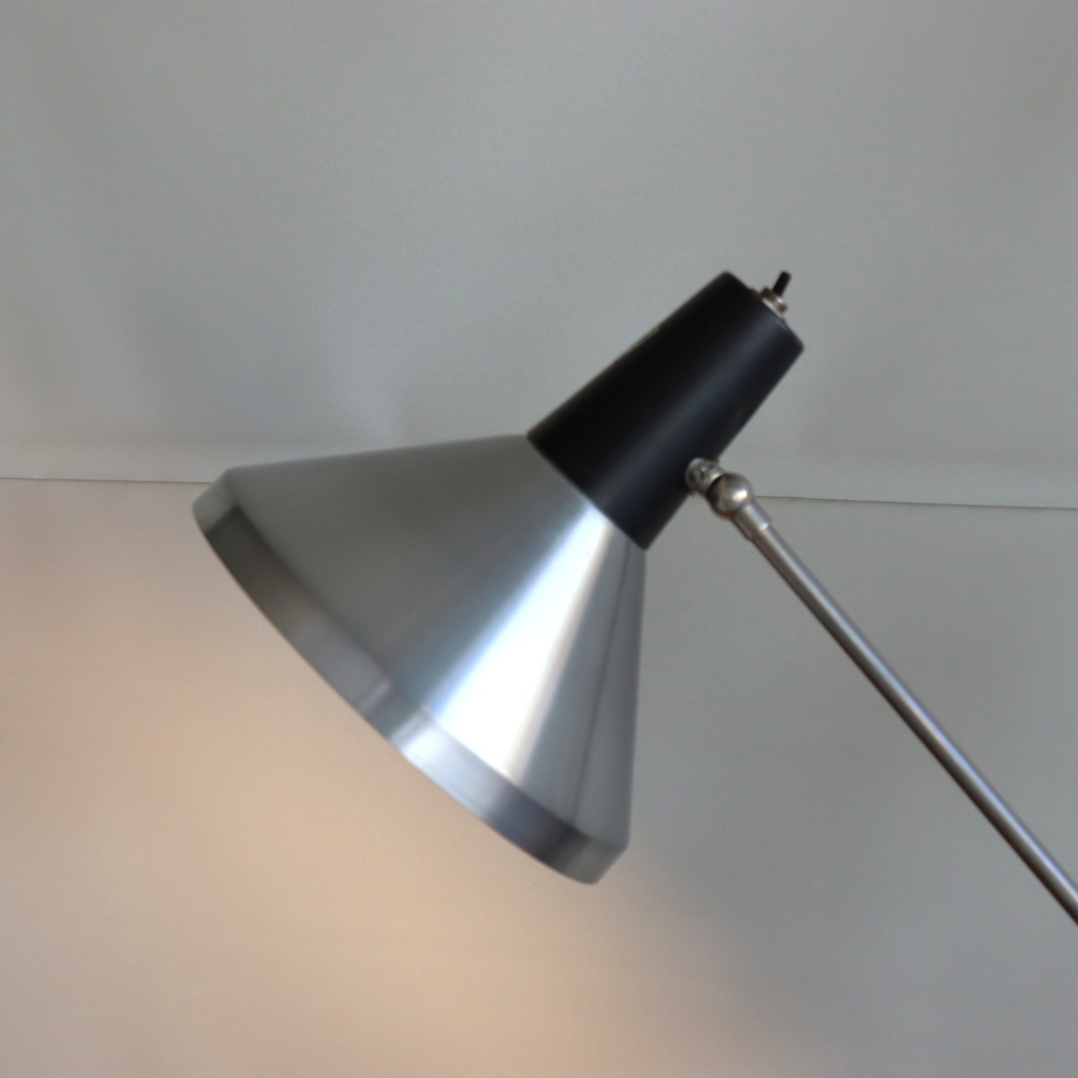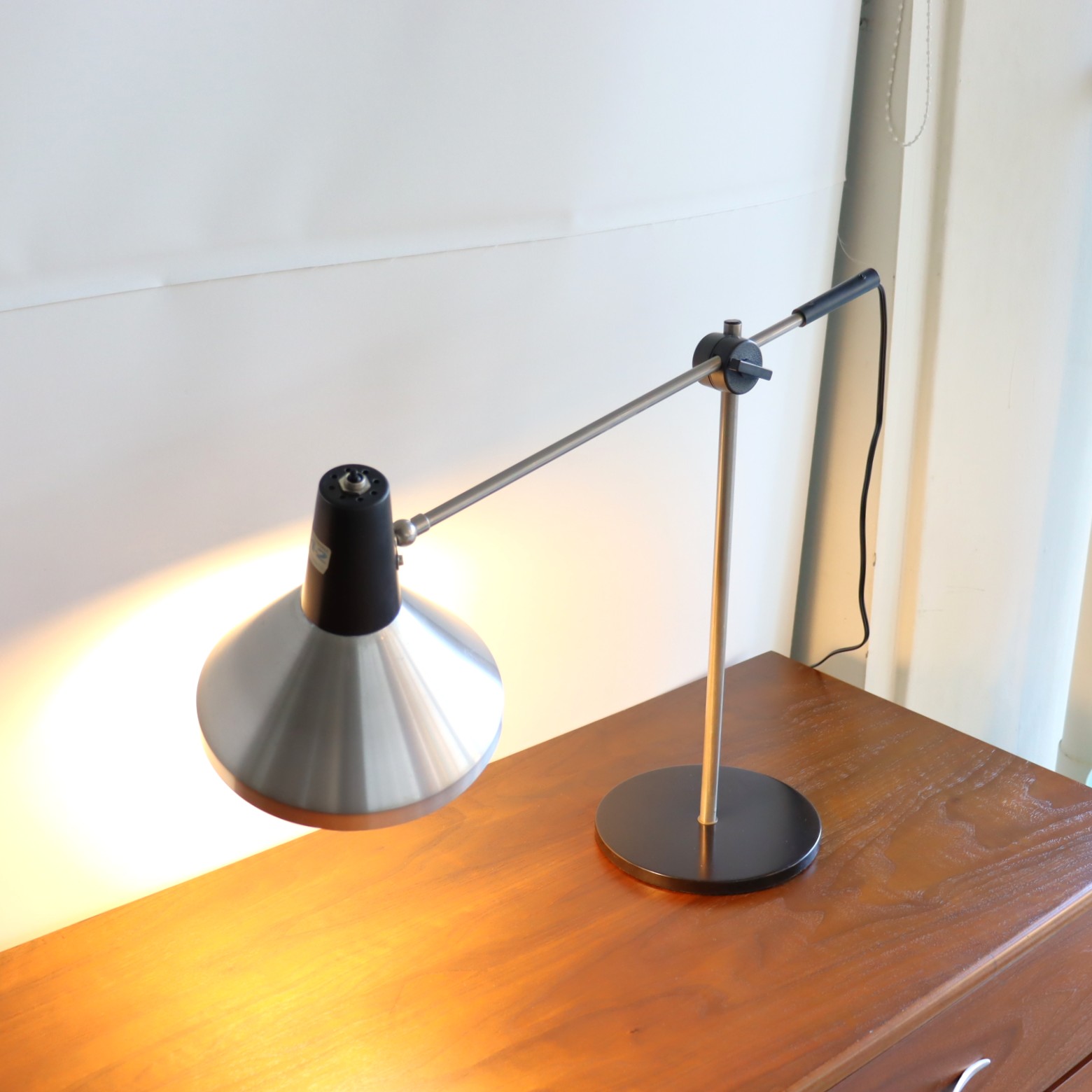 アルミ製のシェードはインダストリアルな佇まいで、シンプルかつクールなところが魅力的。後ろに伸びた支柱により全体的なバランスがよく、すっきりとしたデザインです。