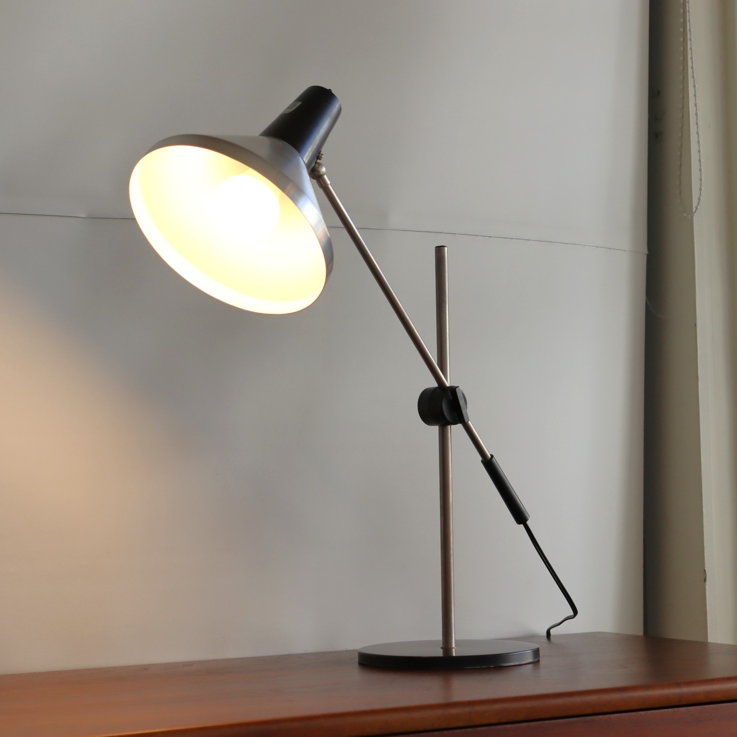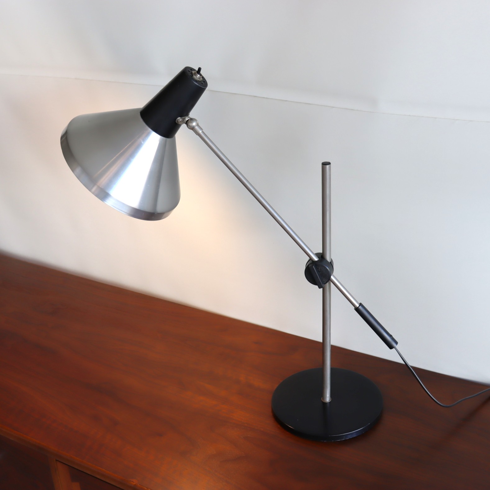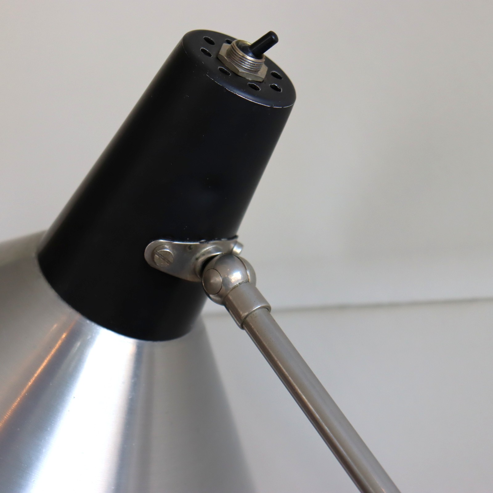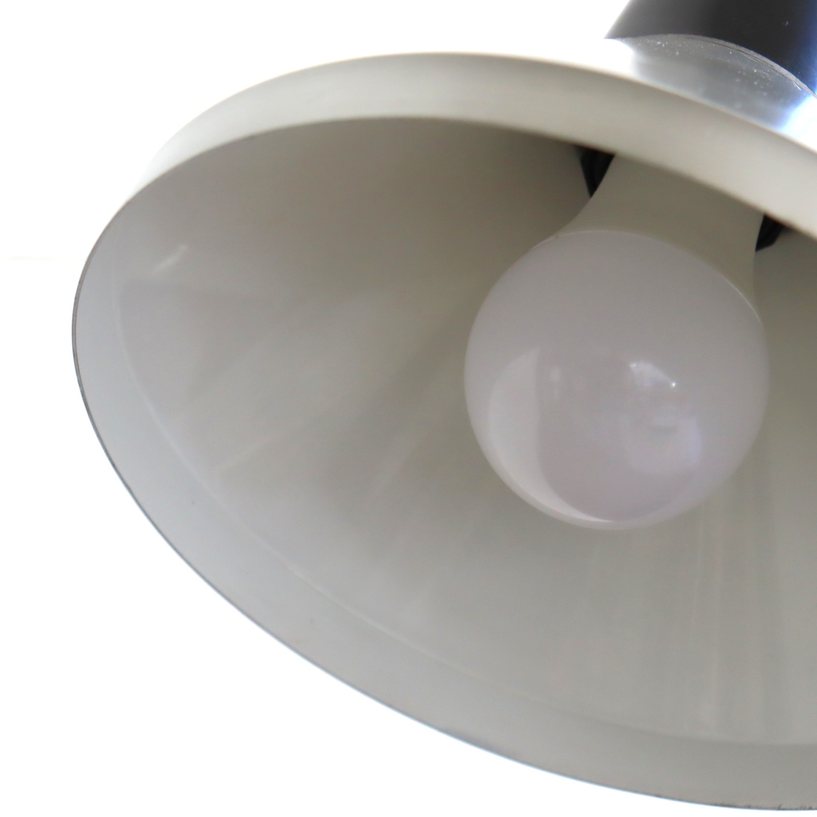 アルミ製のシェードはインダストリアルな佇まいで、シンプルかつクールなところが魅力的。後ろに伸びた支柱により全体的なバランスがよく、すっきりとしたデザインです。