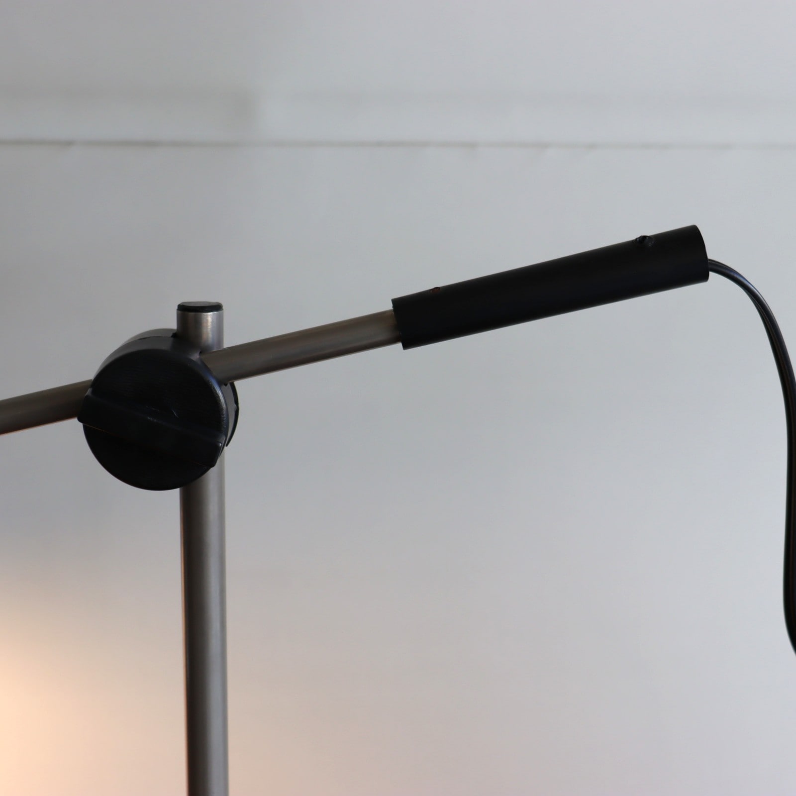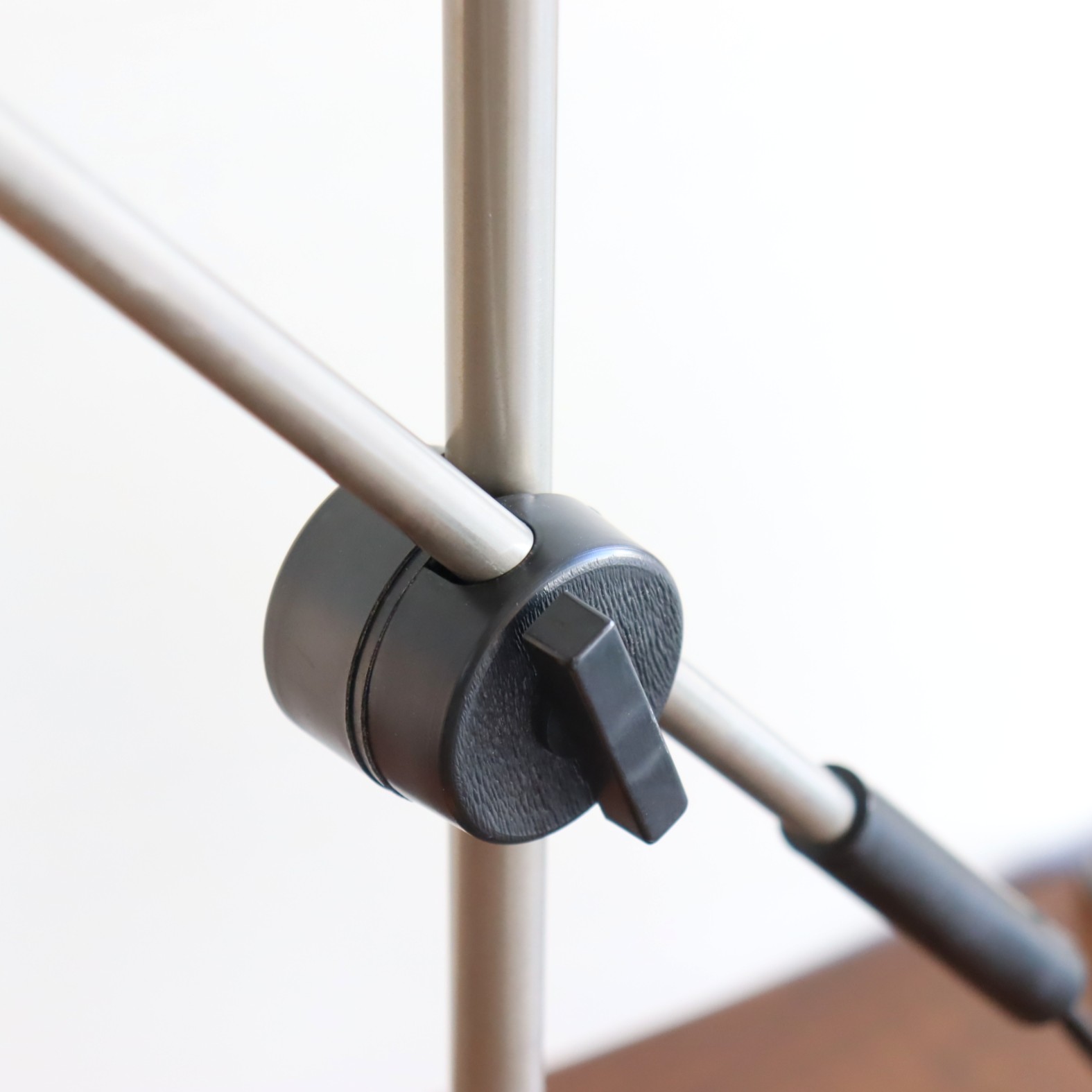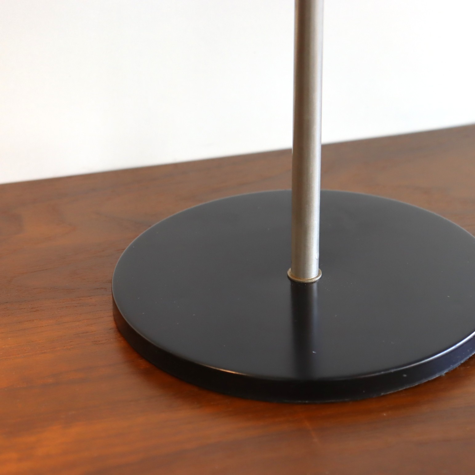 シェードの支柱とベースから伸びた支柱が交差したデザイン。交差する点にねじがあり高さや向きを自在に調節できます。機能性が高く使い勝手の良いランプです。