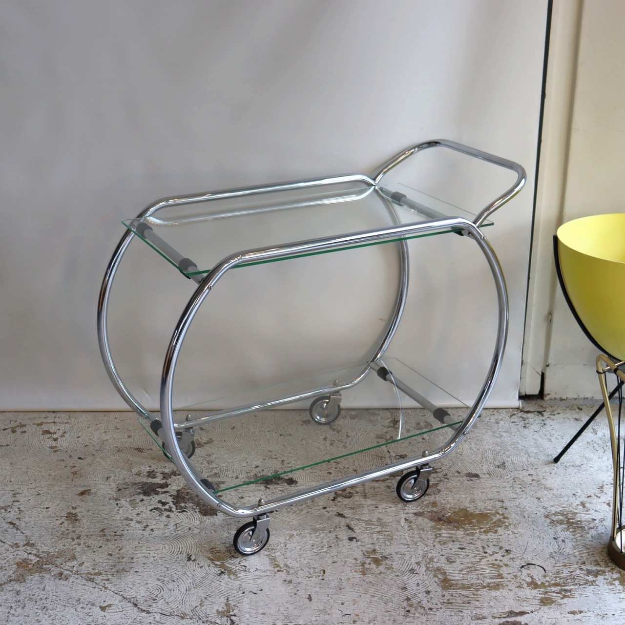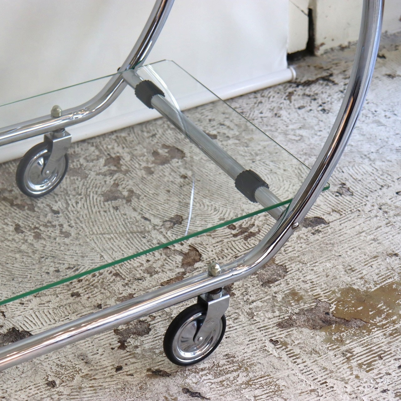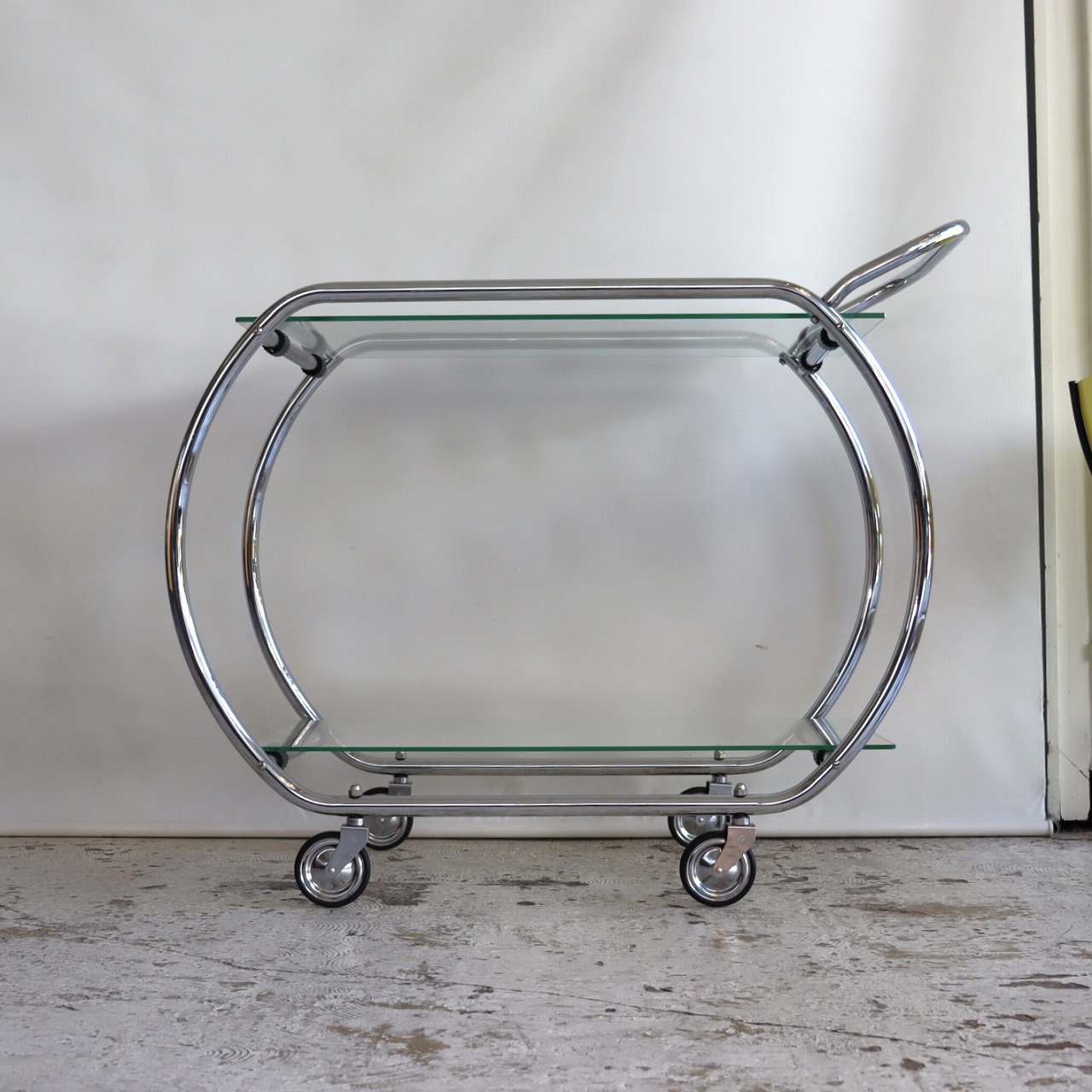 楕円形のクロームメッキのフレームにガラスの天板を乗せたカート。ハンドルとキャスター付きなので、移動もスムーズです。