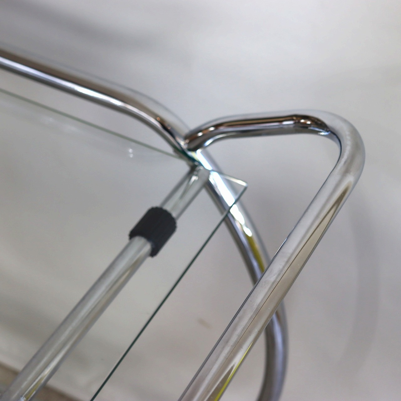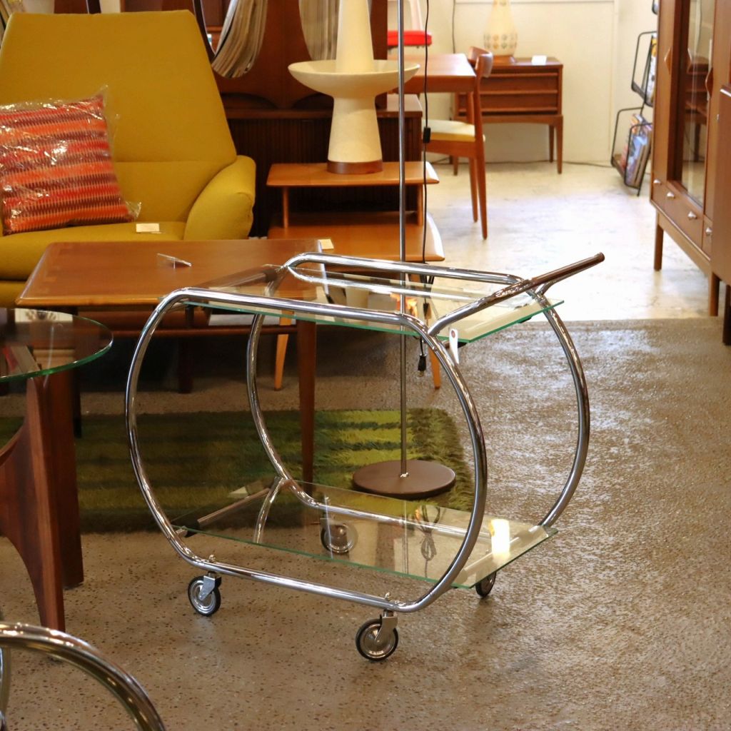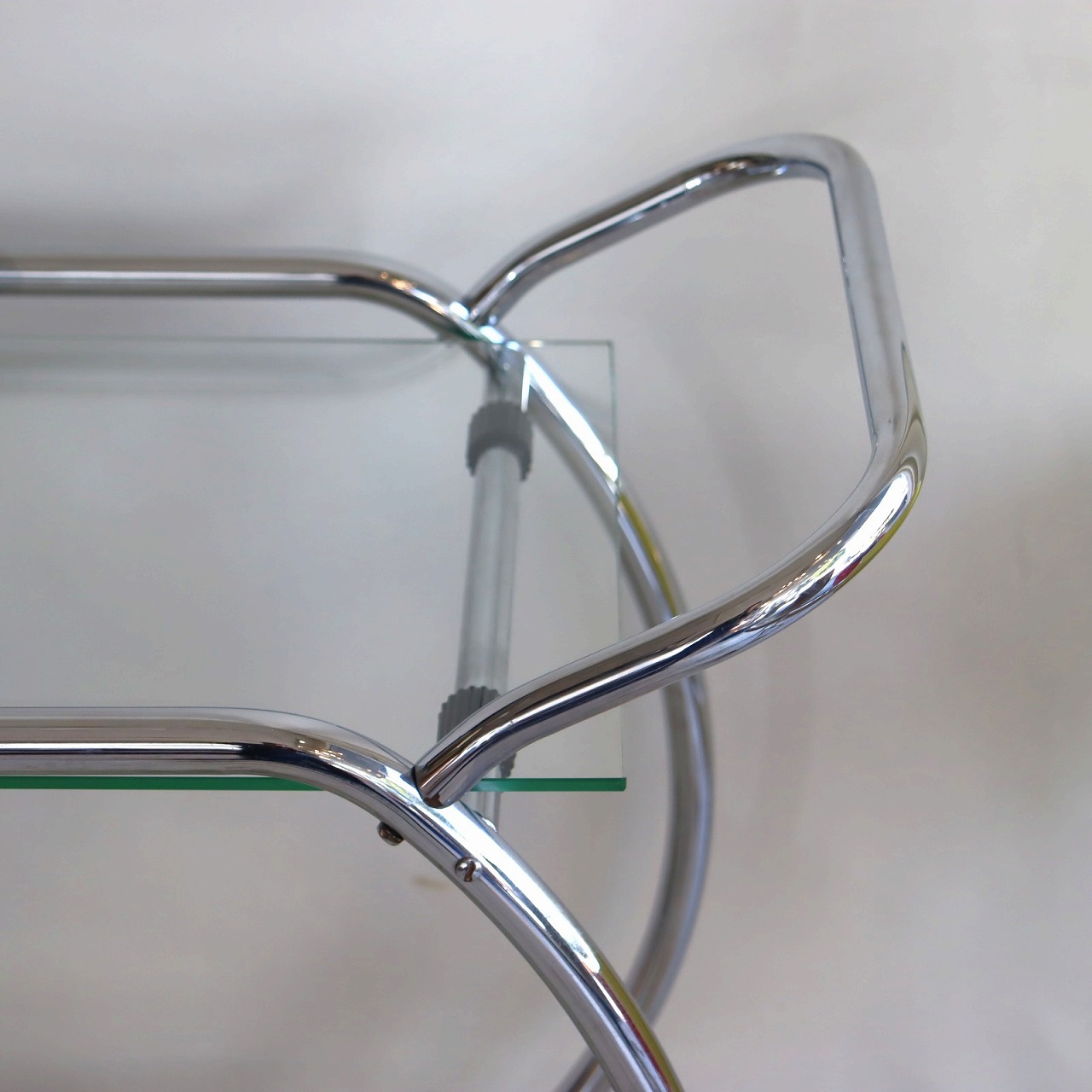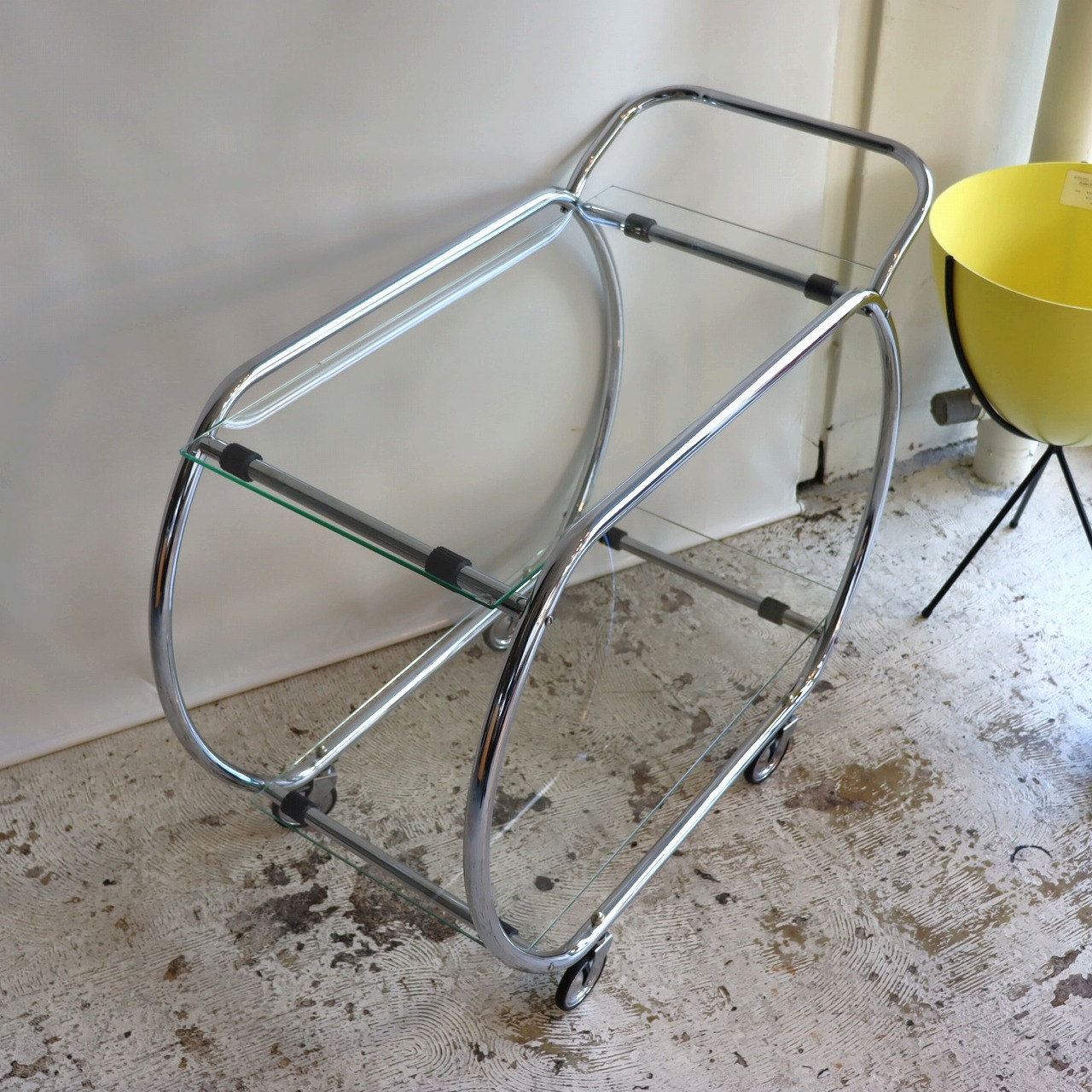 楕円形のクロームメッキのフレームにガラスの天板を乗せたカート。ハンドルとキャスター付きなので、移動もスムーズです。