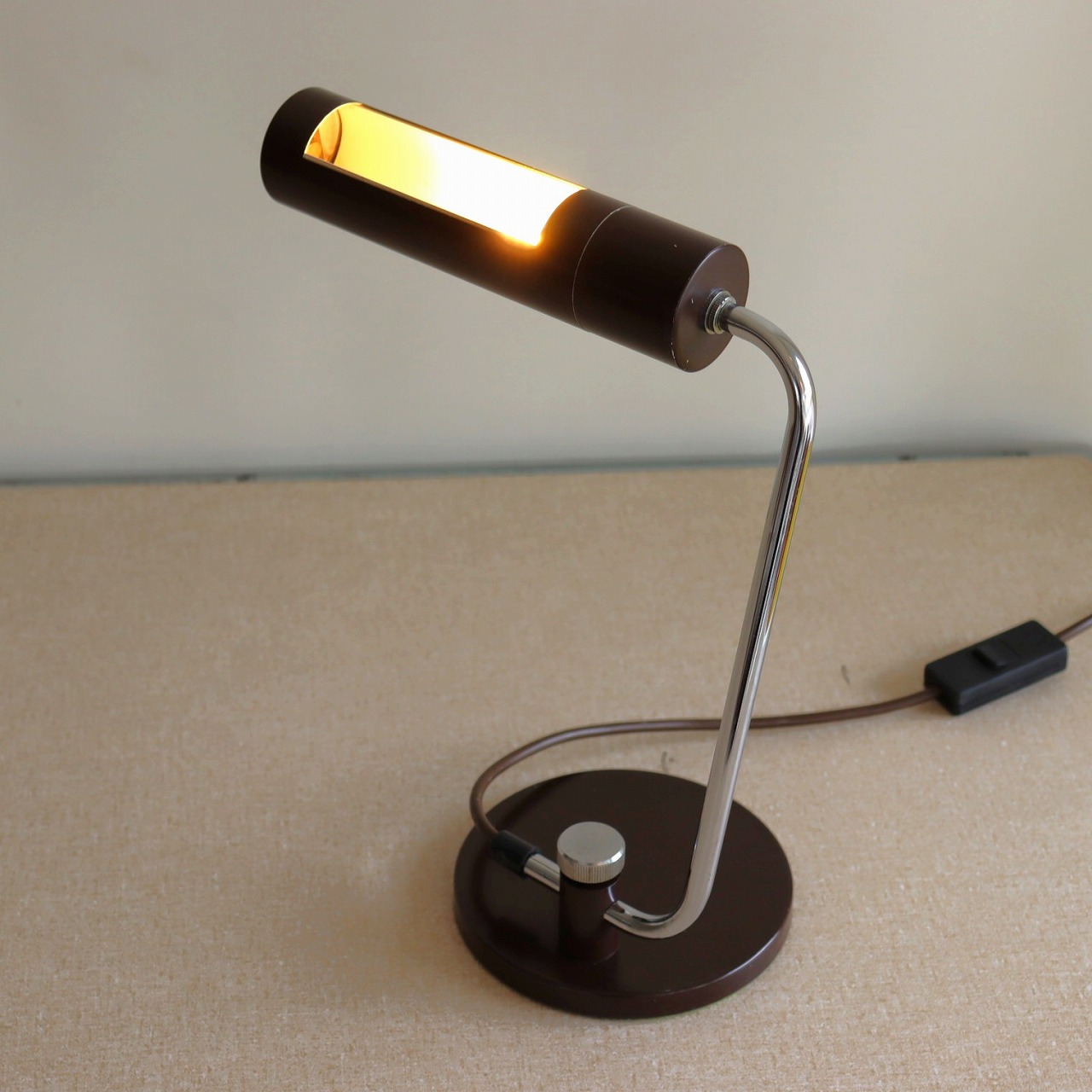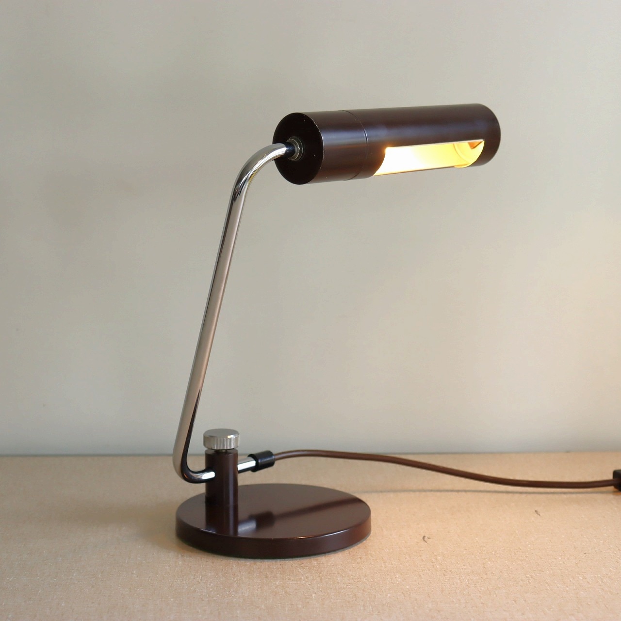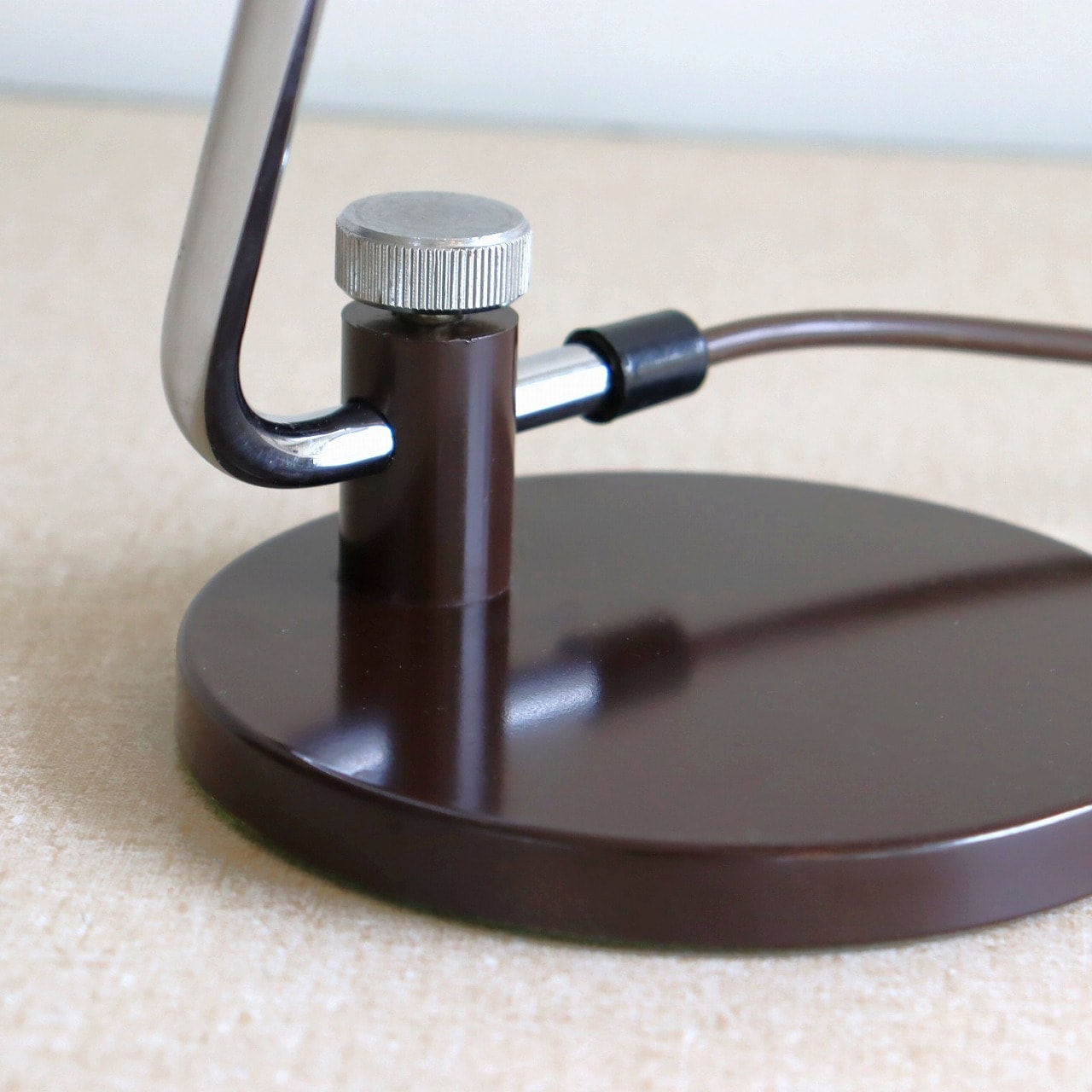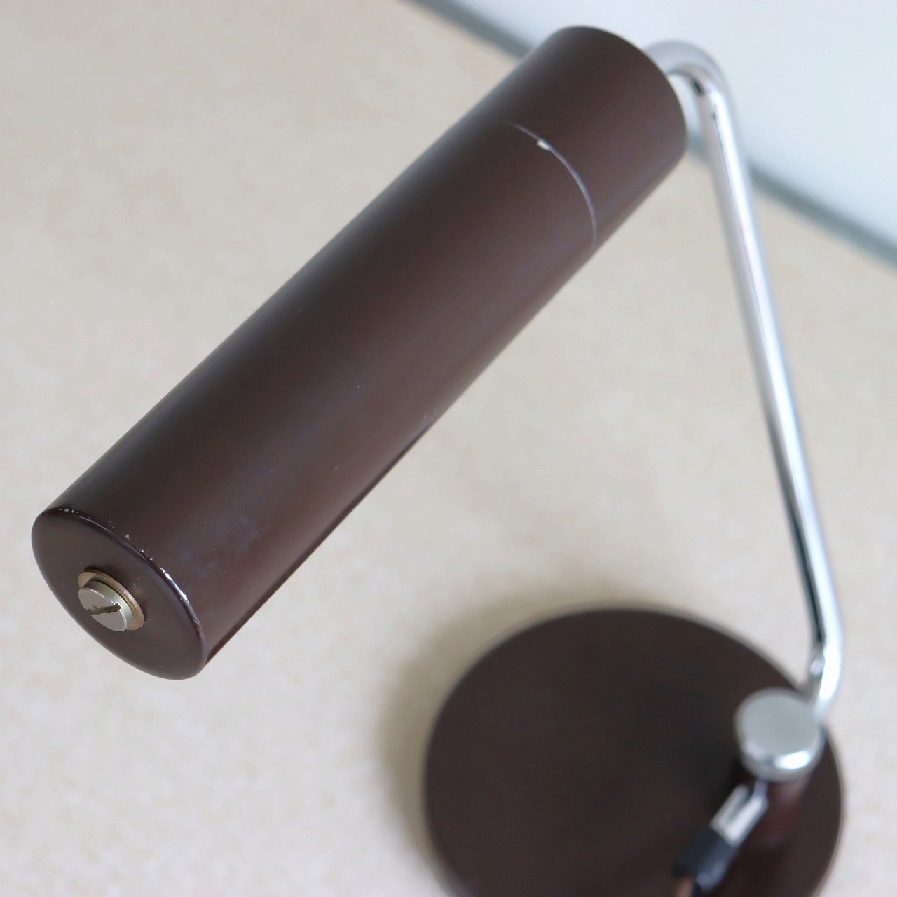 楕円のベース、クロームメッキのアームと筒状のシェードの組み合わせ。少し小ぶりの使いやすいサイズ感です。