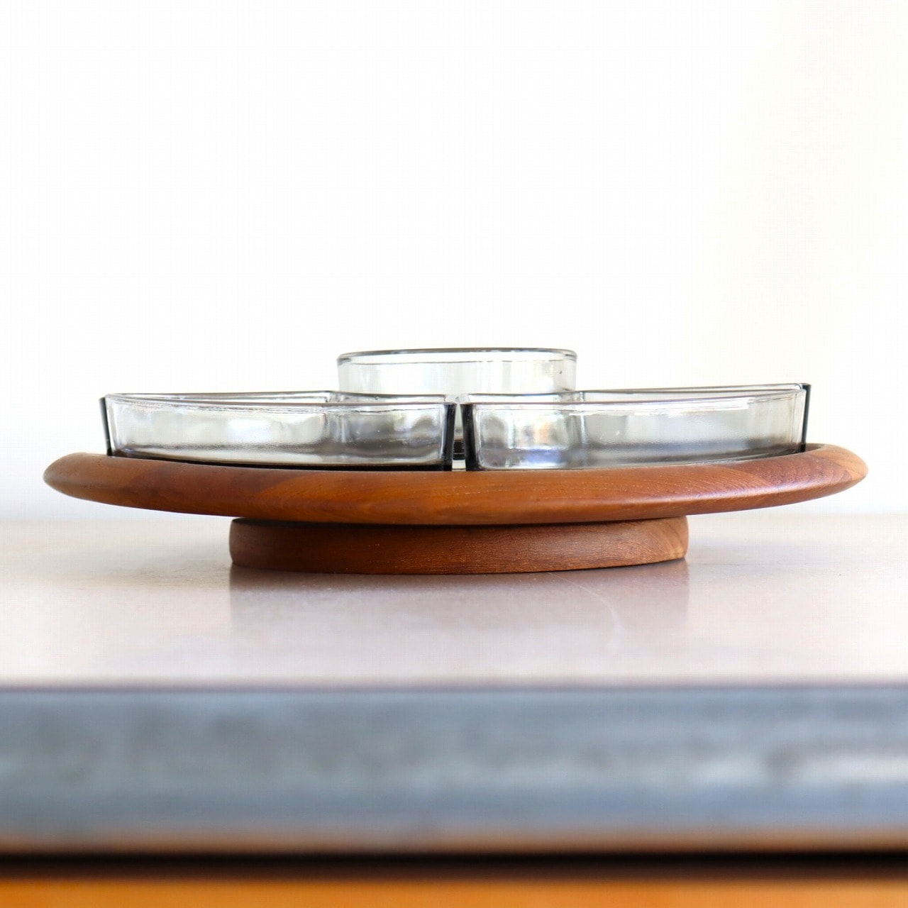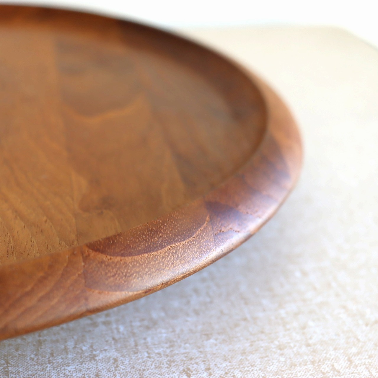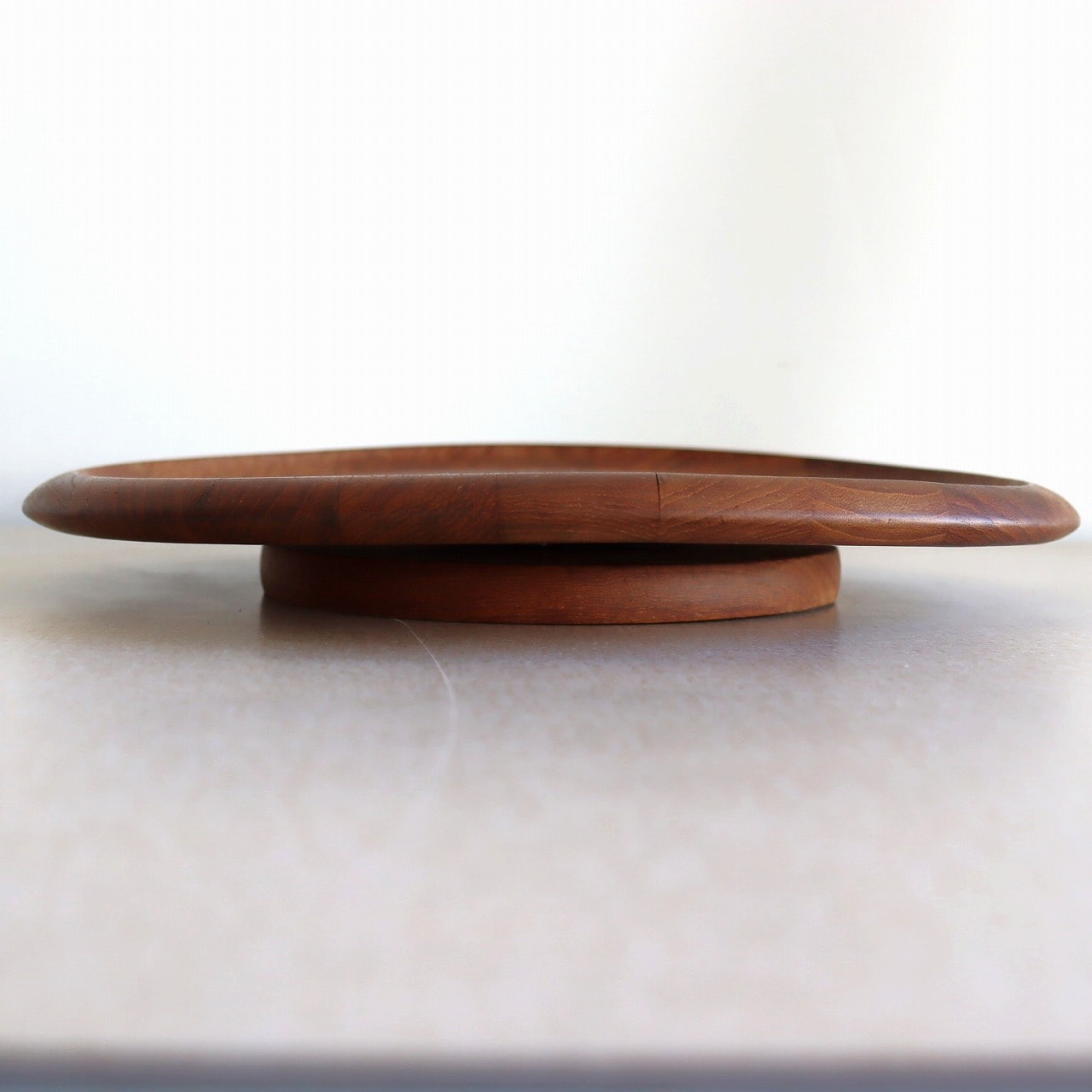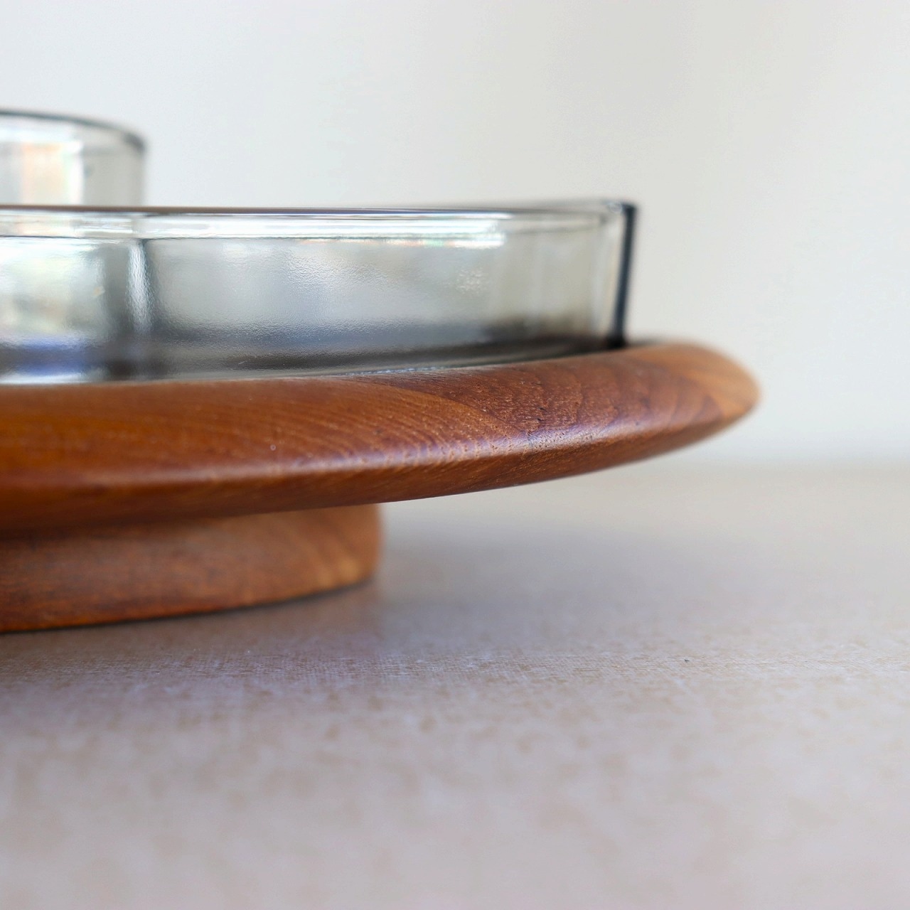 チーク材でできたウッドトレーは回転式で回すことが出来ます。無垢のトレーはチーク材の柔らかな雰囲気を存分に味わえます。内に入った台座はトレーが浮いているようなすっきりとした佇まい。