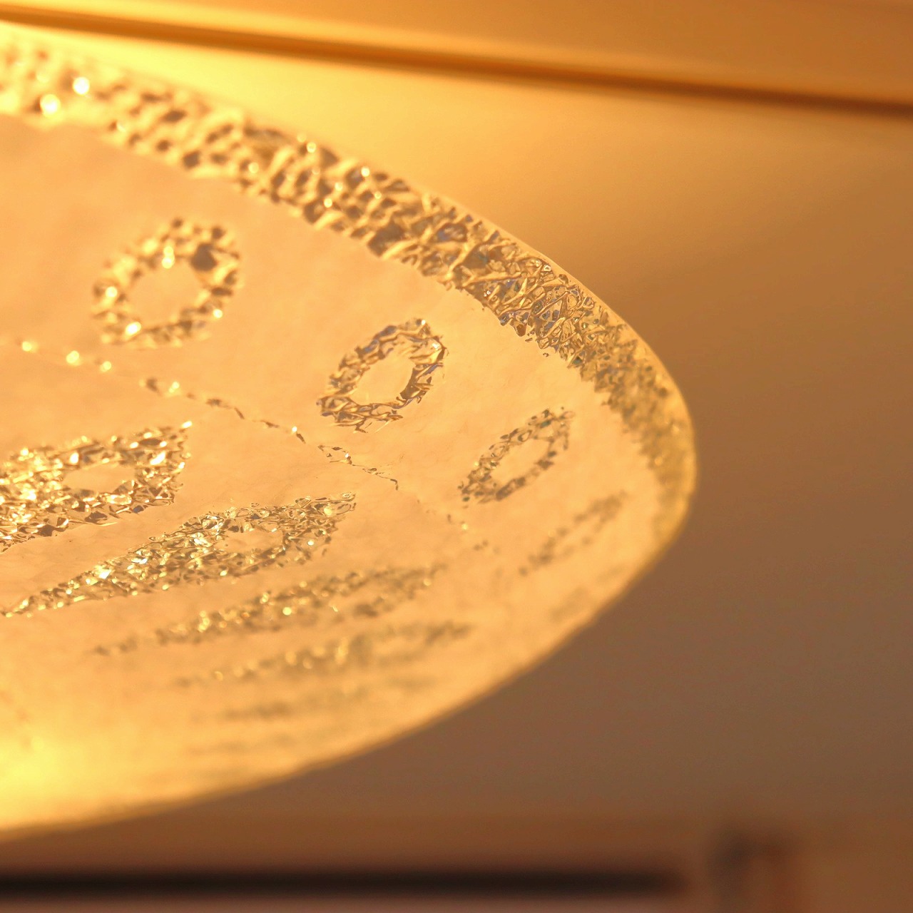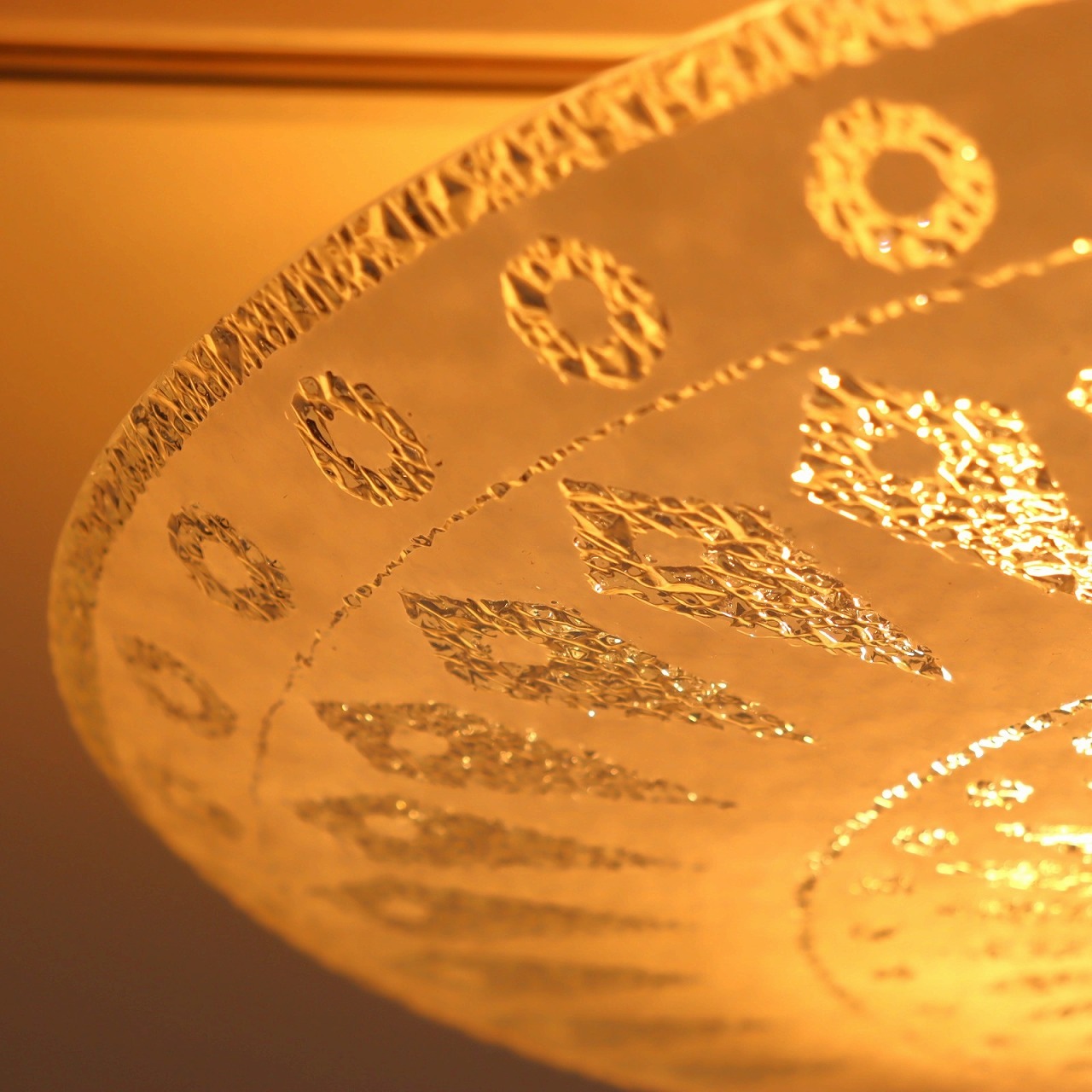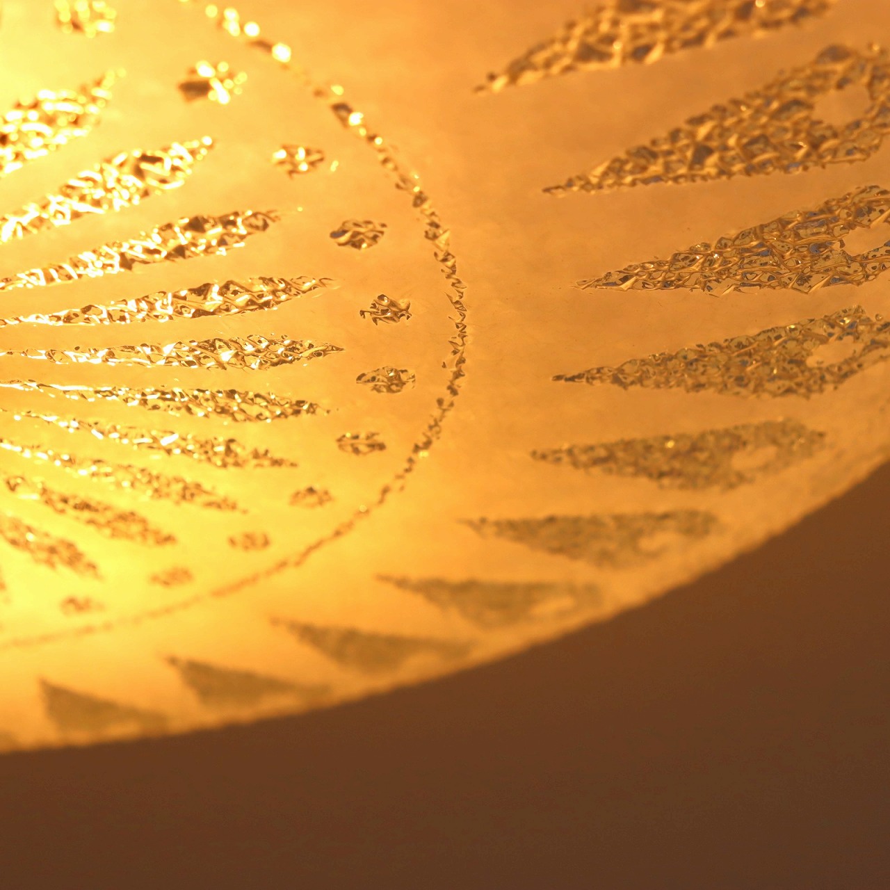 太陽や花などの有機的な美しさが感じられ、細かなエンボスが宝石のような輝きです。見る角度によって照明の陰影や奥行きが感じられます。