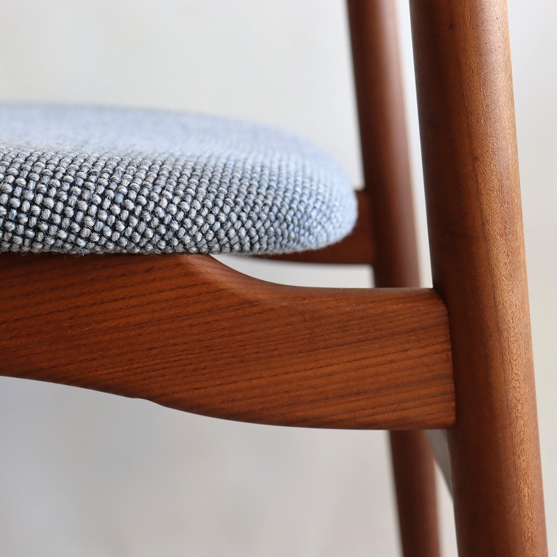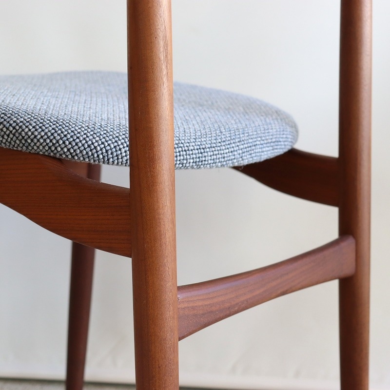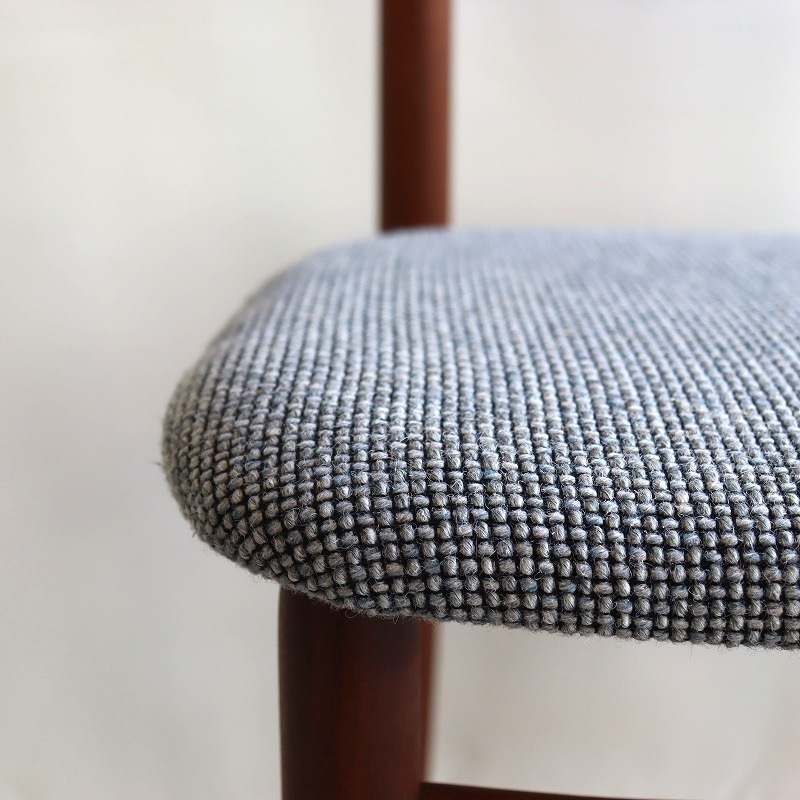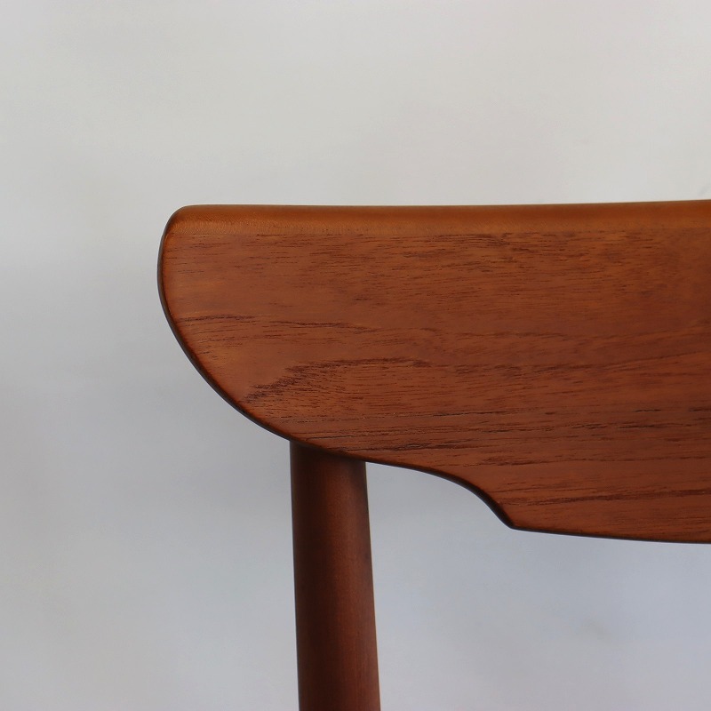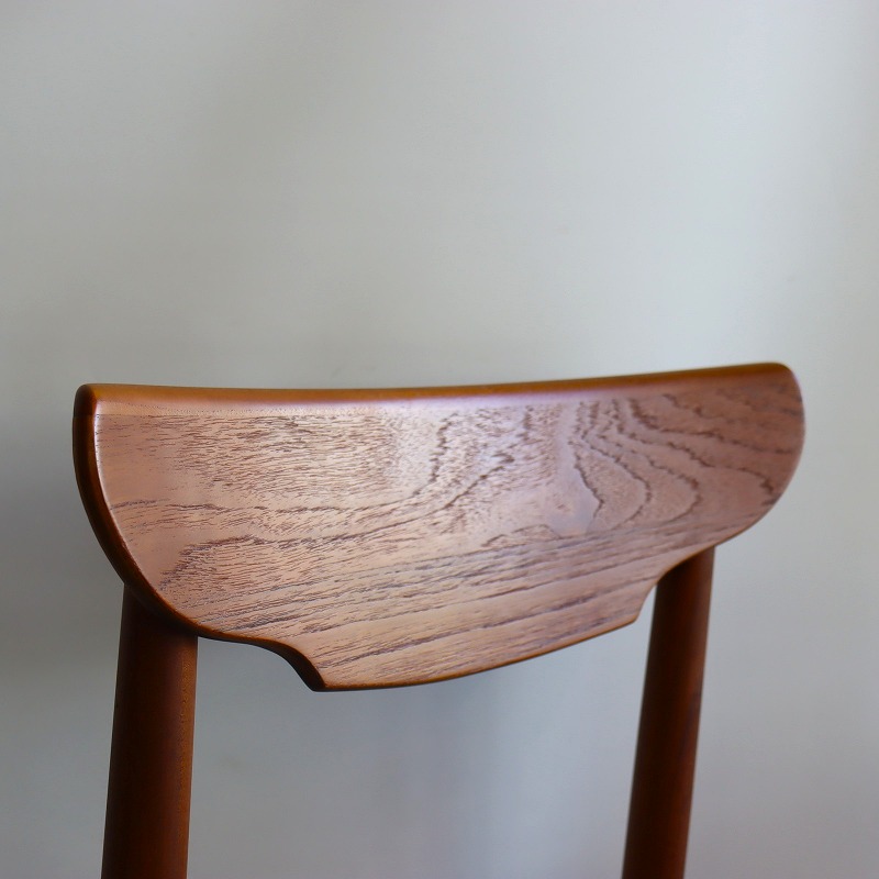 背もたれはチーク、座面はファブリックのダイニングチェア。トップが少し曲げられた手肌に沿うような背もたれで、身体に沿うように緩やかにカーブしています。背中のあたりや居心地は着席時間と比例するくらいデザインが重要になります。