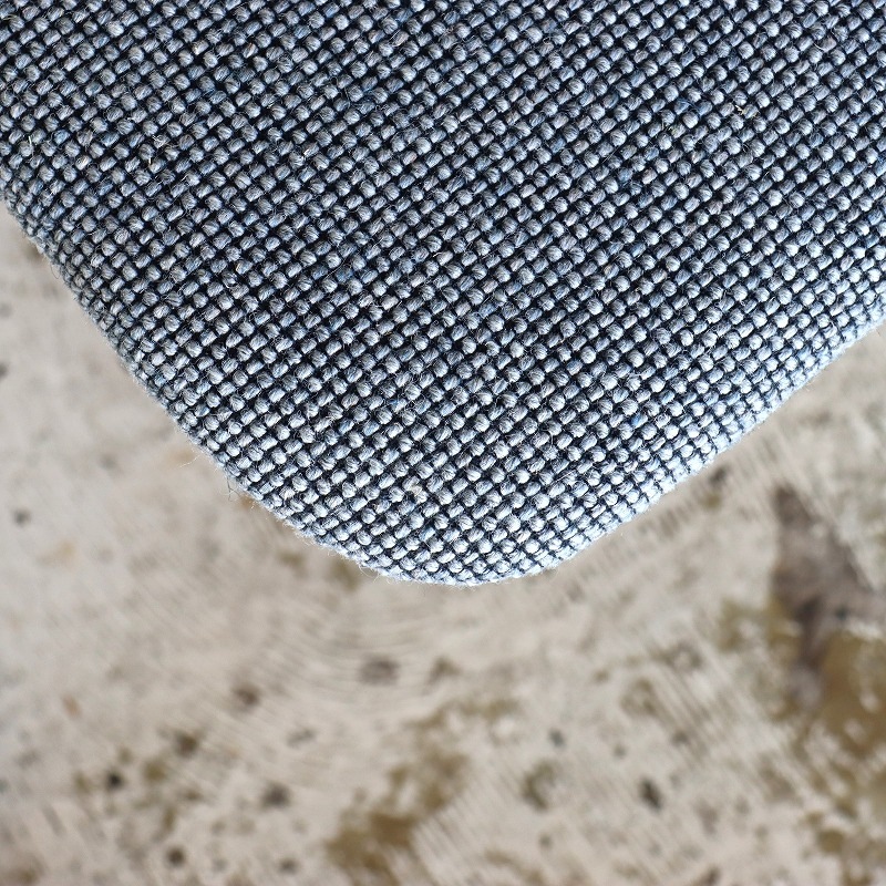 生地は張り替え済み。ホワイトとブルーの配色で、ぽこぽこと立体感のある生地がビンテージフレームとよく合っています。光の当たり具合で見え方も変わってきます。チーク材の柔らかい風合いとあたたかな雰囲気も素敵。