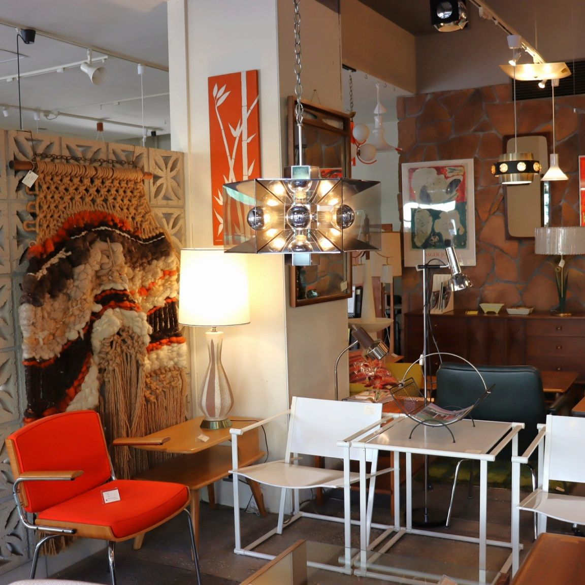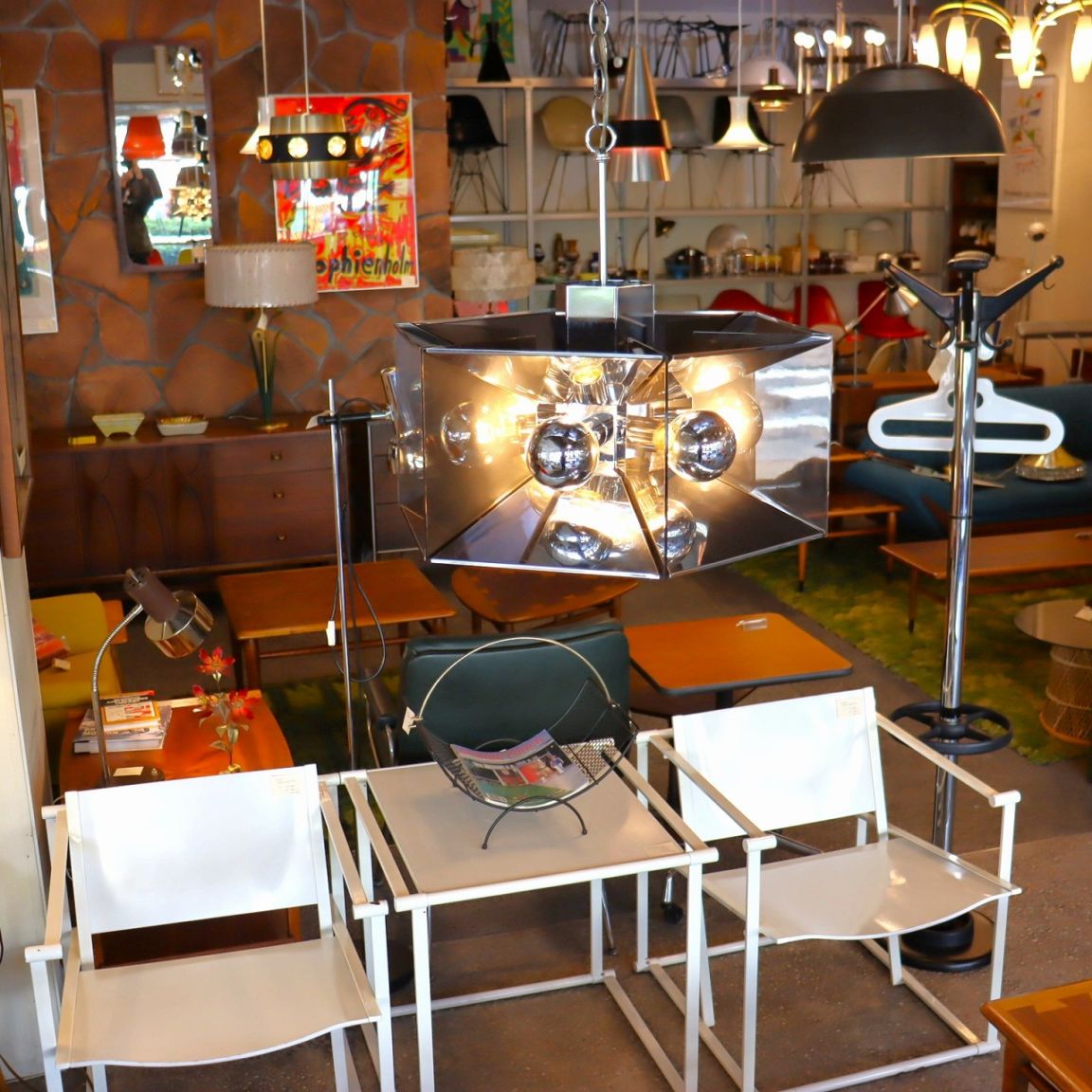 アトミックペンダントランプ。六角形の幾何学的なデザインのクロームメッキ製のペンダントライト。パーツの類似からフレデリック・レイモンドのデザインと推測します。
