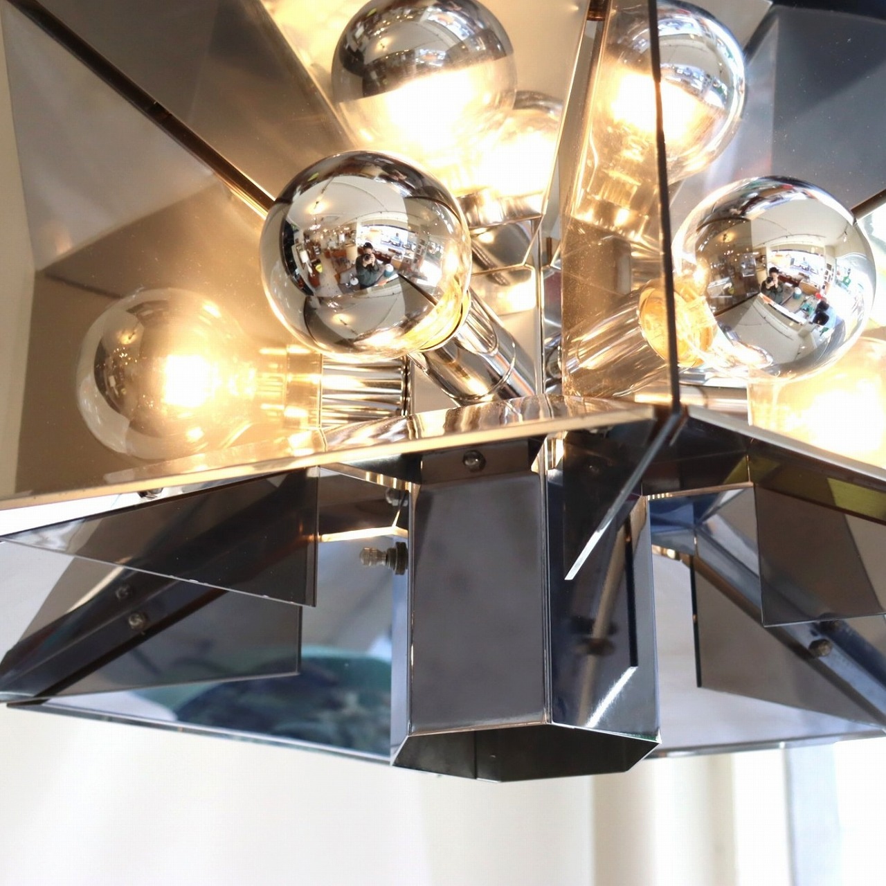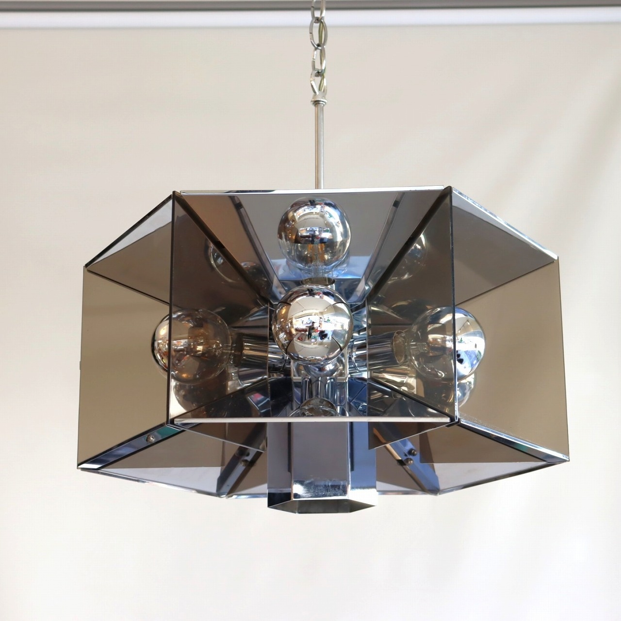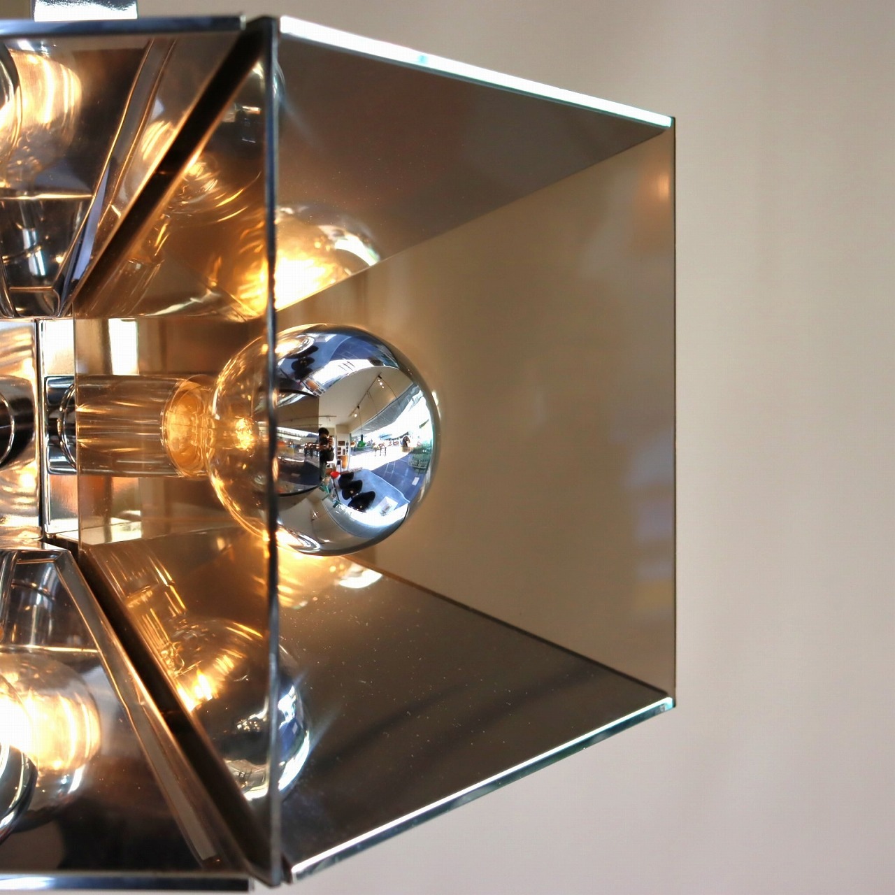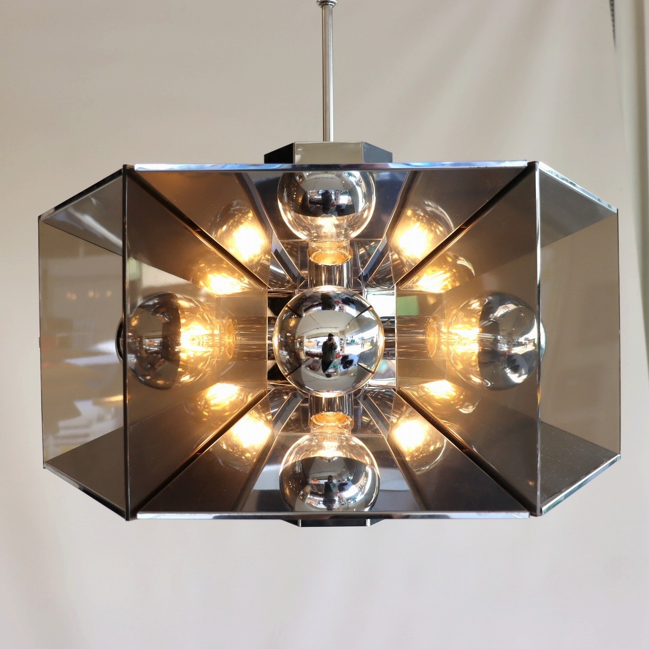照明内部には放射状に6個ランプが付いています。上下がステンレス、左右はスモークアクリルでシェードで構成されており、電球が反射と透過を繰り返し、ずっと見ていられる魅力があります。ランプ中央からが1灯下面を照らしているので、明るさも十分でね。