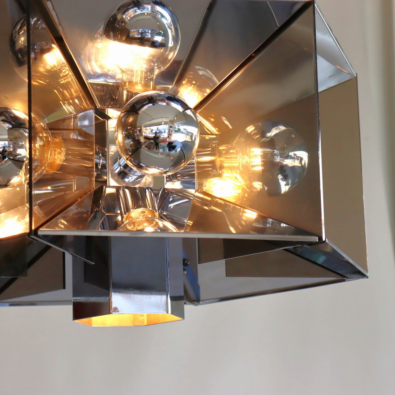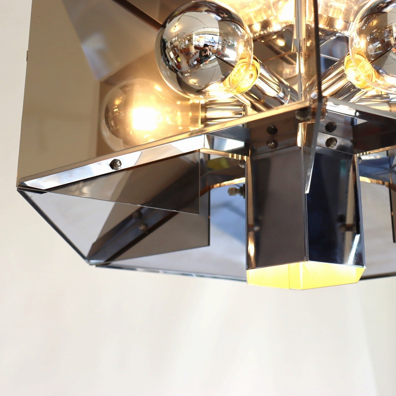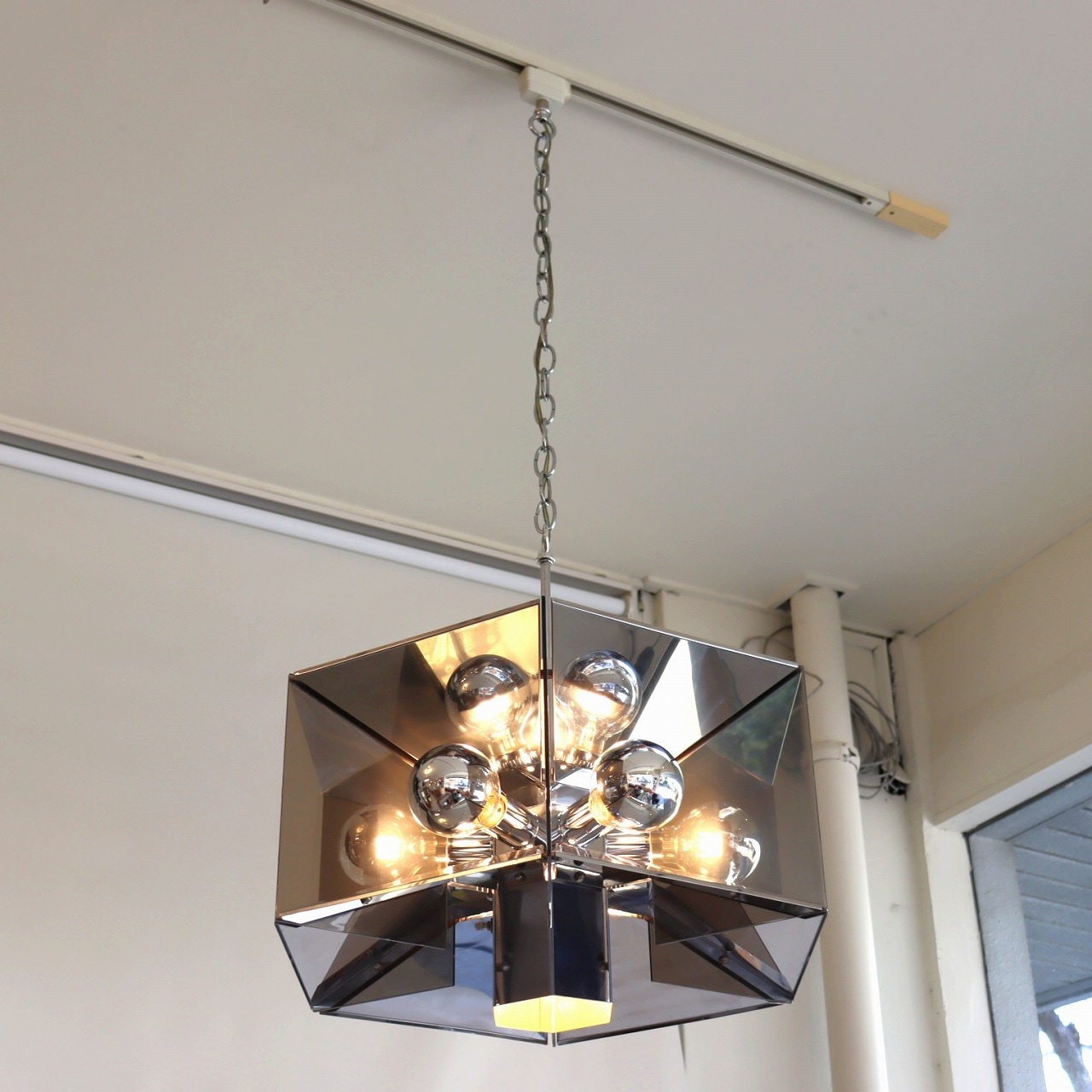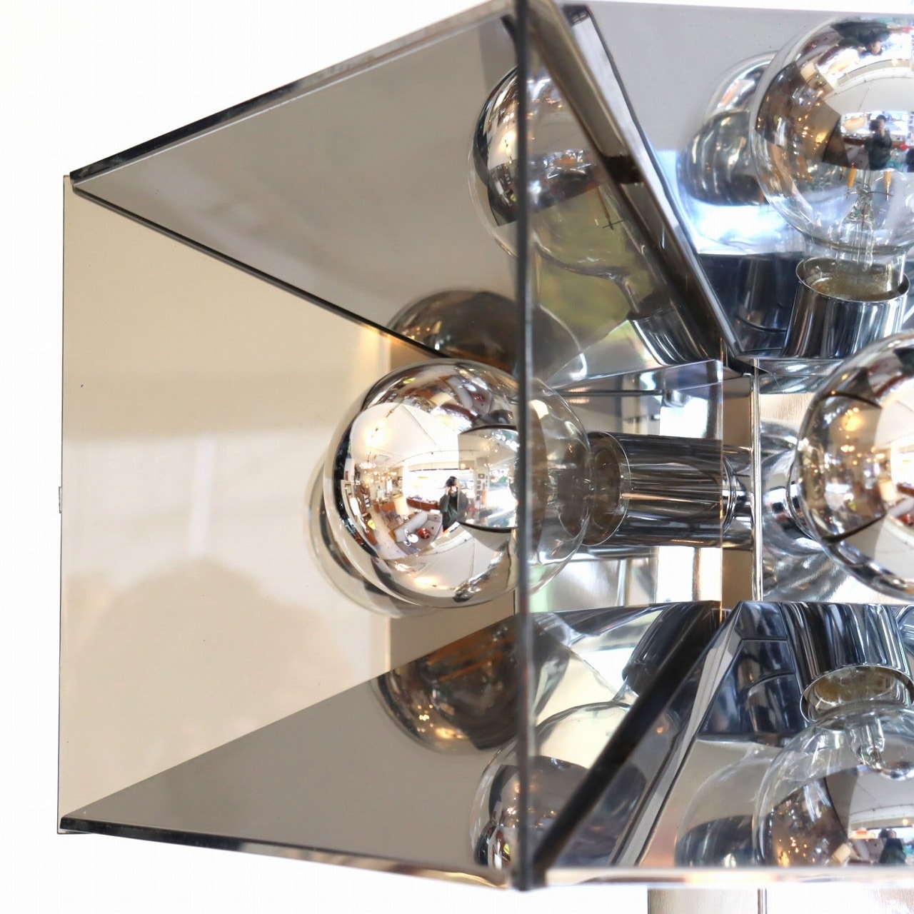 照明内部には放射状に6個ランプが付いています。上下がステンレス、左右はスモークアクリルでシェードで構成されており、電球が反射と透過を繰り返し、ずっと見ていられる魅力があります。ランプ中央からが1灯下面を照らしているので、明るさも十分でね。