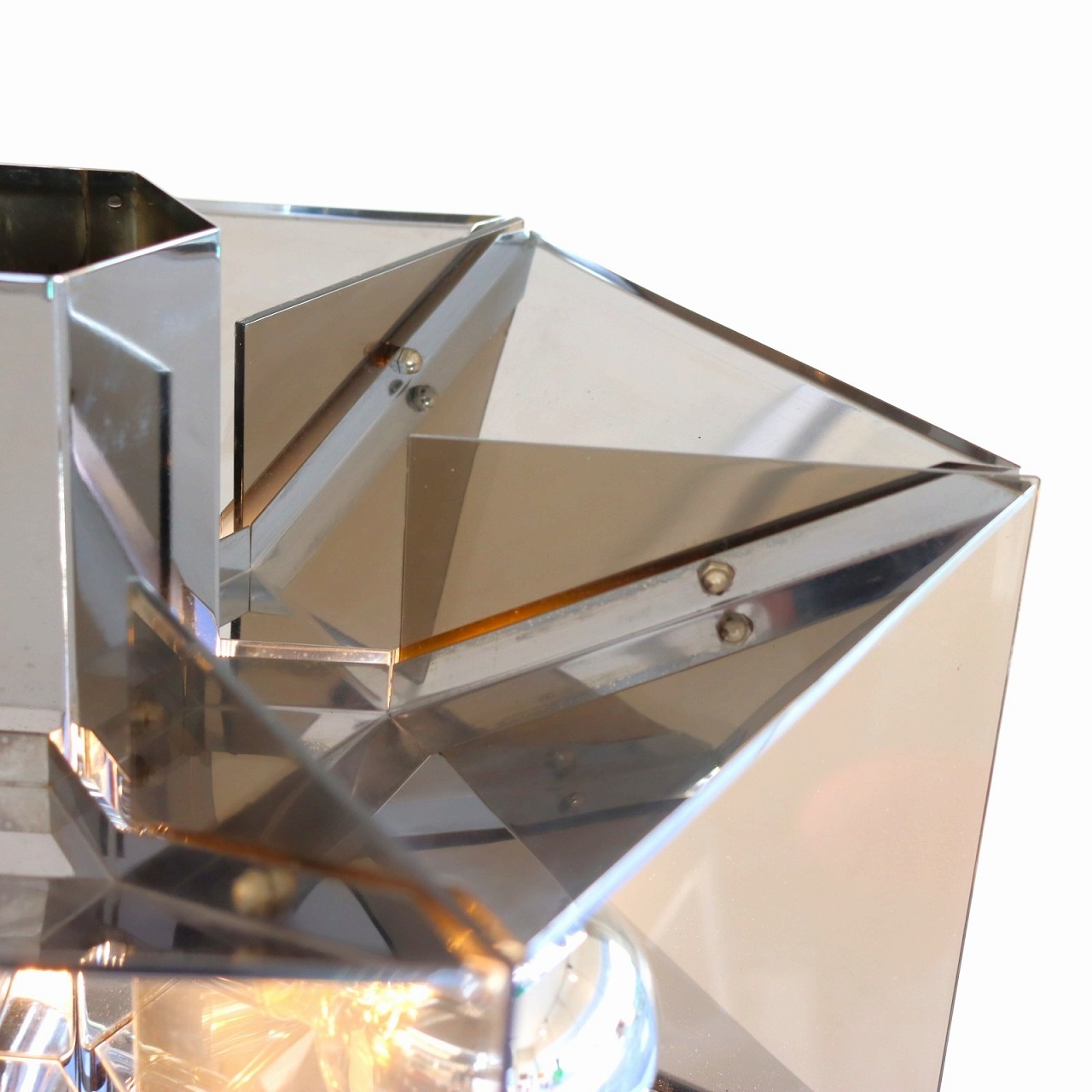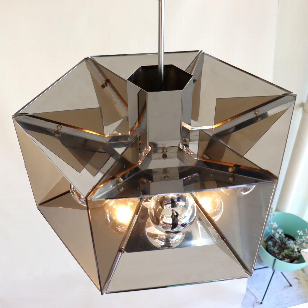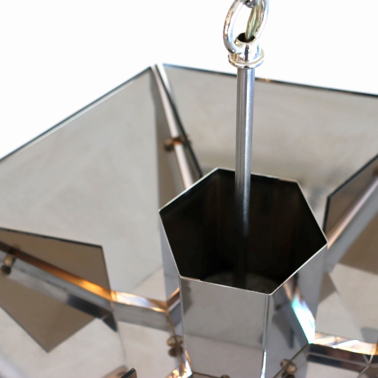 6角形のシルエットで、クロームメッキとスモークアクリルの組み合わせでシェードが構成されたデザイン。クロームメッキの表面は鏡のように背景や照明の灯りを映り込ませるので、万華鏡のような煌びやかで魅力的な雰囲気です。