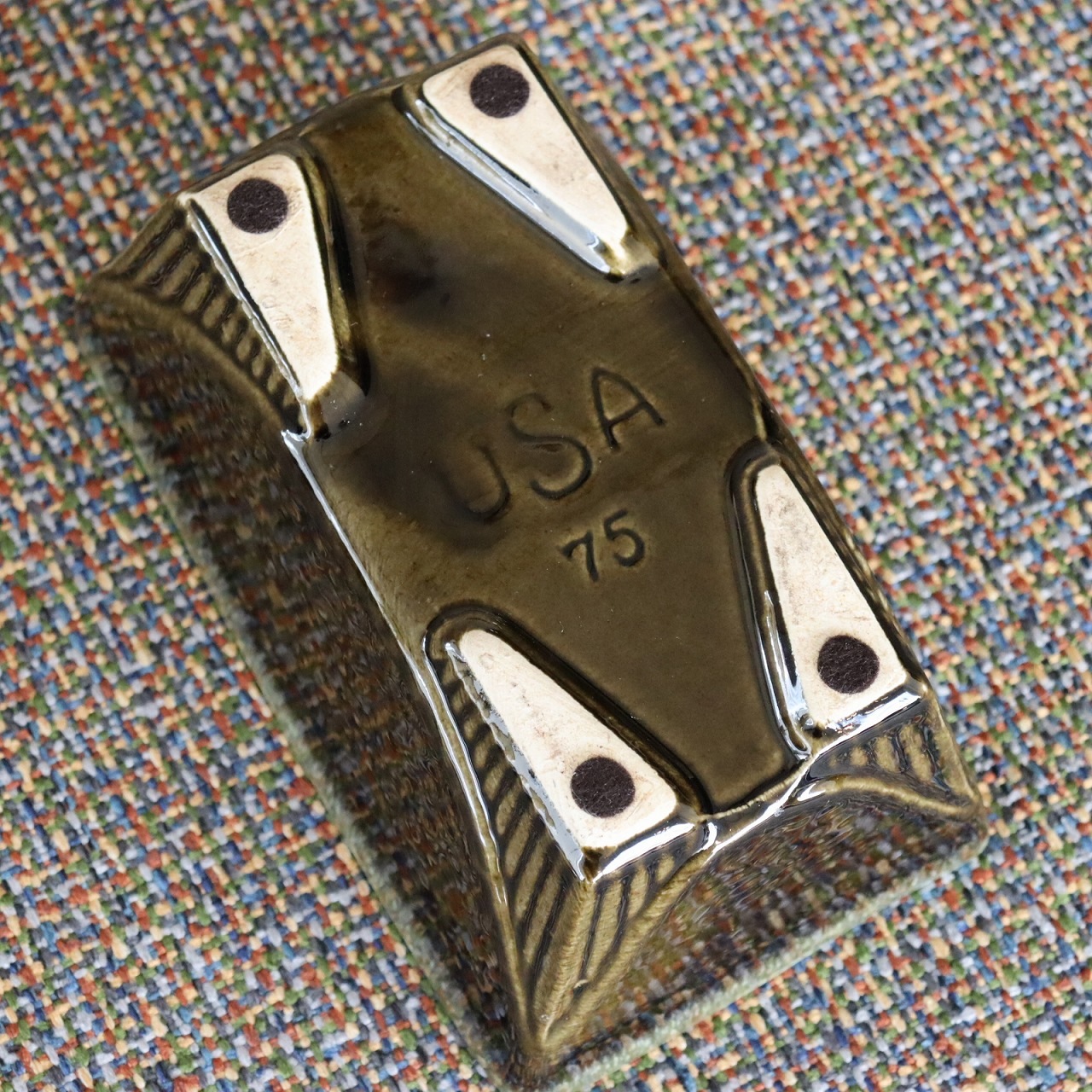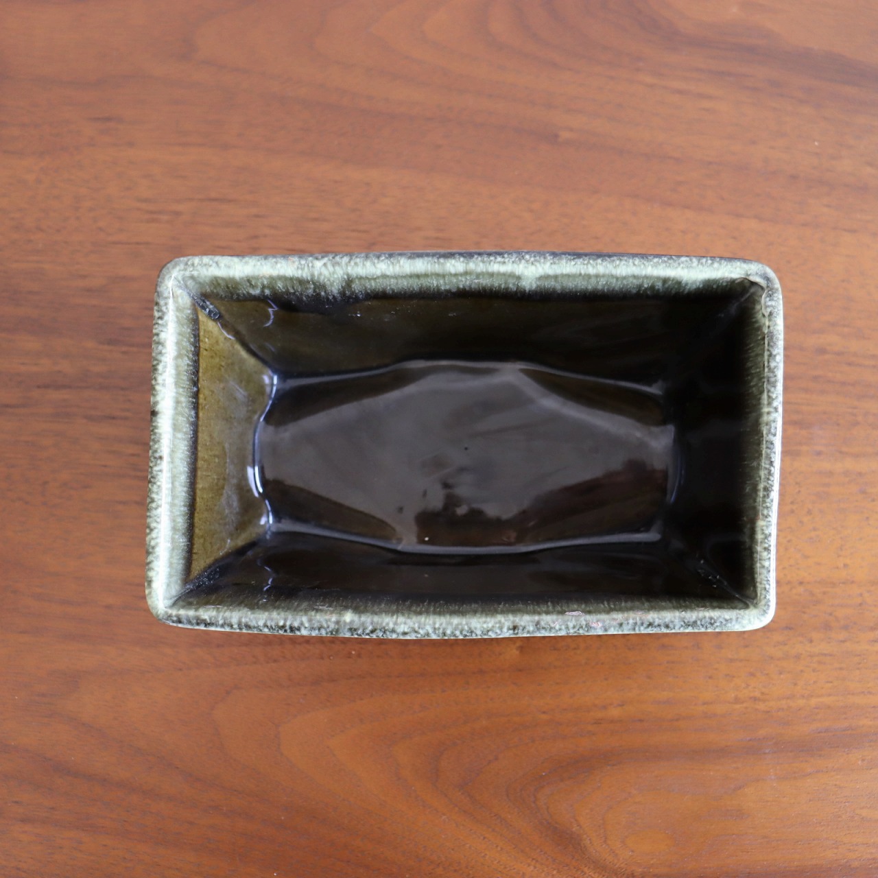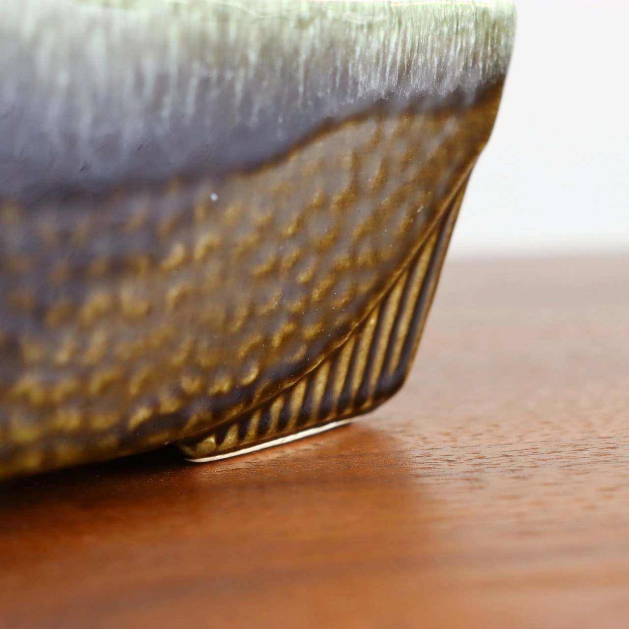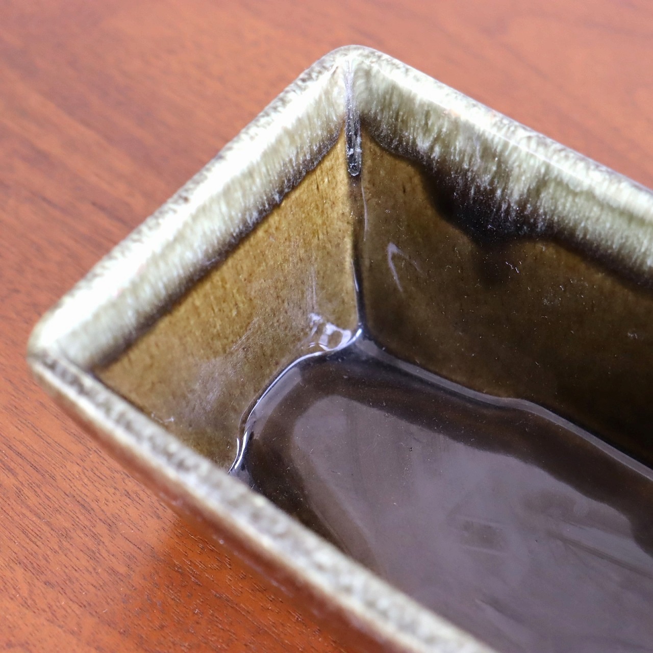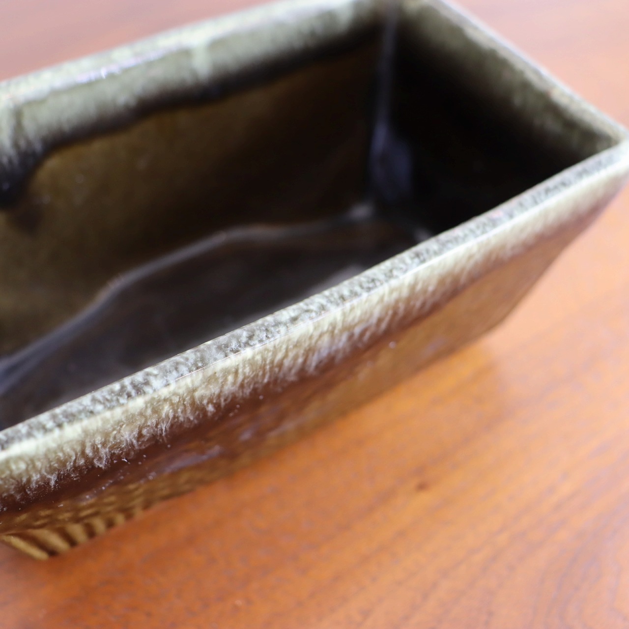 ブラウンとグリーンが混ざったような深みのある色合いで、釉薬の混ざりやグラデーションが特徴的です。
