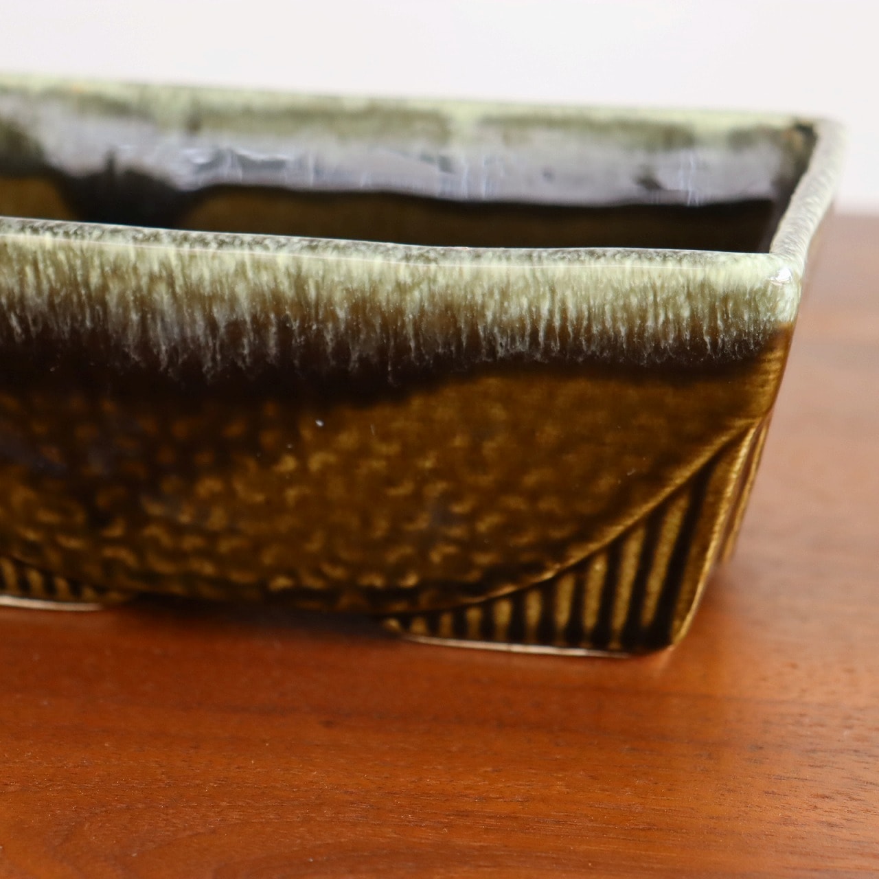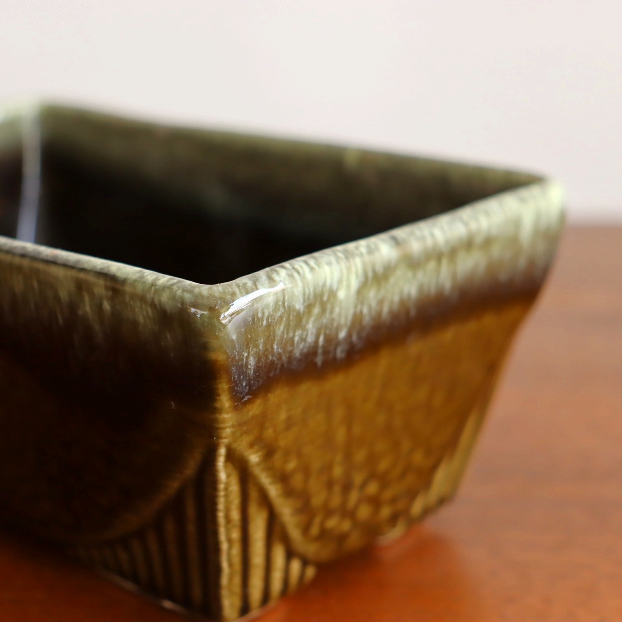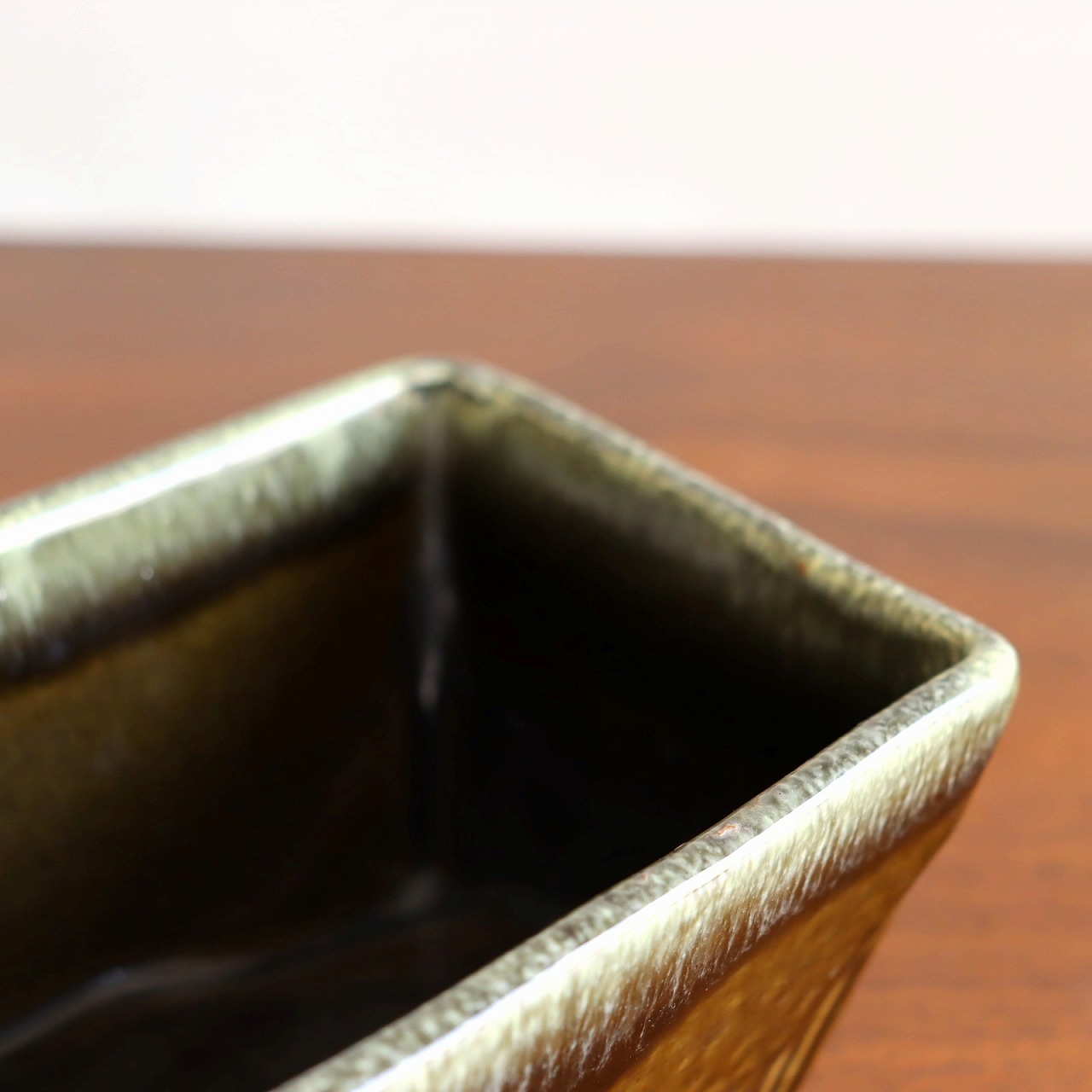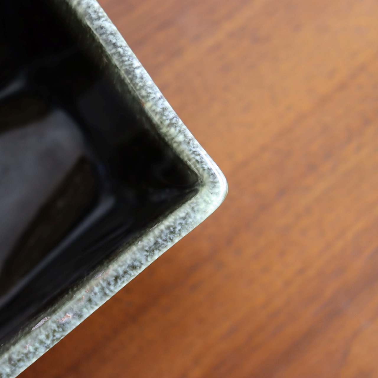 シンプルな長方形のフォルムで、上に向かって開口が広がっているつくり。深みもあり、ちょうどいい大きさで控え目な台座も可愛らしいです。四隅をつなぐようなストライプのラインにリズムが感じられます。