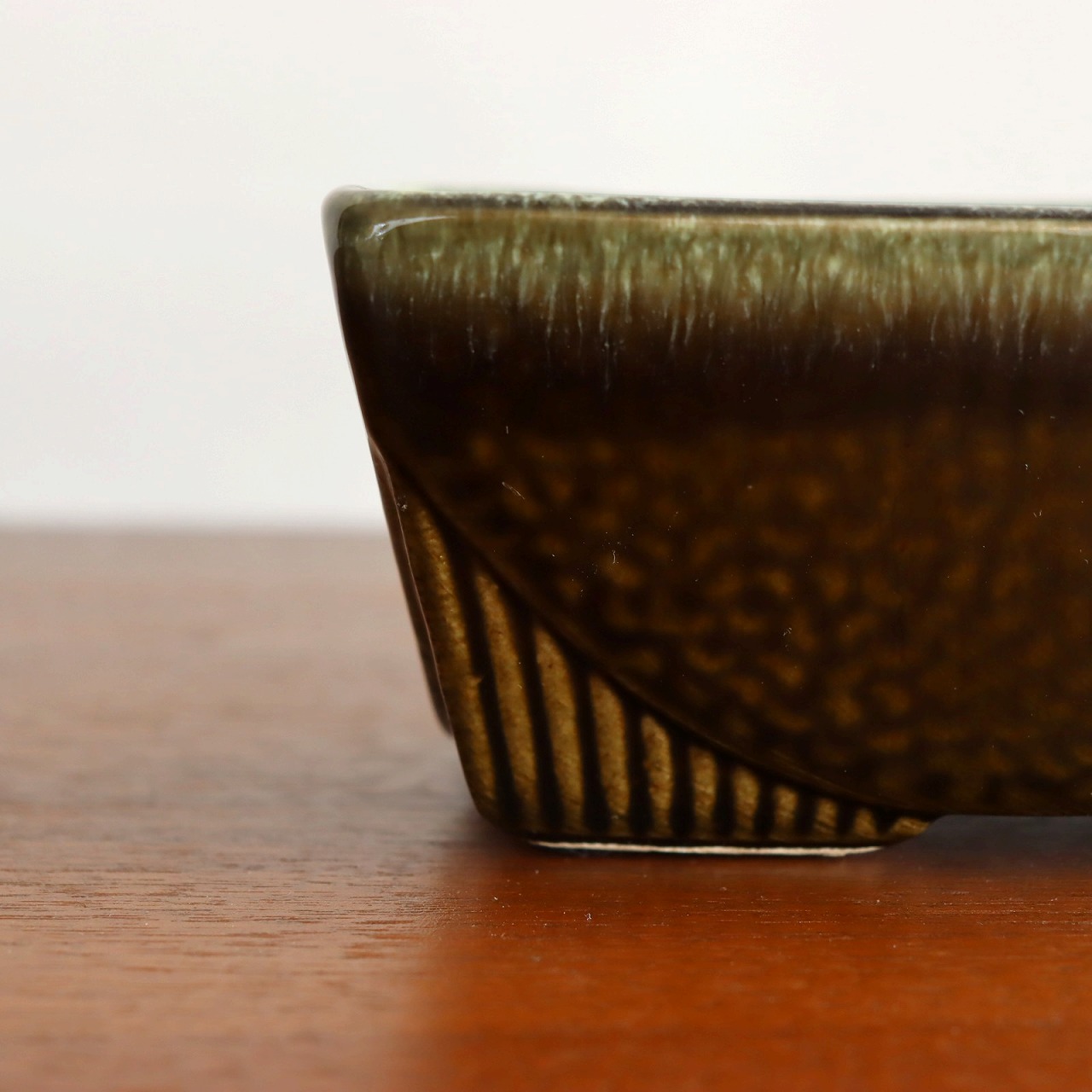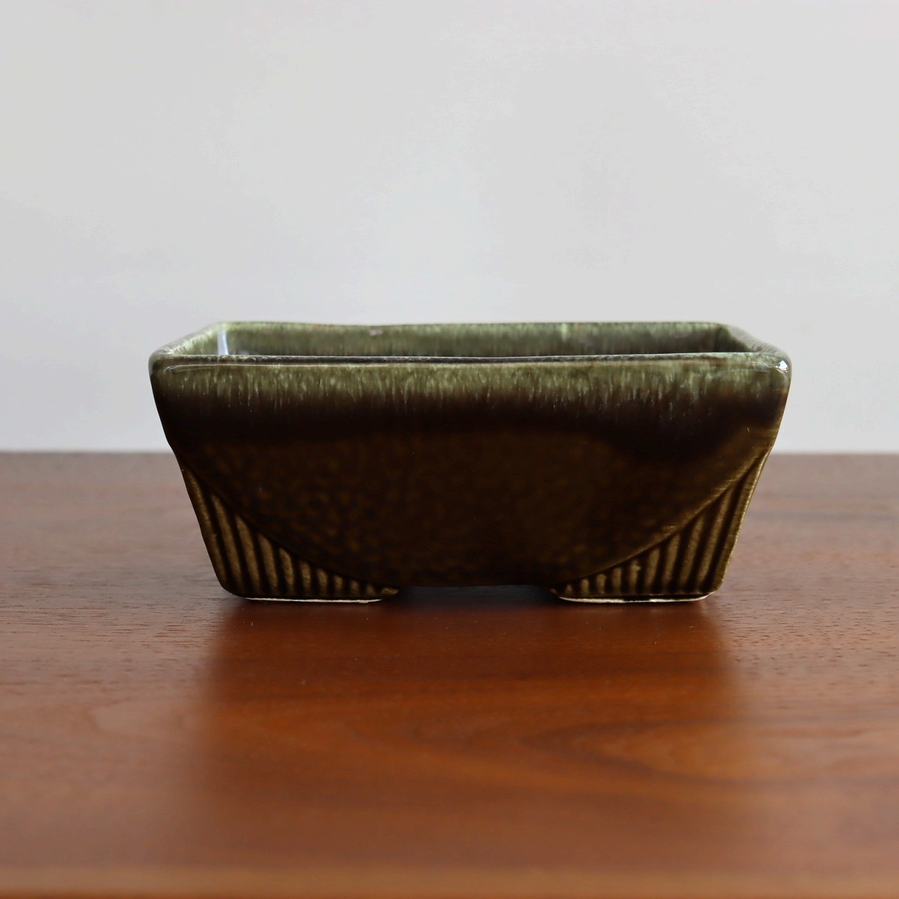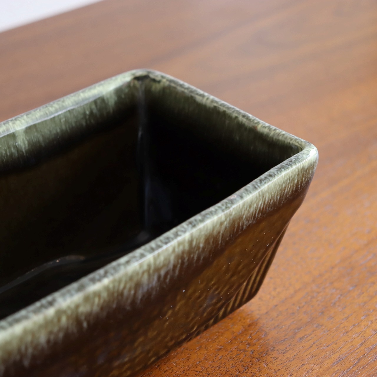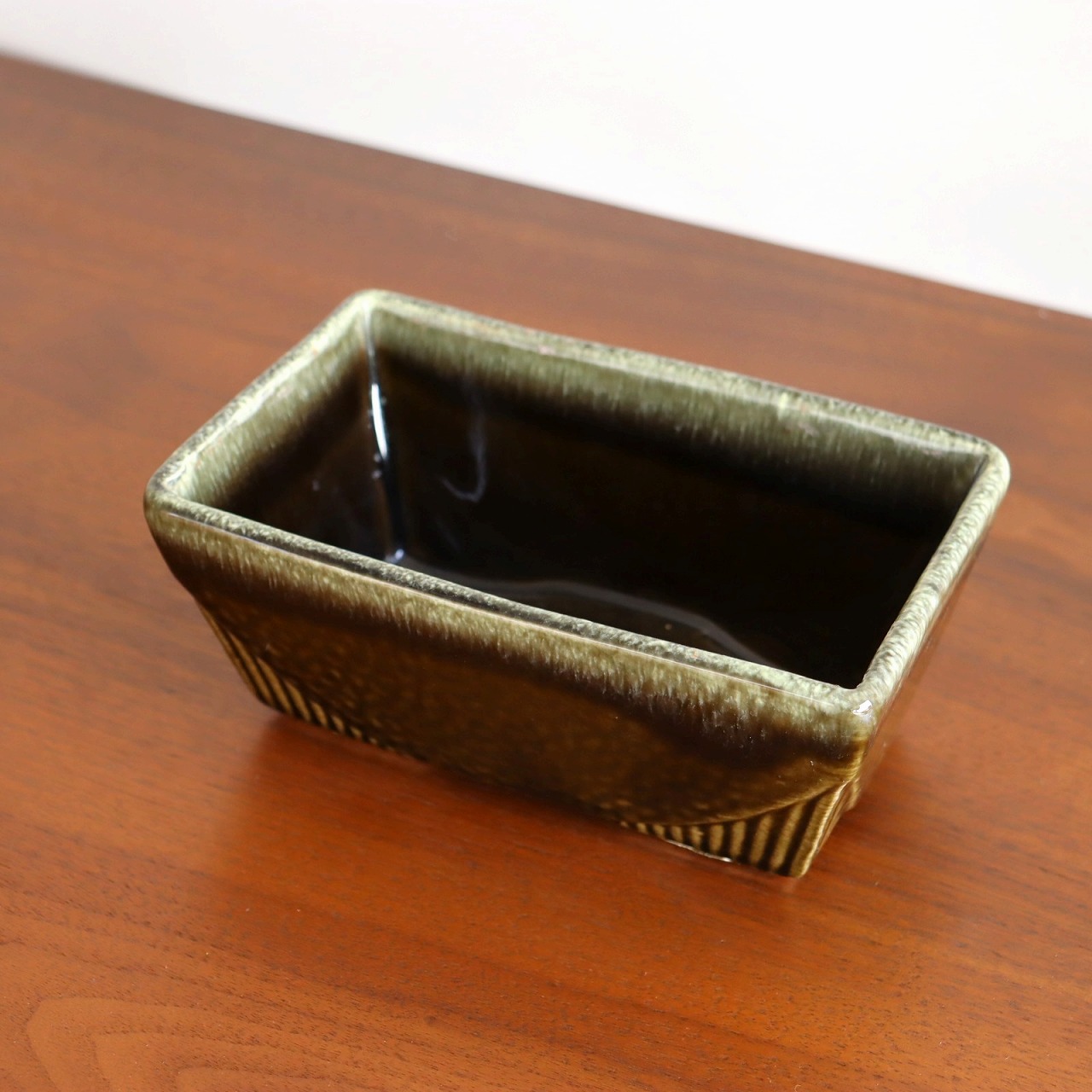 シンプルな長方形のフォルムで、上に向かって開口が広がっているつくり。深みもあり、ちょうどいい大きさで控え目な台座も可愛らしいです。四隅をつなぐようなストライプのラインにリズムが感じられます。