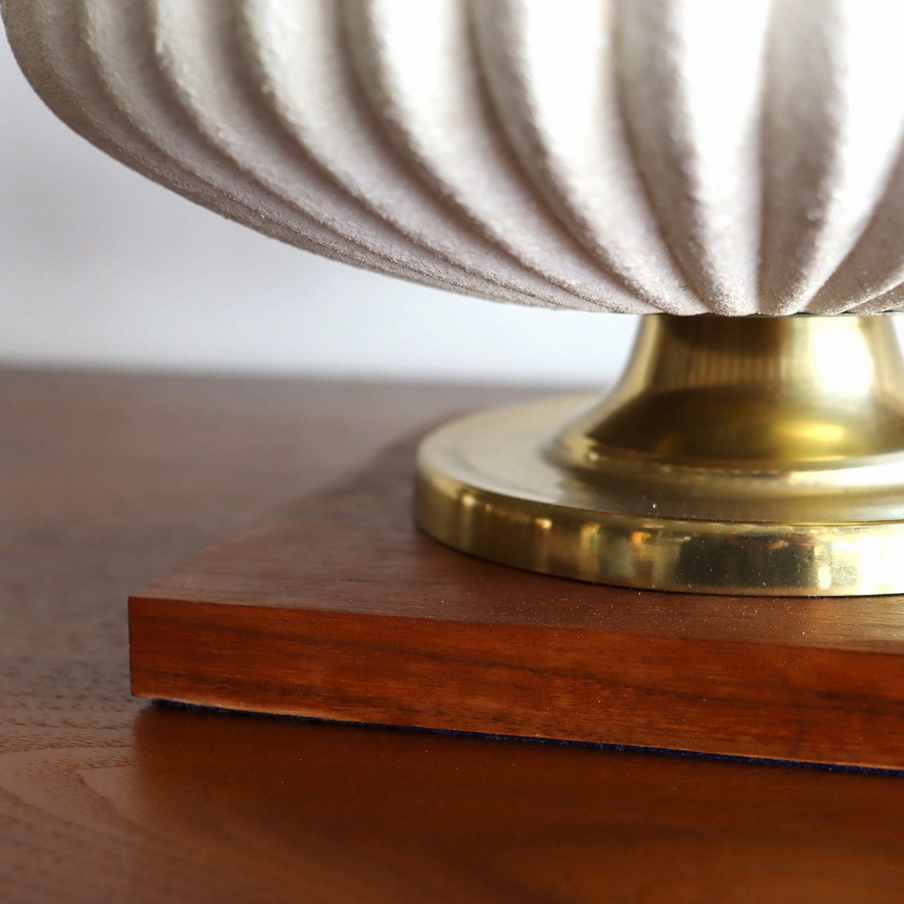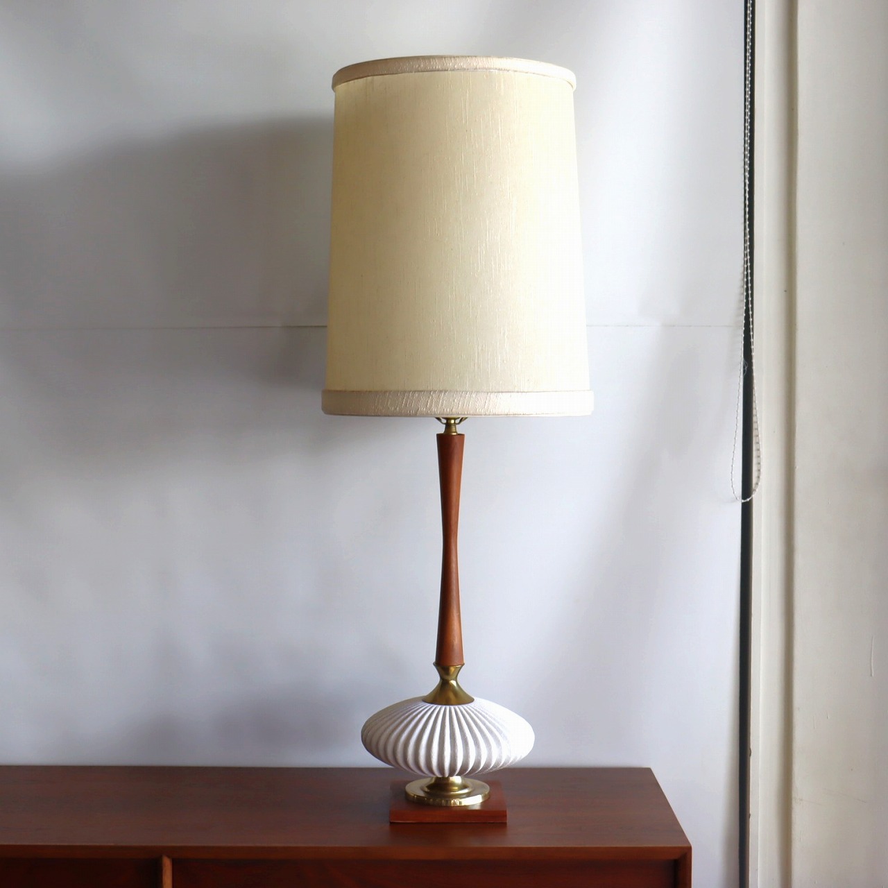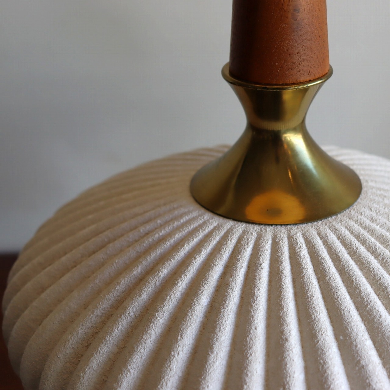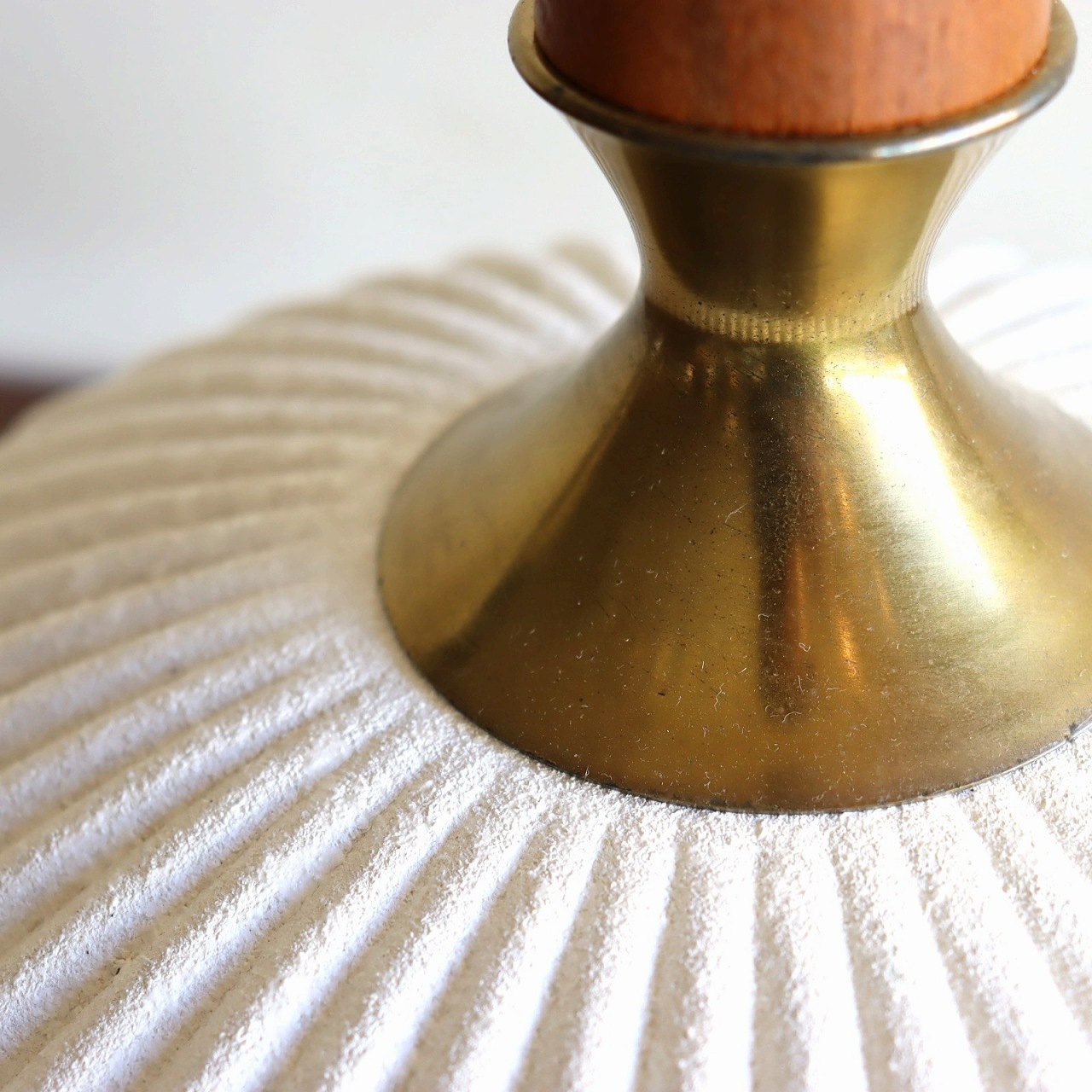 すらっと縦に伸びたウォールナットの支柱が特徴的で、少し大きめのサイズは存在感抜群です。エンボスがかかった白い陶器製の本体と真鍮のパーツで組み合わせたつくりです。