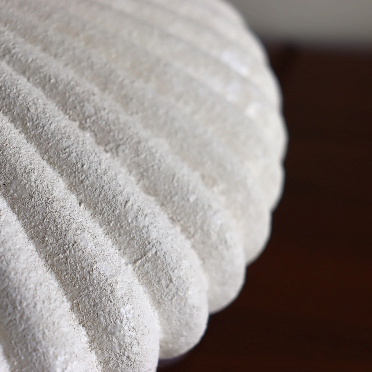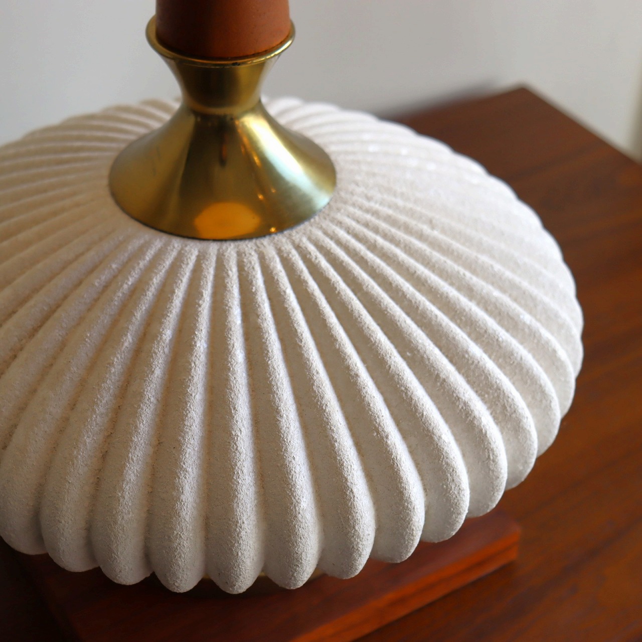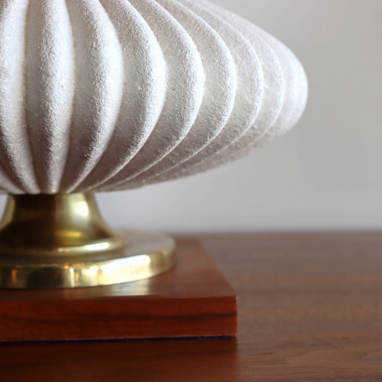 楕円形の陶器には放射状に伸びたリブのデザインが施され、まるで和菓子(落雁)のようです。立体的で陰影がとても美しく、凹凸にかかる陰影がランプに奥行きをもたせています。