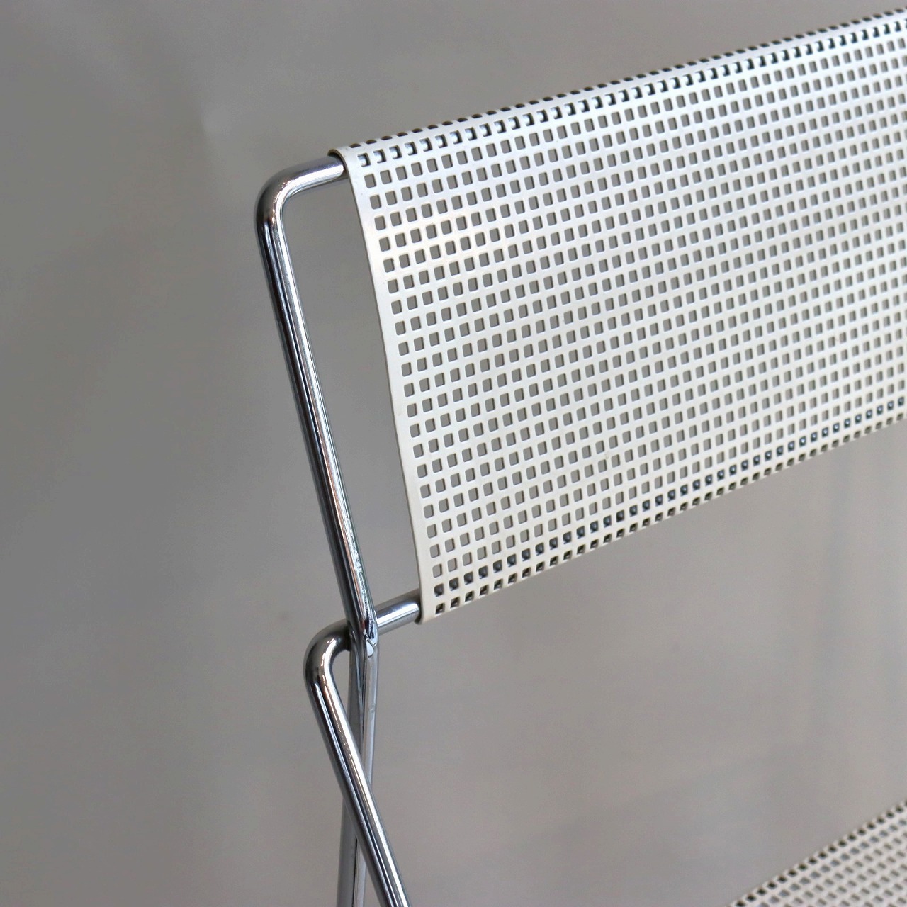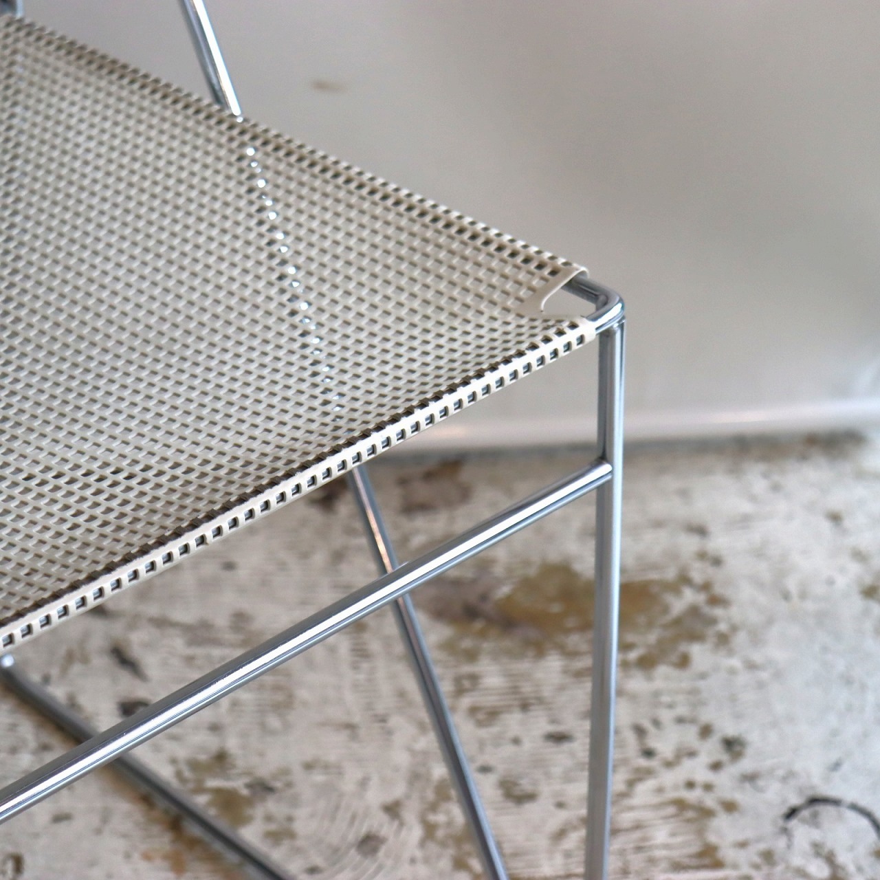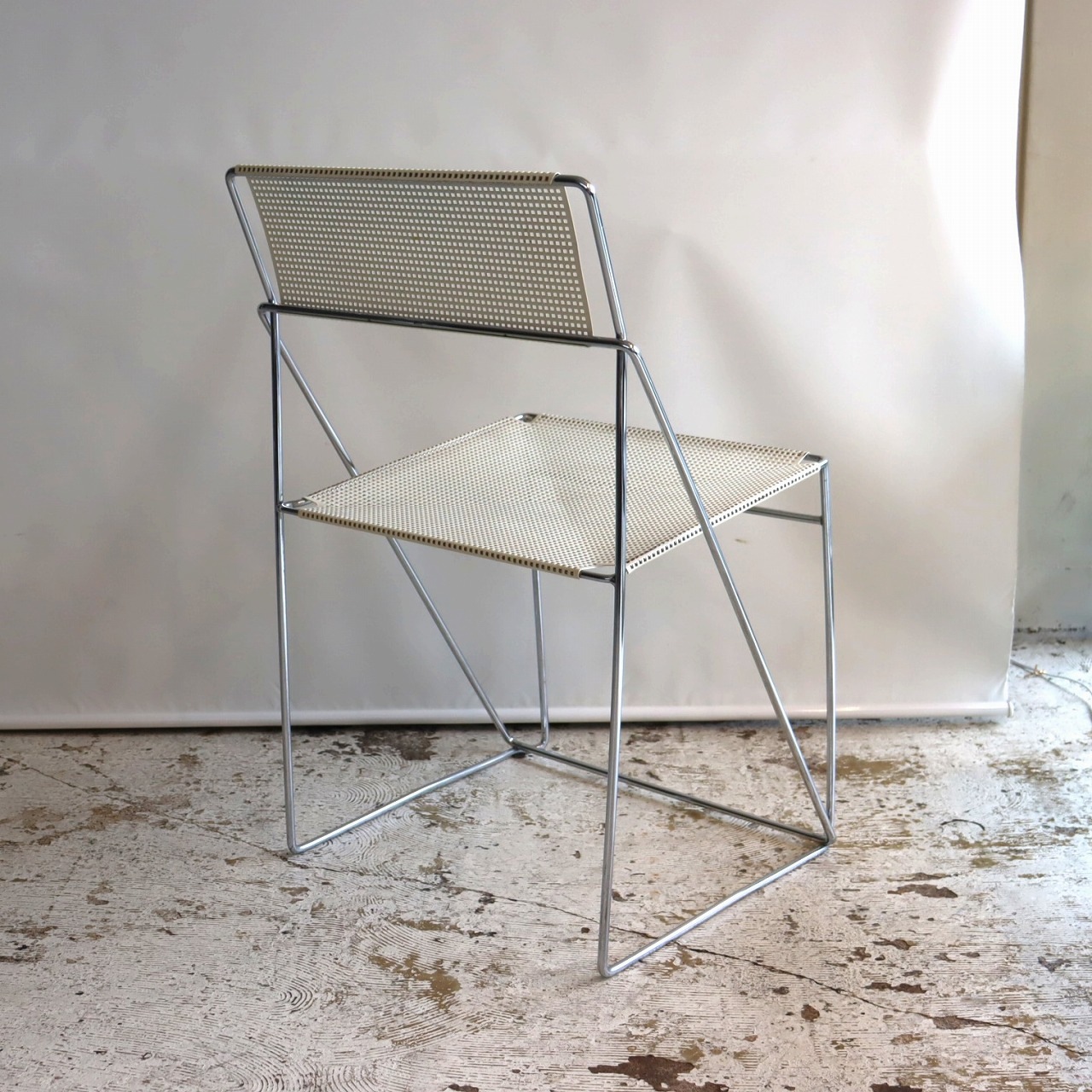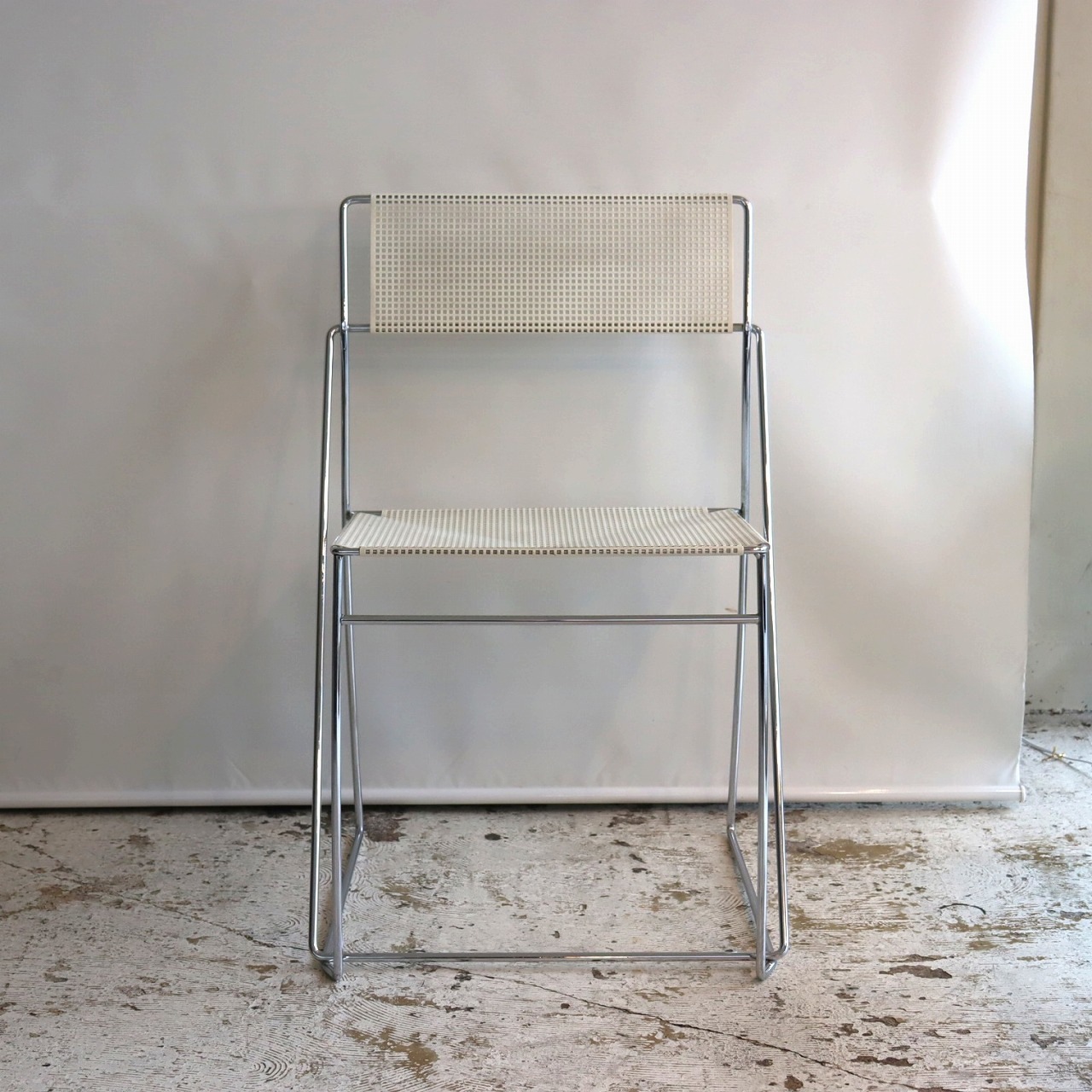 座面・背もたれの素材はスチール製。細い脚のクロスしたXの構造で強度を保ちながらも、パンチングの開けられた座面と背もたれがとても軽やかです。色はホワイト。とても爽やかな印象です。