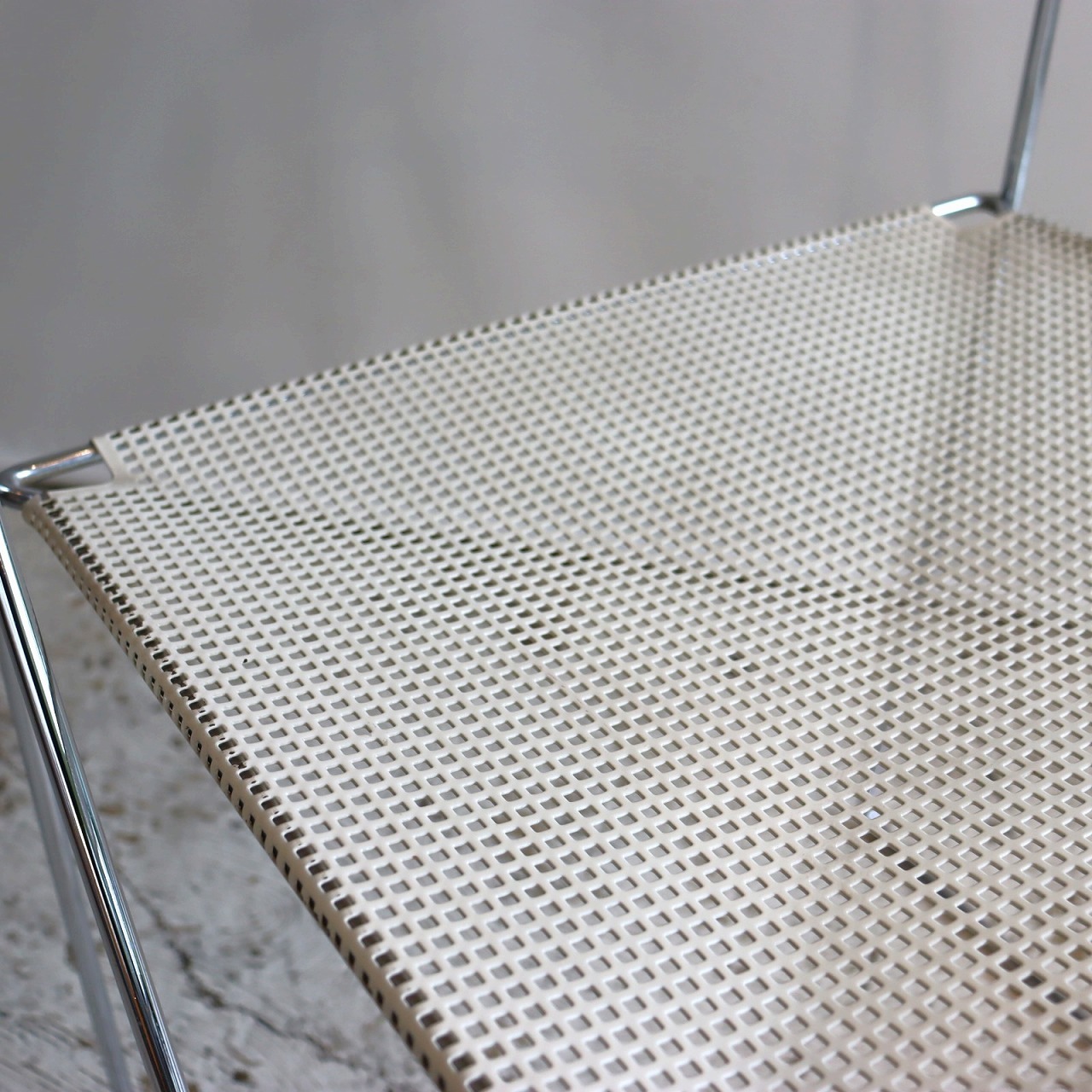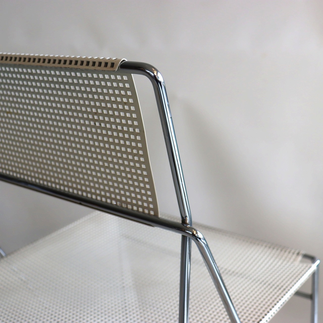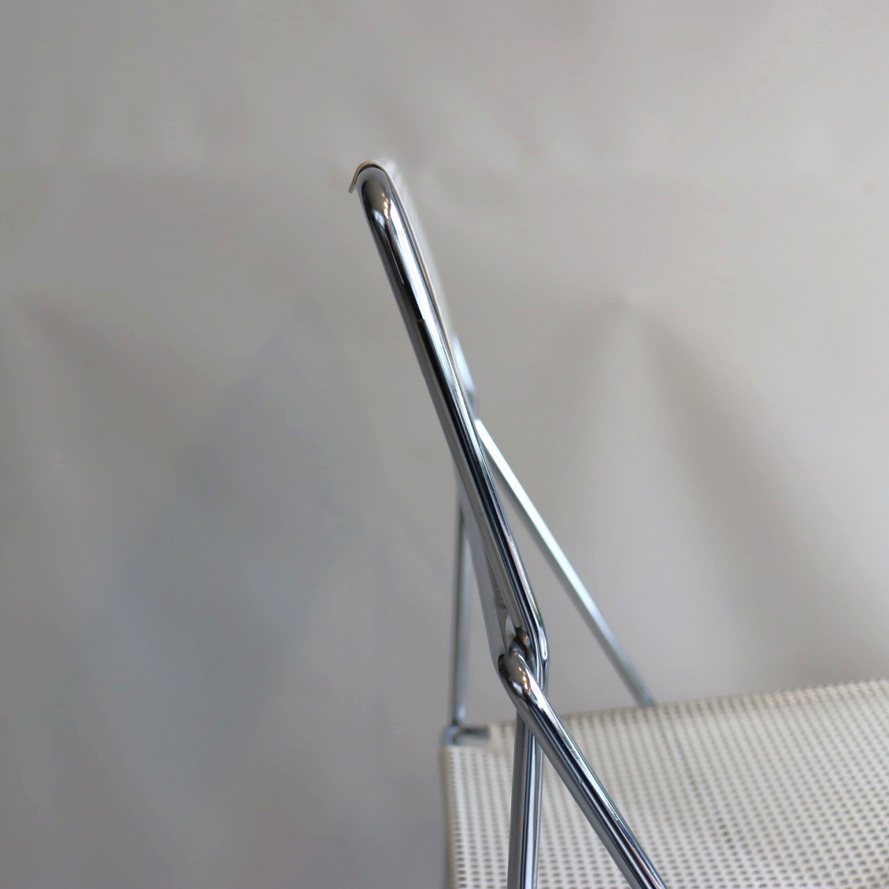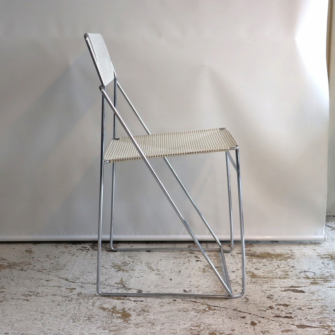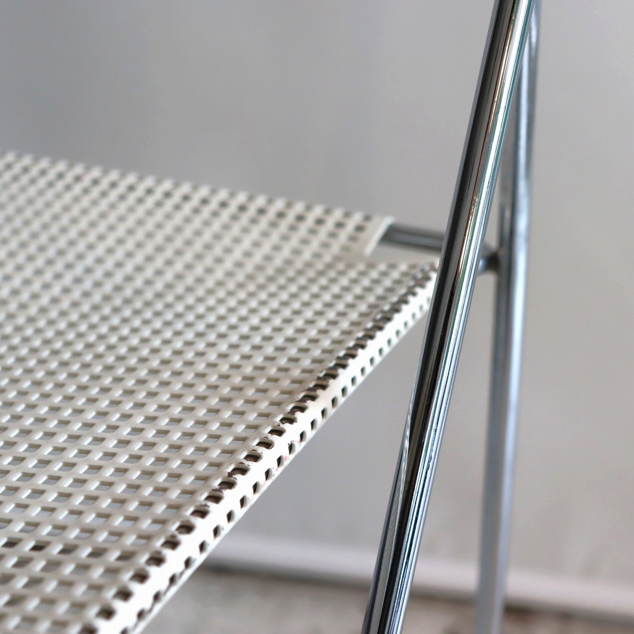 座面・背もたれの素材はスチール製。細い脚のクロスしたXの構造で強度を保ちながらも、パンチングの開けられた座面と背もたれがとても軽やかです。色はホワイト。とても爽やかな印象です。