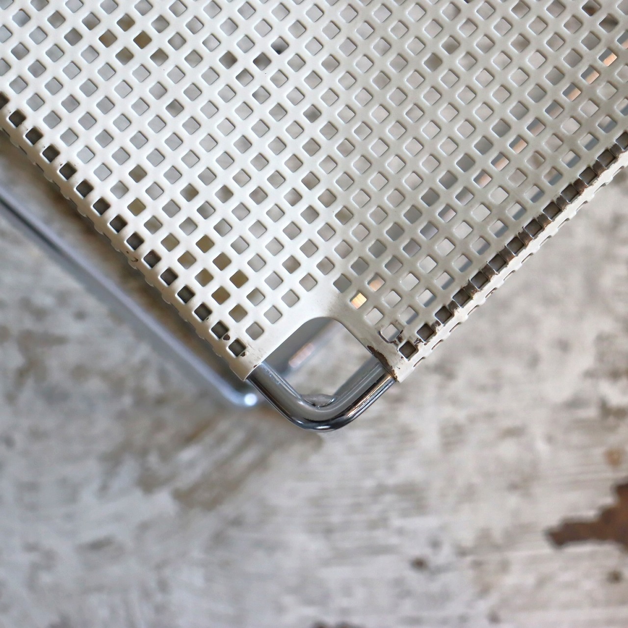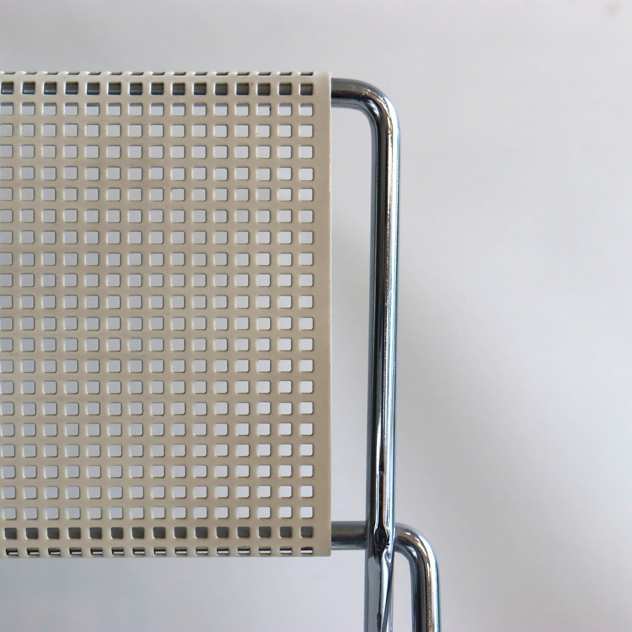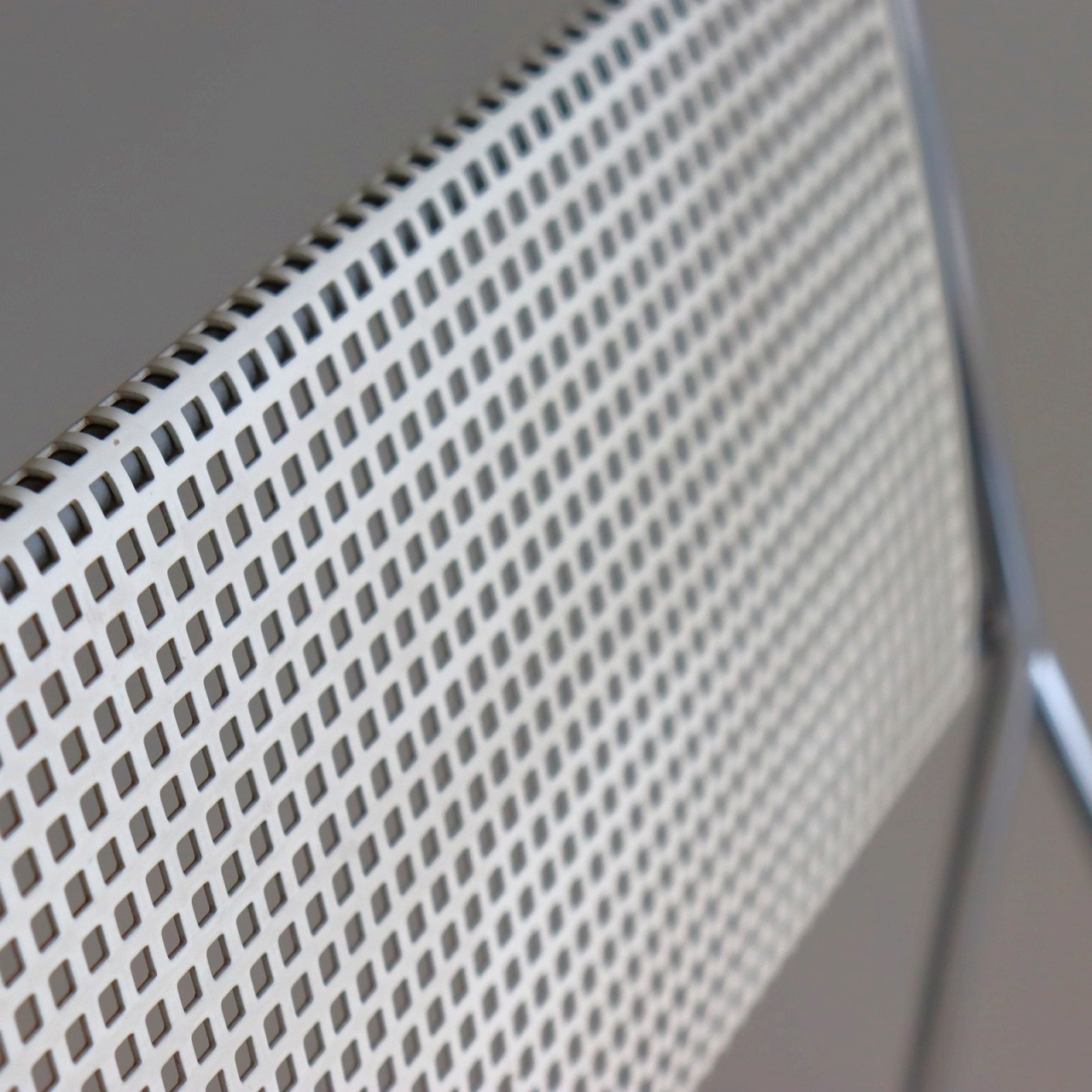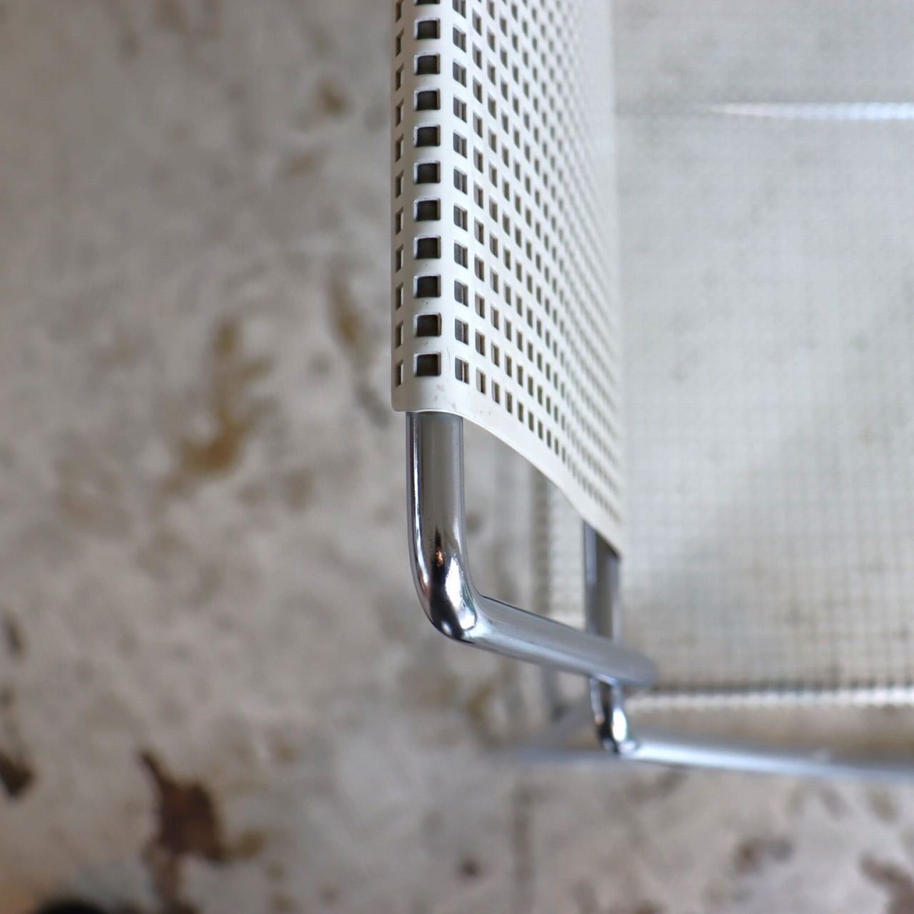 座面・背もたれの素材はスチール製。細い脚のクロスしたXの構造で強度を保ちながらも、パンチングの開けられた座面と背もたれがとても軽やかです。色はホワイト。とても爽やかな印象です。