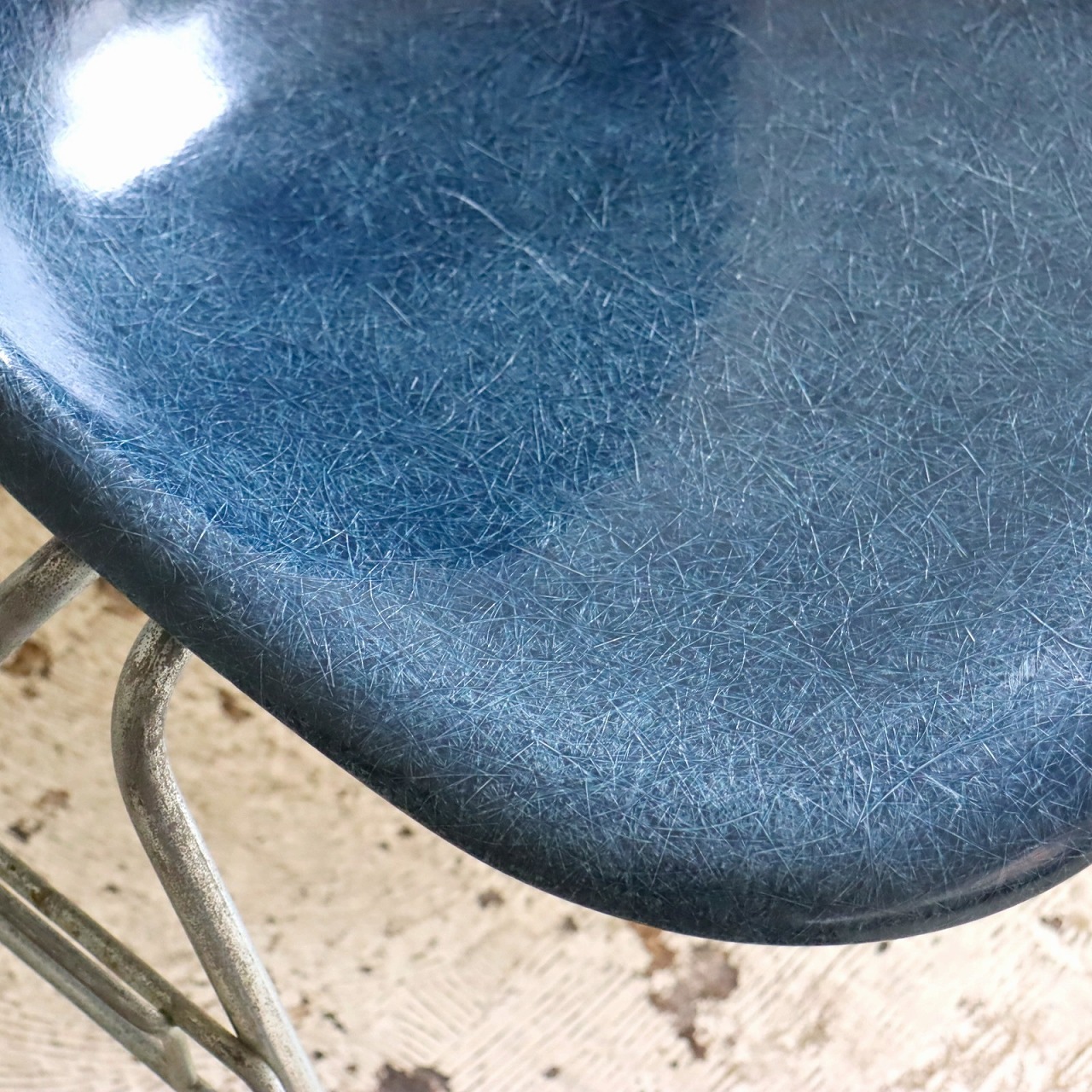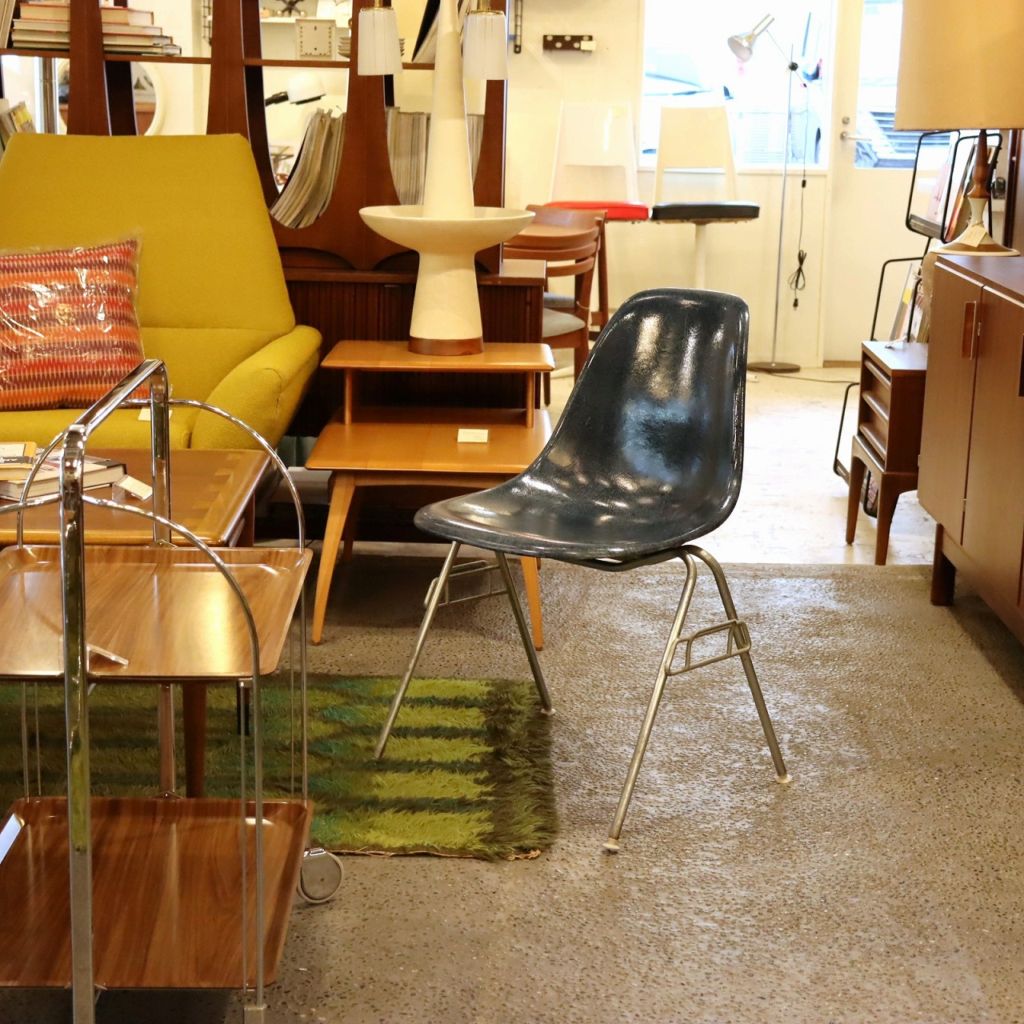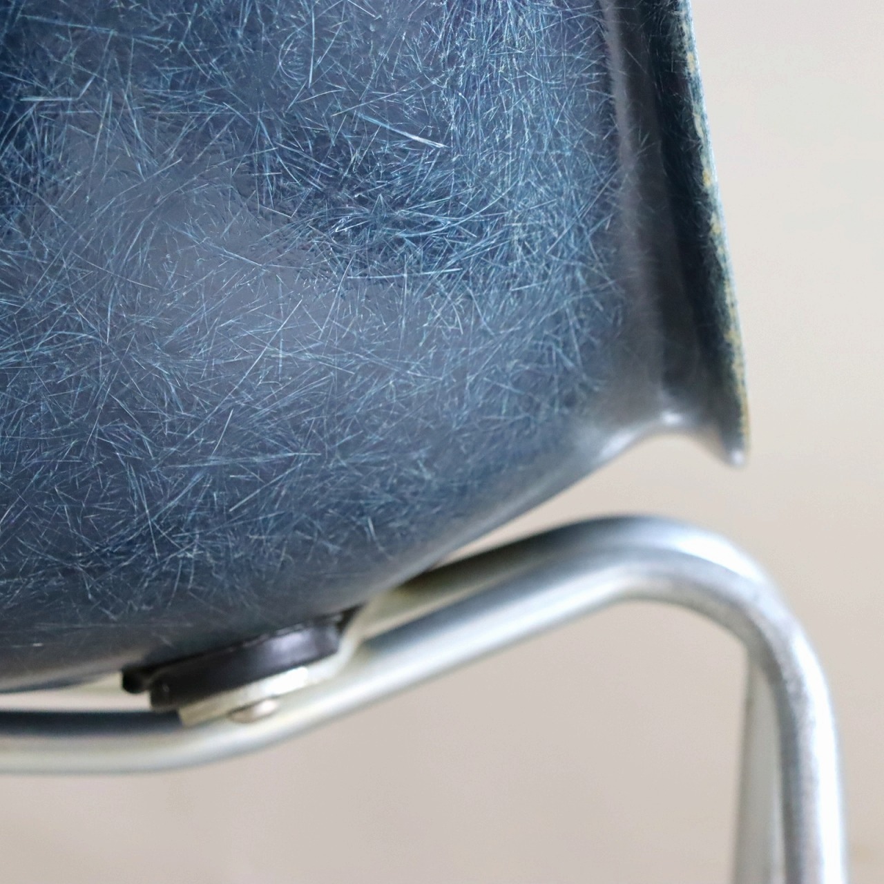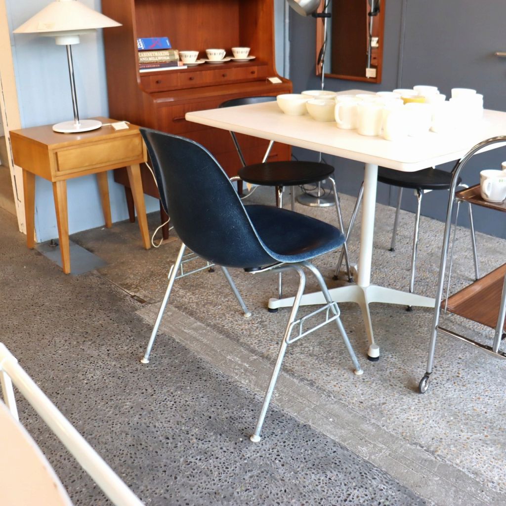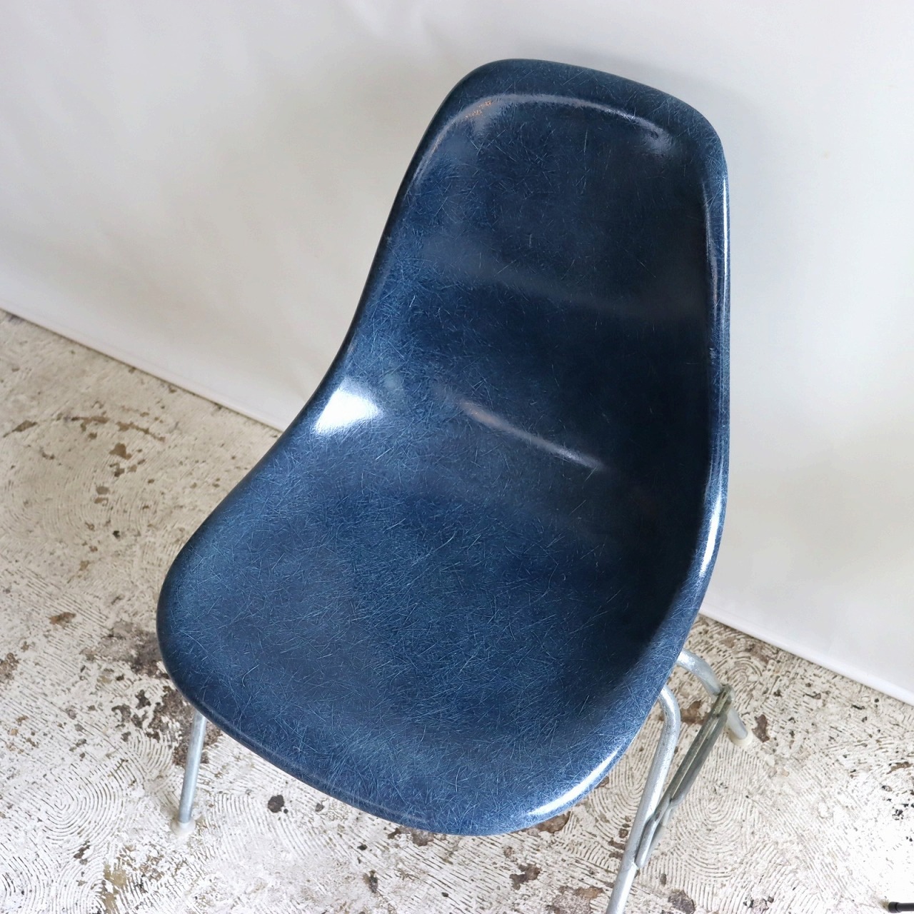 ハーマンミラー社製イームズ サイドシェルチェア。チャールズ・イームズデザインのビンテージチェア。FRP(ファイバーグラス)製のネイビー、ワイドマウントです。